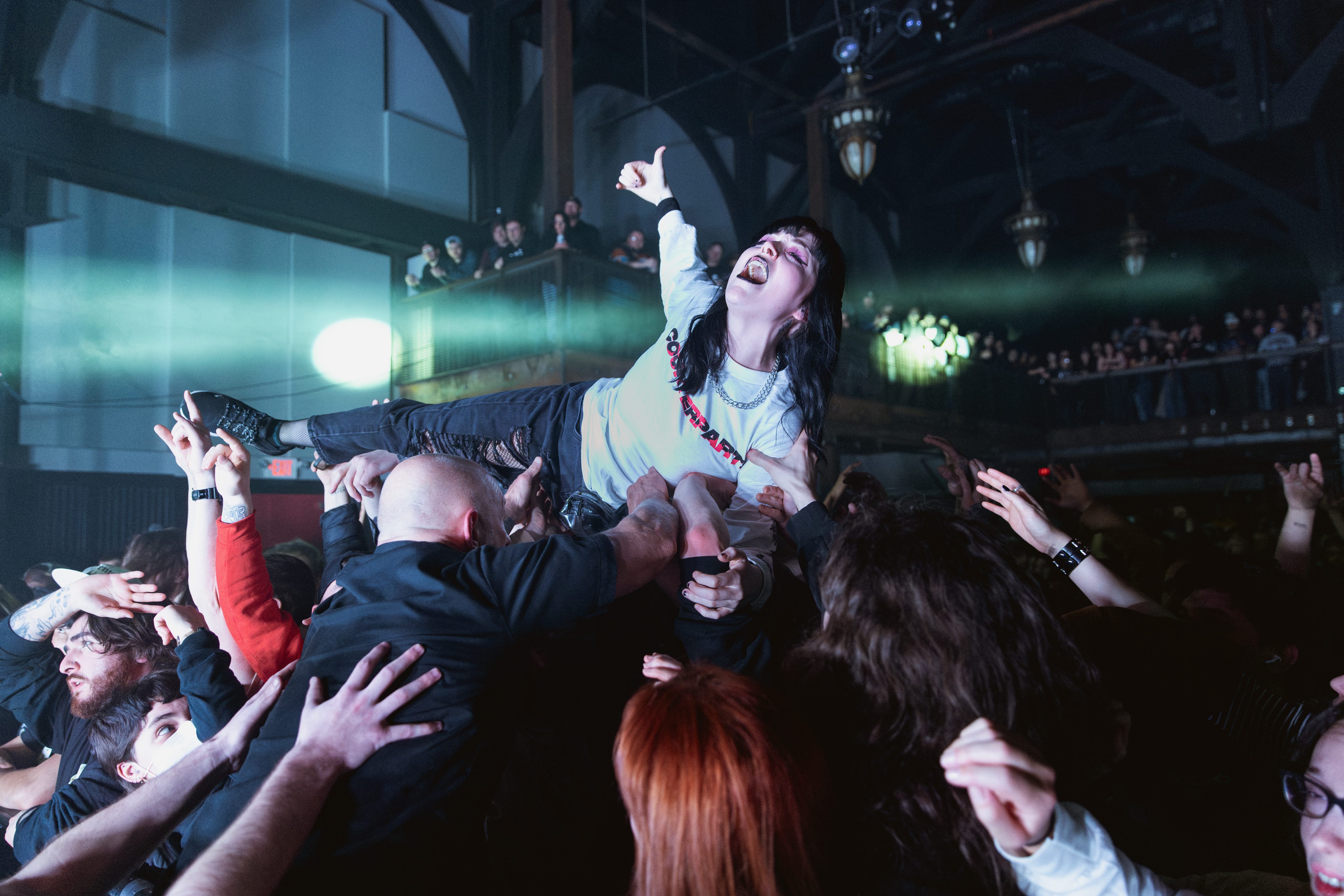 Upon entering the venue, fans were met with a display of all the merch for each band front and center, past that are the doors to the main hall for the stage. There’s a couple of different areas that you could choose from to get a view of the stage: you could be at the rail near the pit or, if you prefer to just watch, they have a balcony that wraps around the back of the venue.