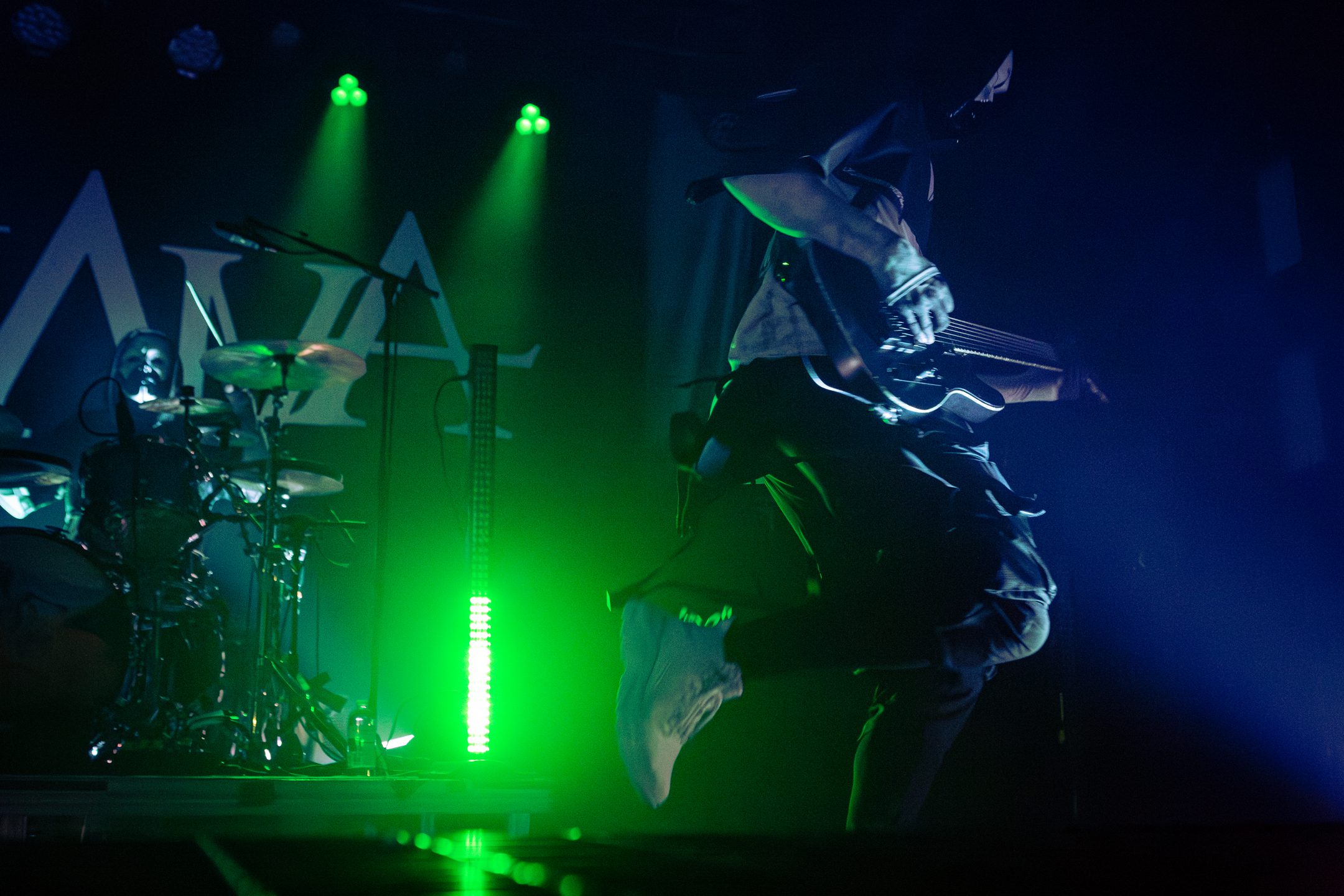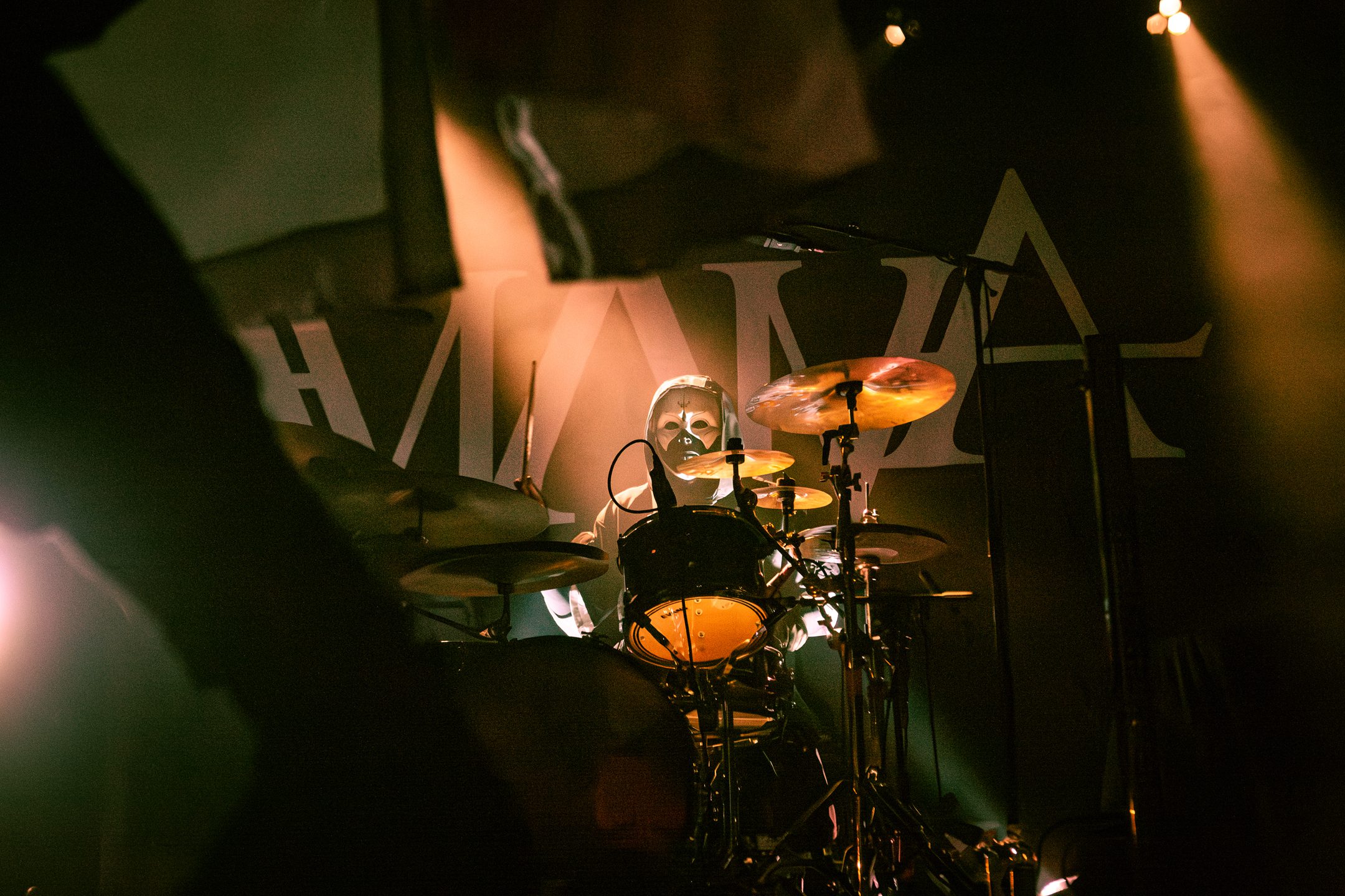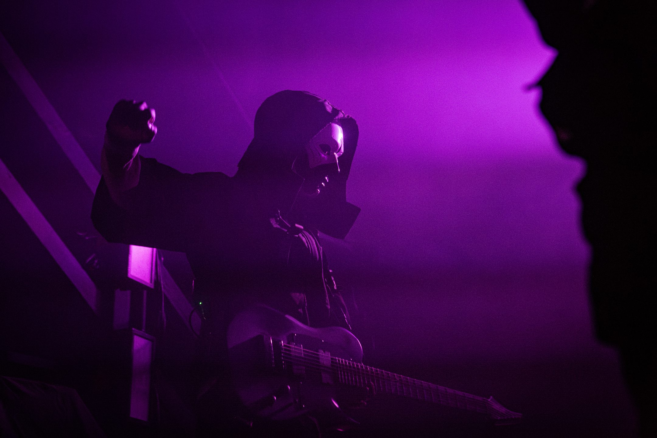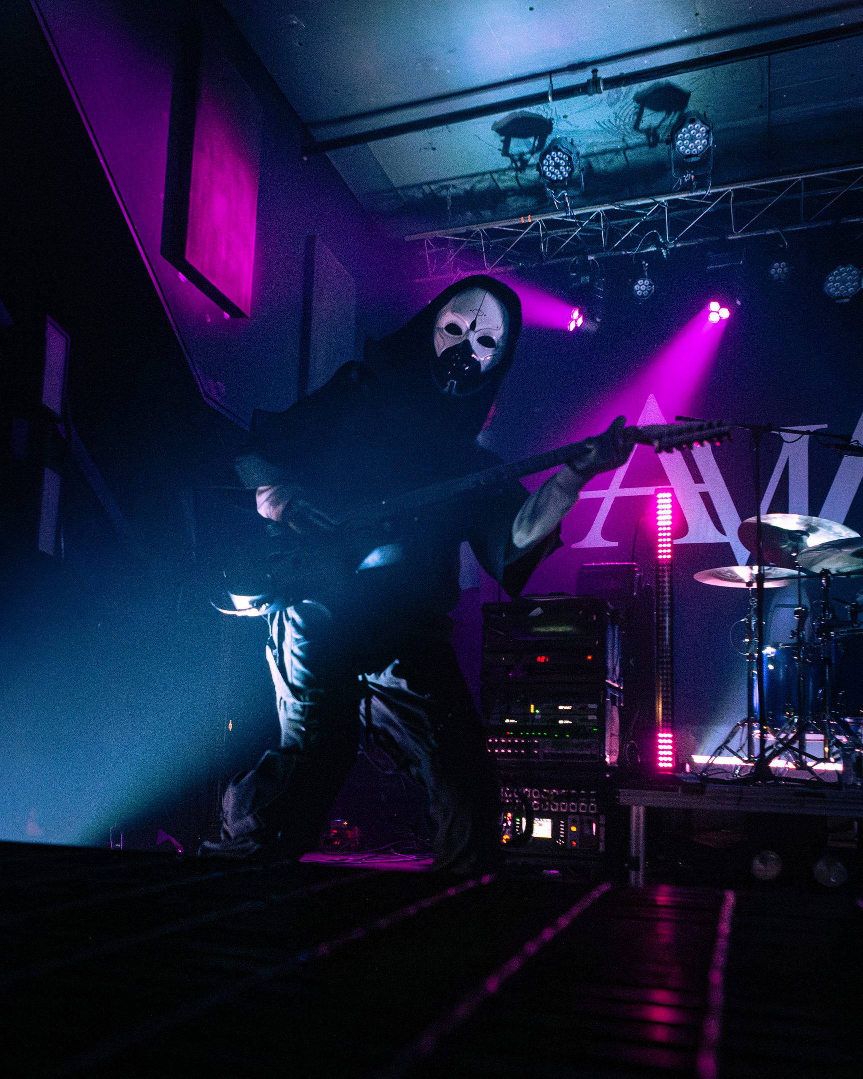 Next, Aviana commanded the stage with their distinct masked aesthetic. The guitarists spun in synchronicity and the drummer made eye contact with the crowd at various intervals, motioning and encouraging them to get off their feet in time with the beat. Vocalist Joel Holmqvist donned a white trench coat which swayed and twirled around him as he jumped around the stage.