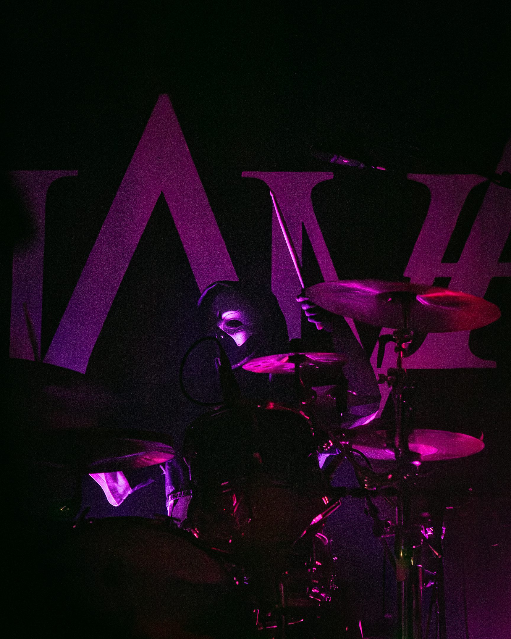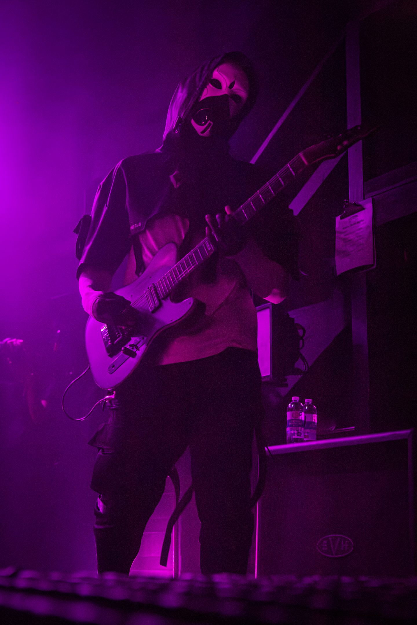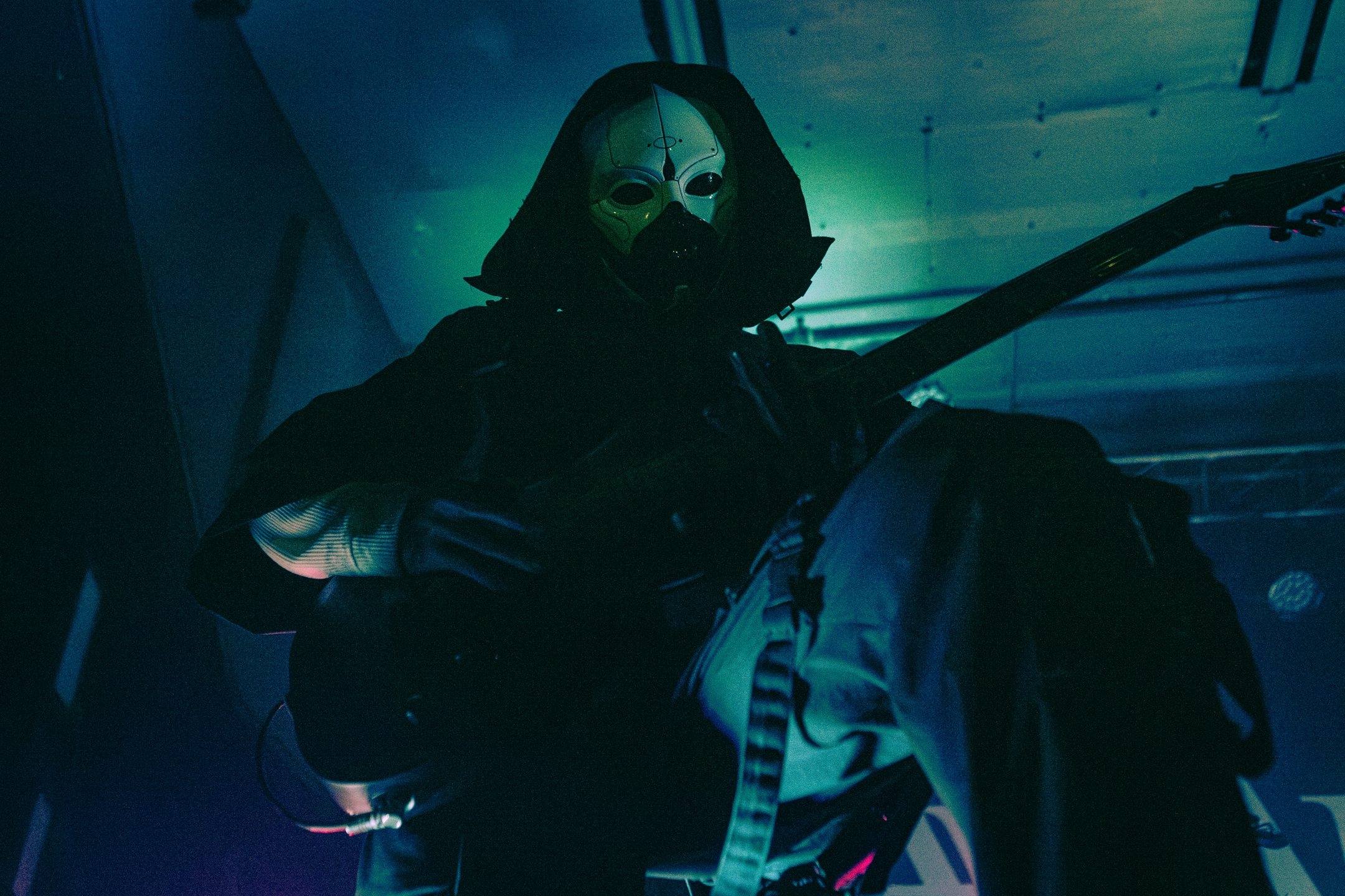 Next, Aviana commanded the stage with their distinct masked aesthetic. The guitarists spun in synchronicity and the drummer made eye contact with the crowd at various intervals, motioning and encouraging them to get off their feet in time with the beat. Vocalist Joel Holmqvist donned a white trench coat which swayed and twirled around him as he jumped around the stage.