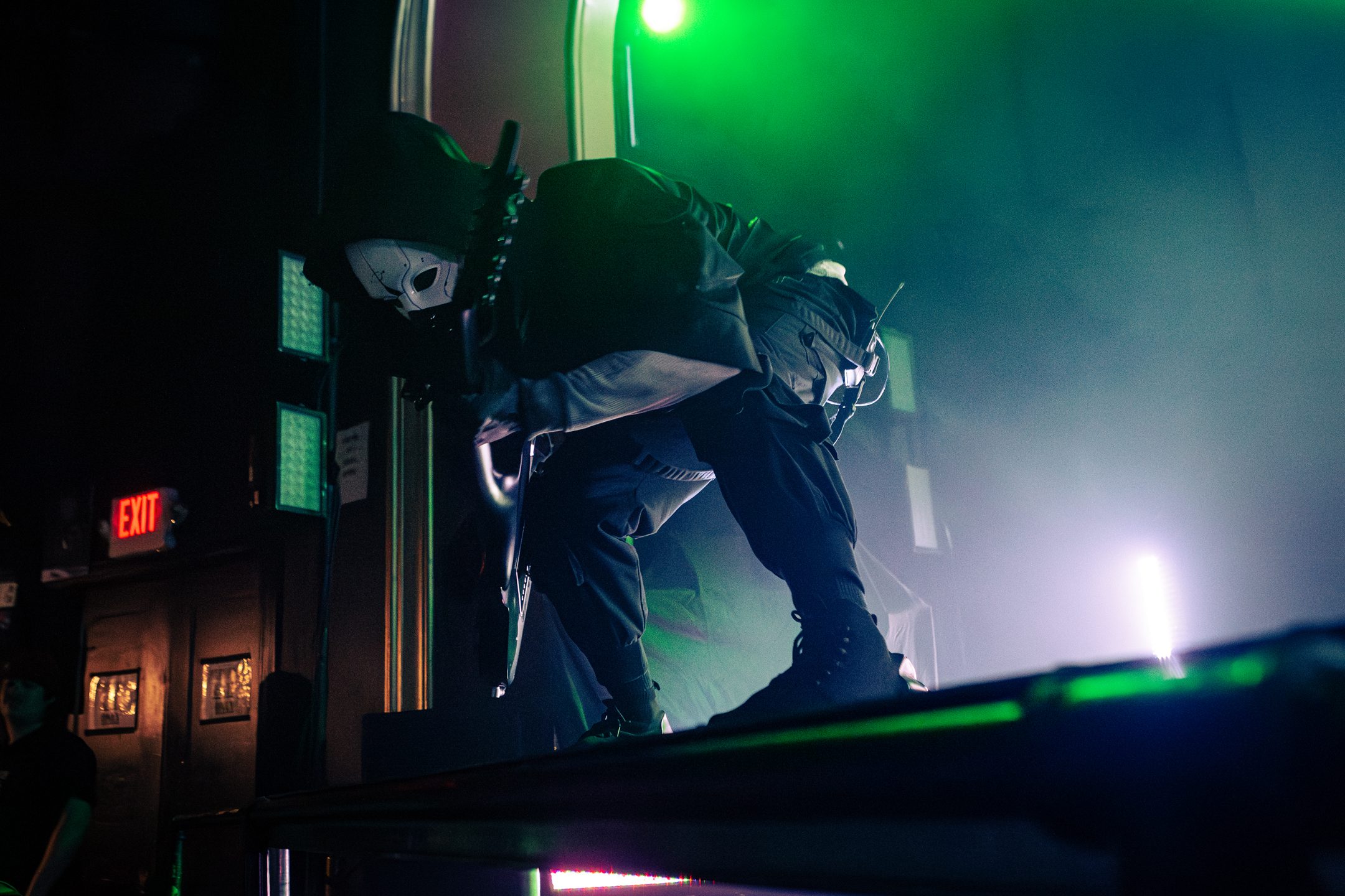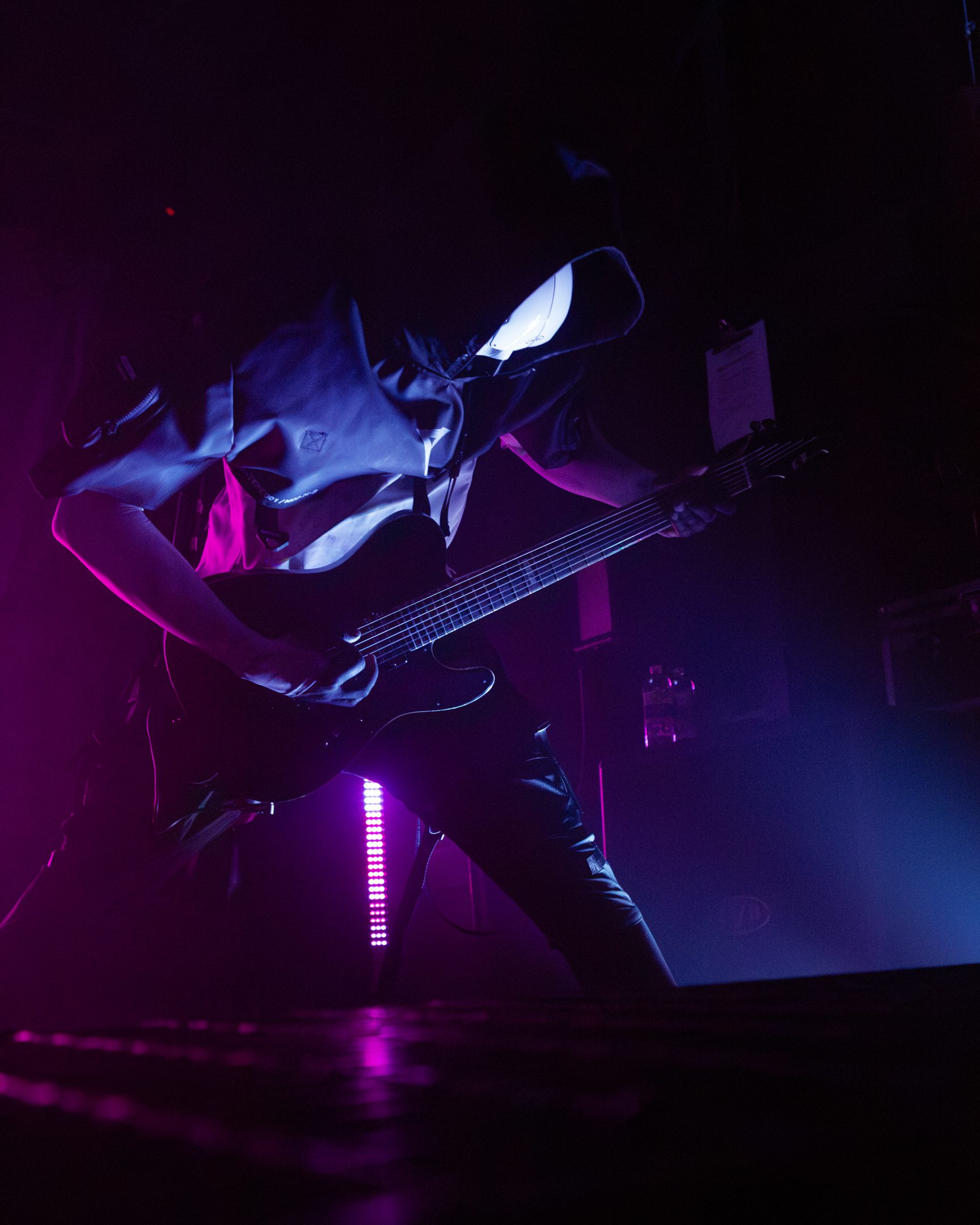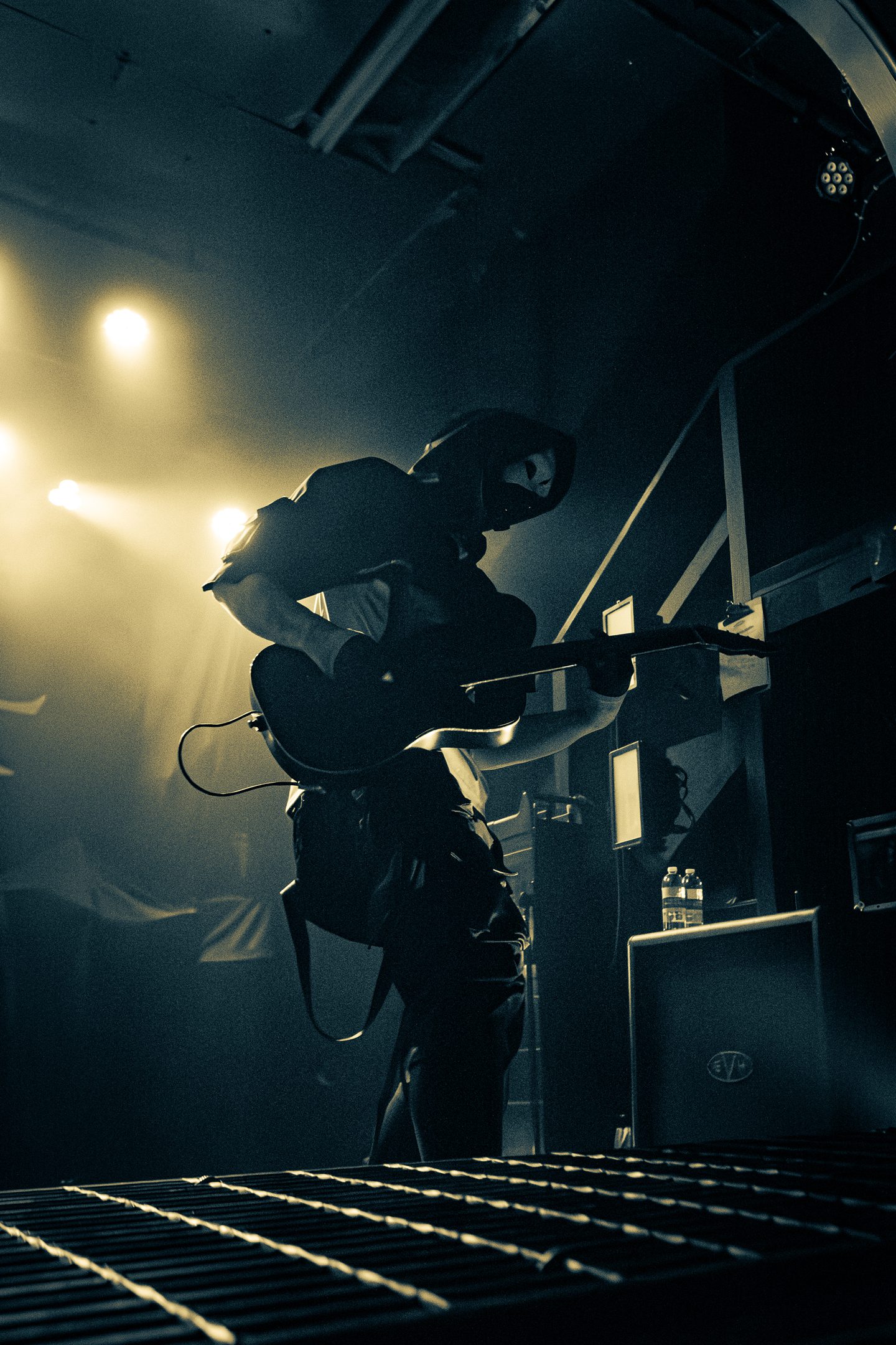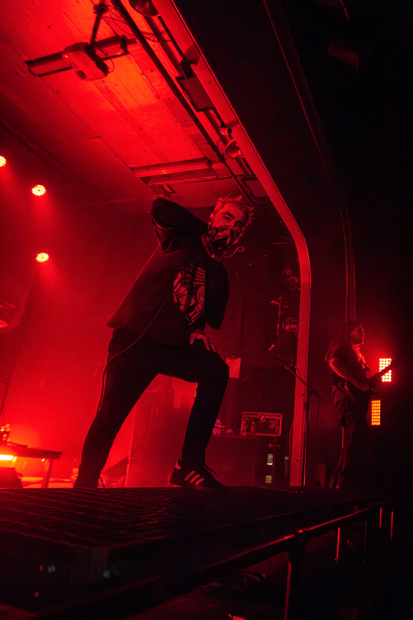 Next, Aviana commanded the stage with their distinct masked aesthetic. The guitarists spun in synchronicity and the drummer made eye contact with the crowd at various intervals, motioning and encouraging them to get off their feet in time with the beat. Vocalist Joel Holmqvist donned a white trench coat which swayed and twirled around him as he jumped around the stage.