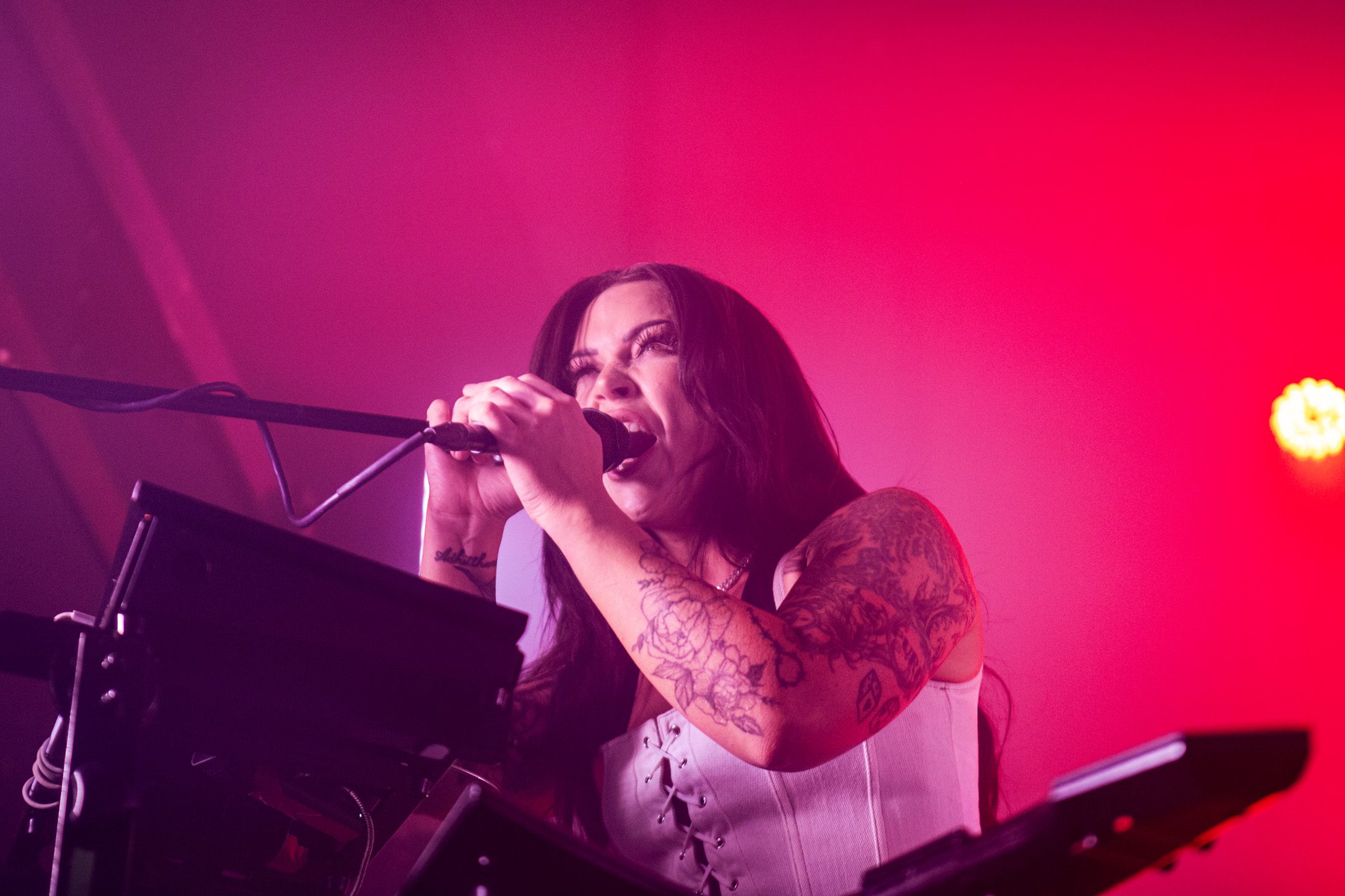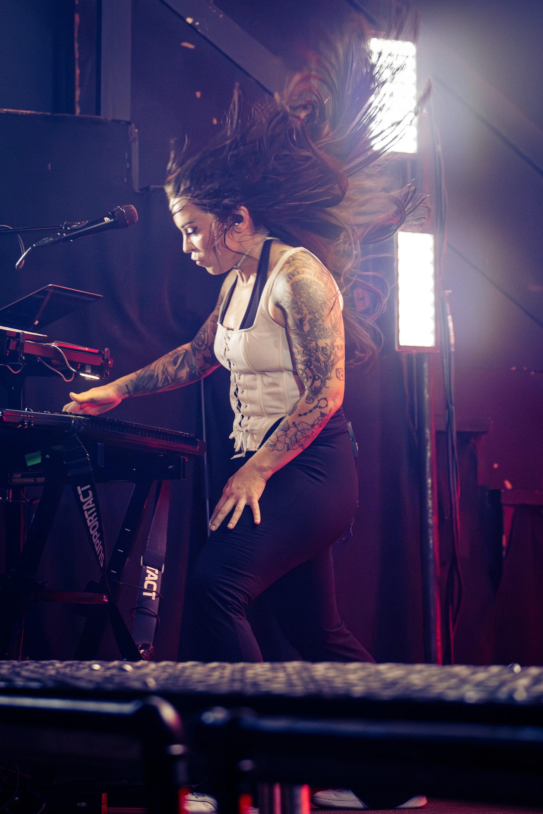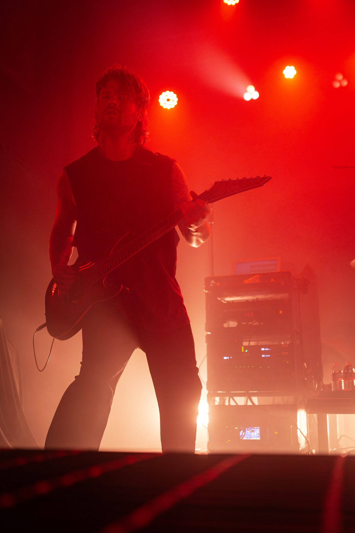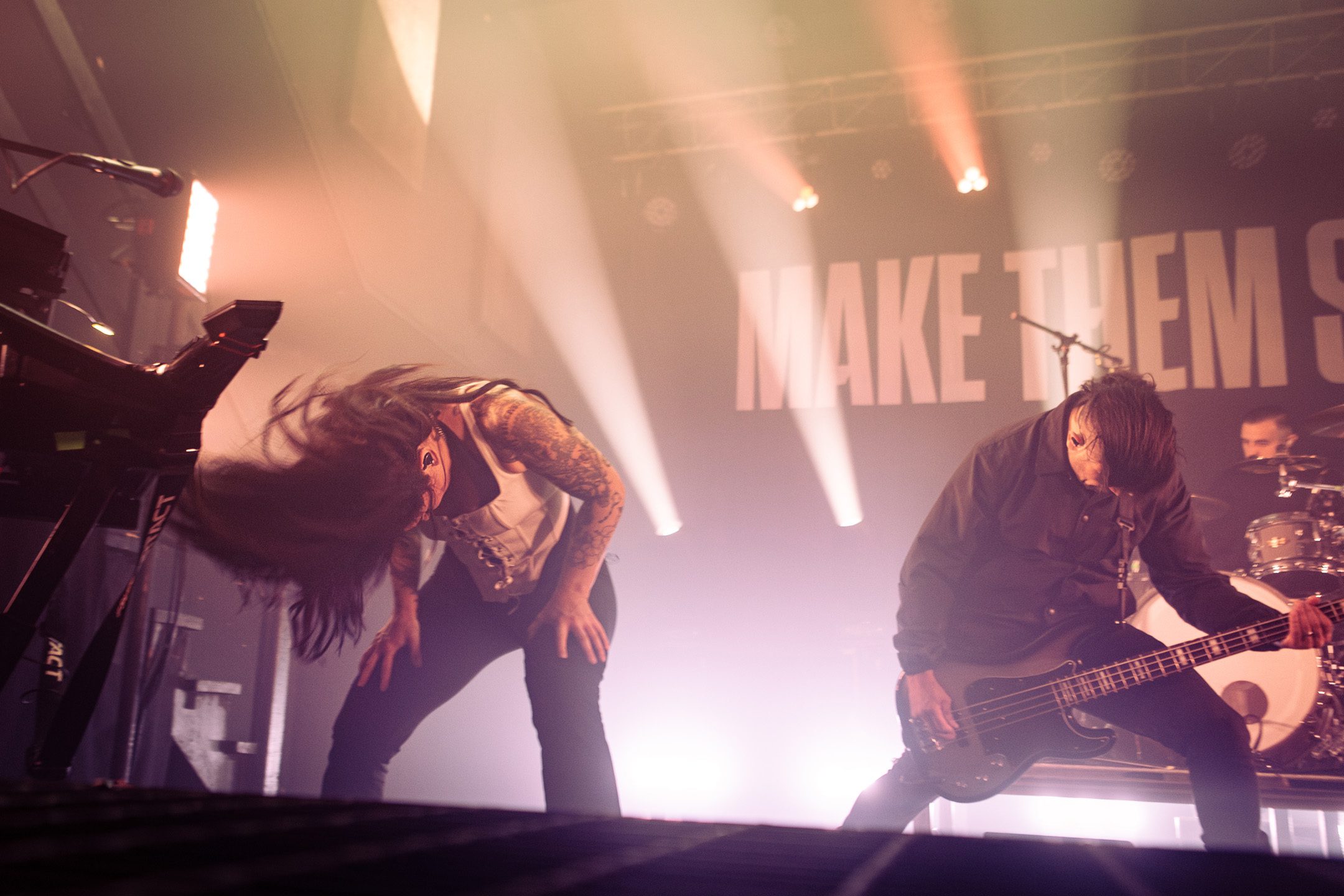 There wasn’t a calm moment of the evening, with Make Them Suffer barely pausing to catch their breath between songs. Vocalist Sean Hermanis frequently two-stepped on stage, while keyboardist and backing vocalist Alex Reade did her signature hair flips and whips, as guitarist Nick McLernon wowed with his high jumps.