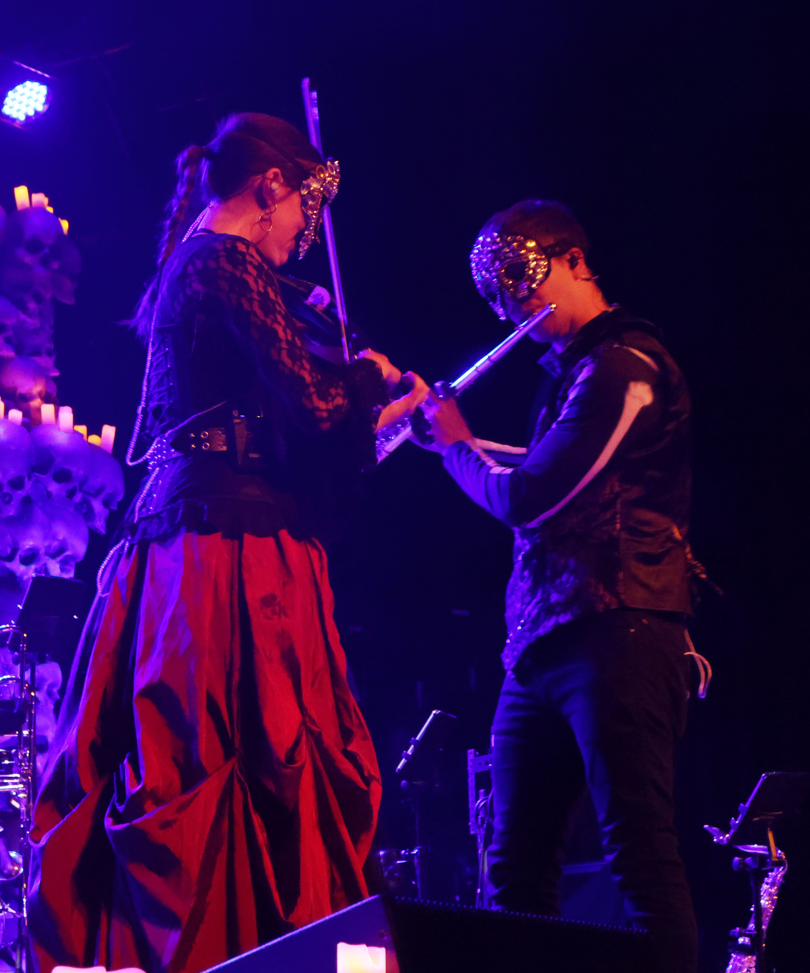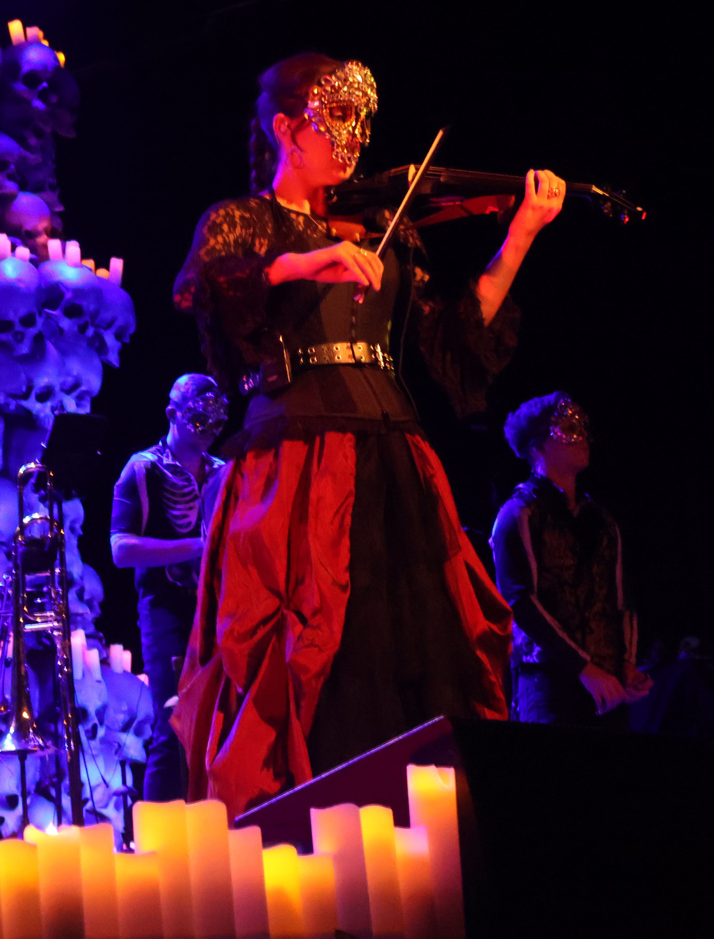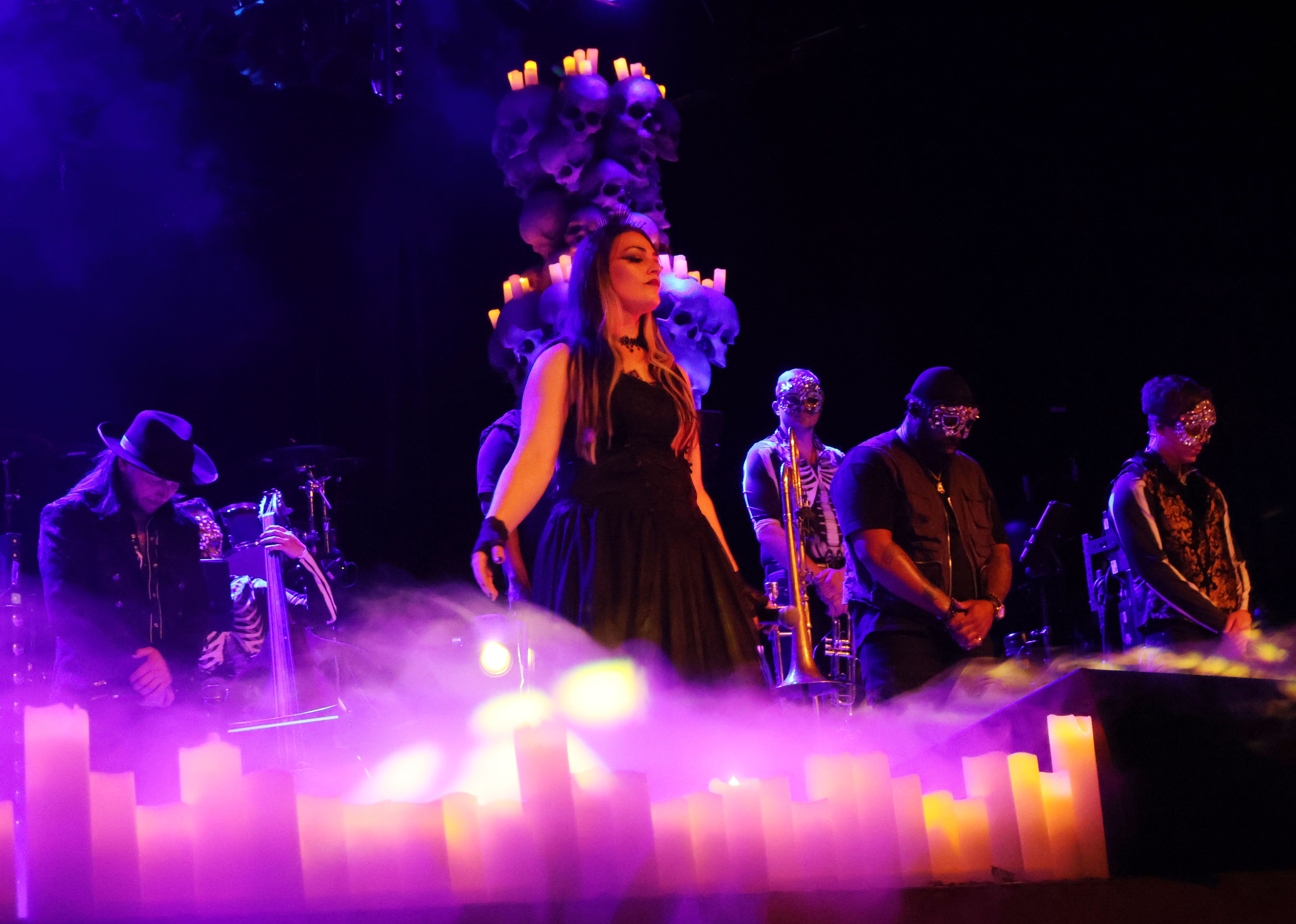 As concertgoers filed into the Kiva, not quite sure what to expect, they were met with a damatic stage design: thousands of candles lit the space, two floor-to-ceiling stacked skulls pillars flanked the stage, and a massive skull in the middle hovered from the ceiling behind the drum set and keyboards. At each front corner sat oversized skulls with candles on their heads. Before the performance, there was a steady flow of people running down to the stage to capture selfies in front of the red and yellow stage lights.