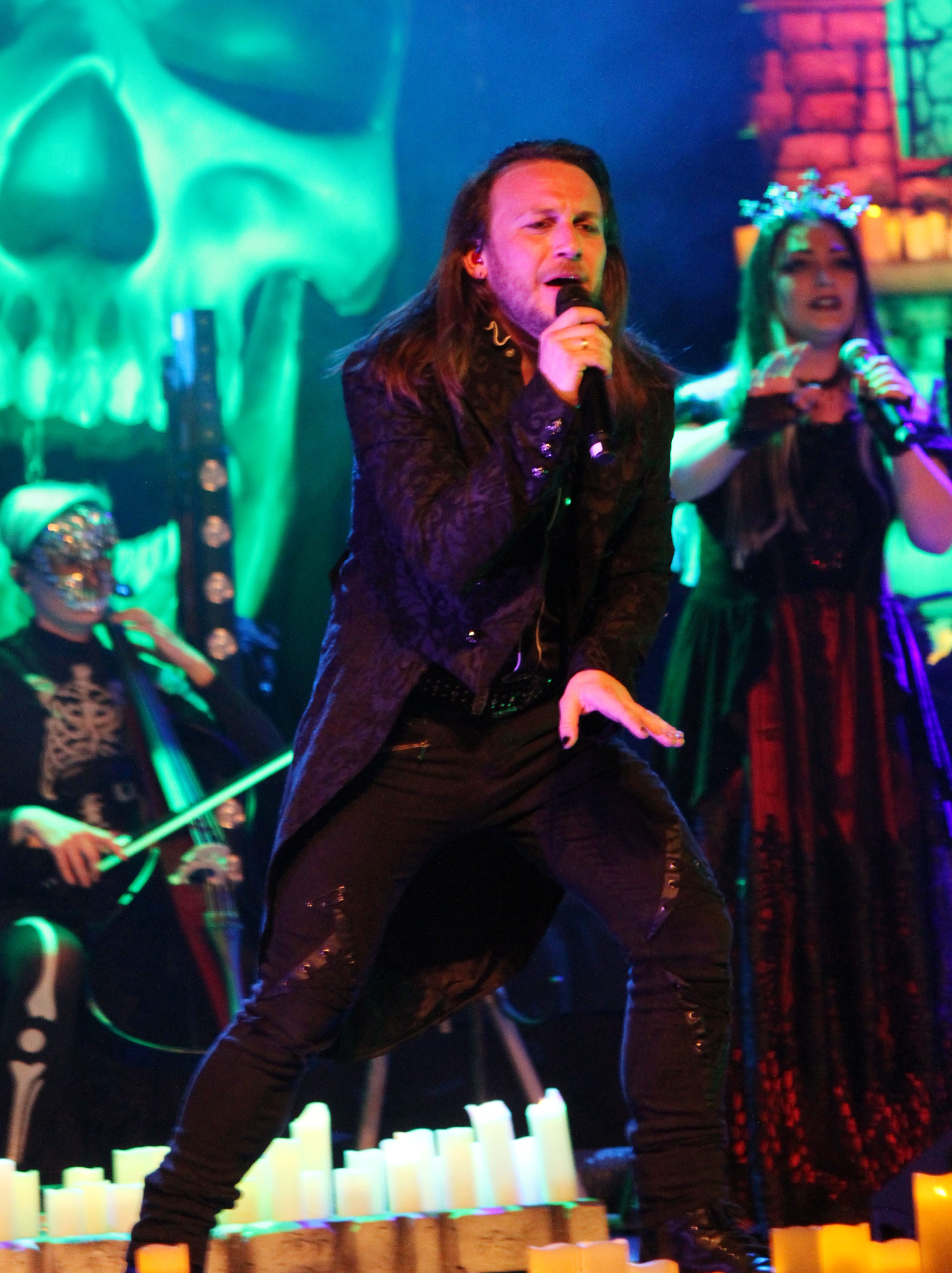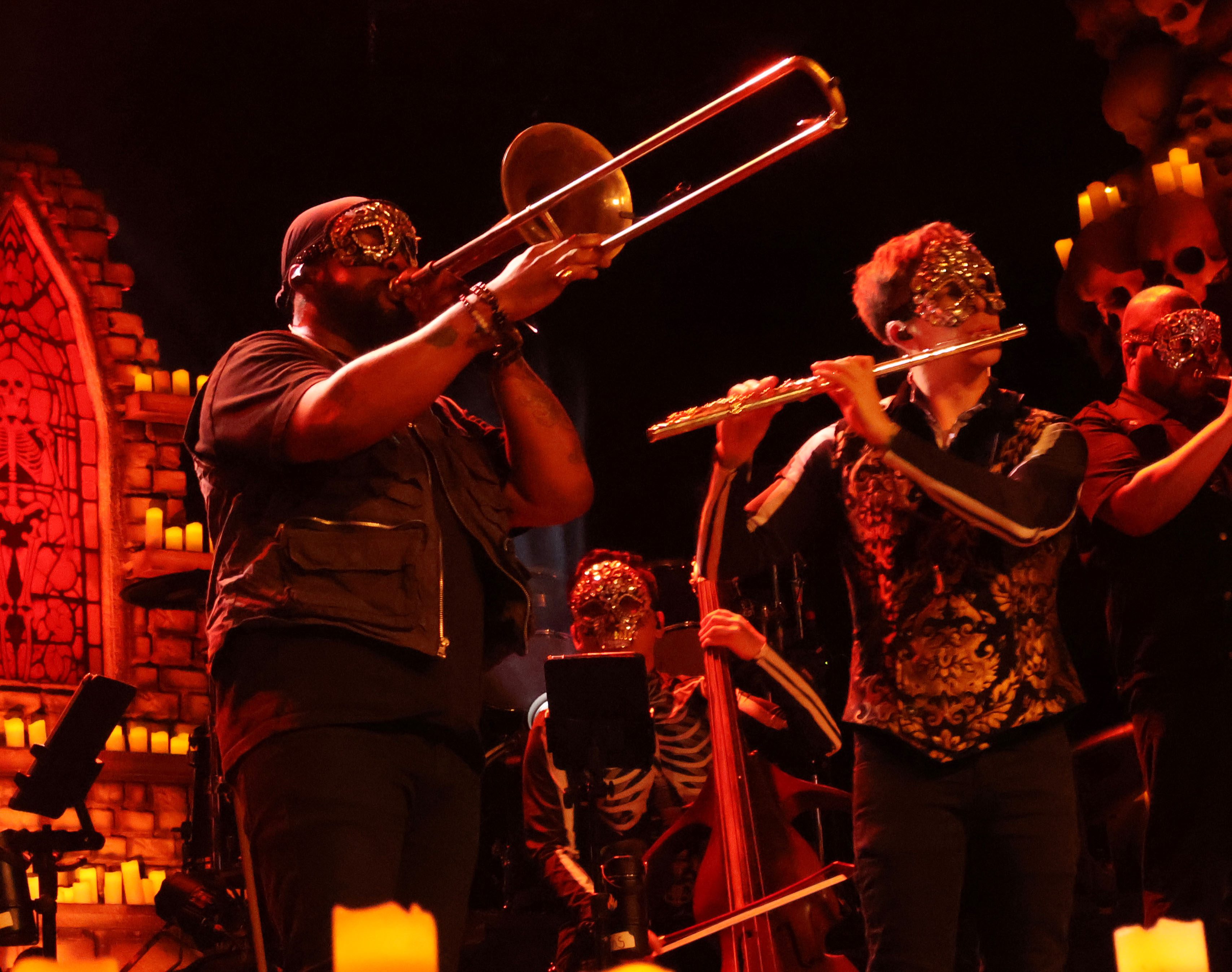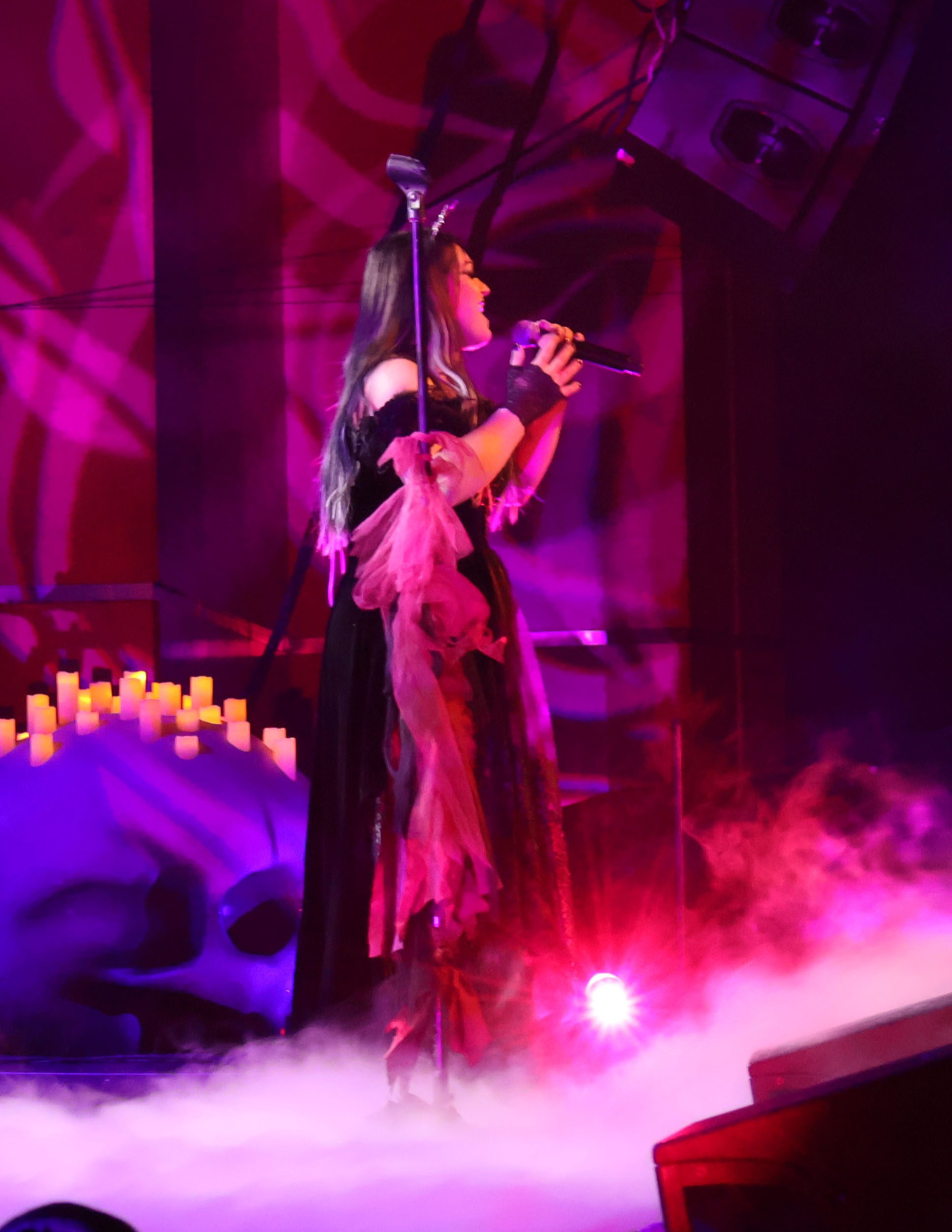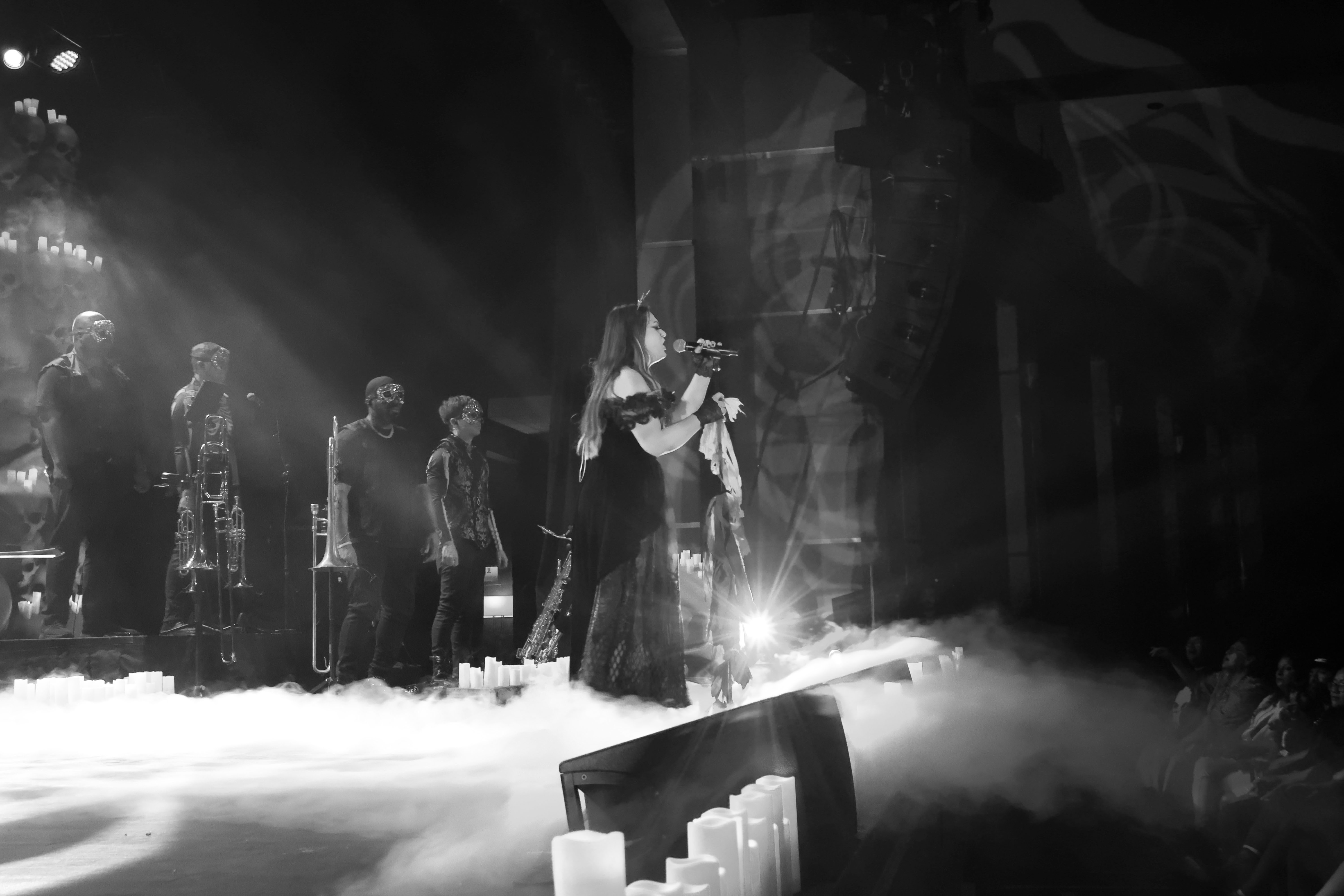 As concertgoers filed into the Kiva, not quite sure what to expect, they were met with a damatic stage design: thousands of candles lit the space, two floor-to-ceiling stacked skulls pillars flanked the stage, and a massive skull in the middle hovered from the ceiling behind the drum set and keyboards. At each front corner sat oversized skulls with candles on their heads. Before the performance, there was a steady flow of people running down to the stage to capture selfies in front of the red and yellow stage lights.