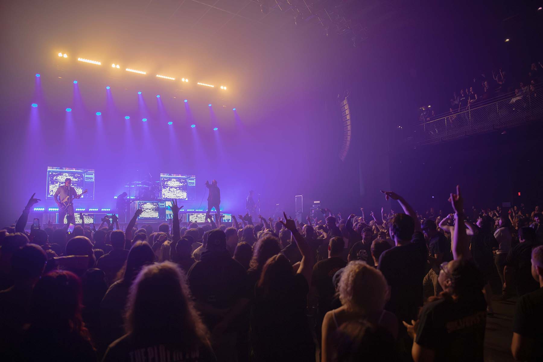 After their set, the room was filling in even more for the main act, Silverstein. The energy levels grew just as the anticipation did. It was empty briefly as people took bar, bathroom, and merch breaks. I even watched a group play a short game of duck, duck, goose which was cute. As the lights dimmed, the room erupted into cheers. The screens on stage lit up as video intros played, and phones were out to record this special montage. Then the band took the stage, and the music kicked in. The crowd went nuts. People sang and waved their hands around. The band was singing and dancing all about the stage. Vocalist Shane Told told us that the night was a time to celebrate 25 years in the making, and they were going to play at least one song from every album. Each new album play was introduced with a new montage on the screens. It was so cool.