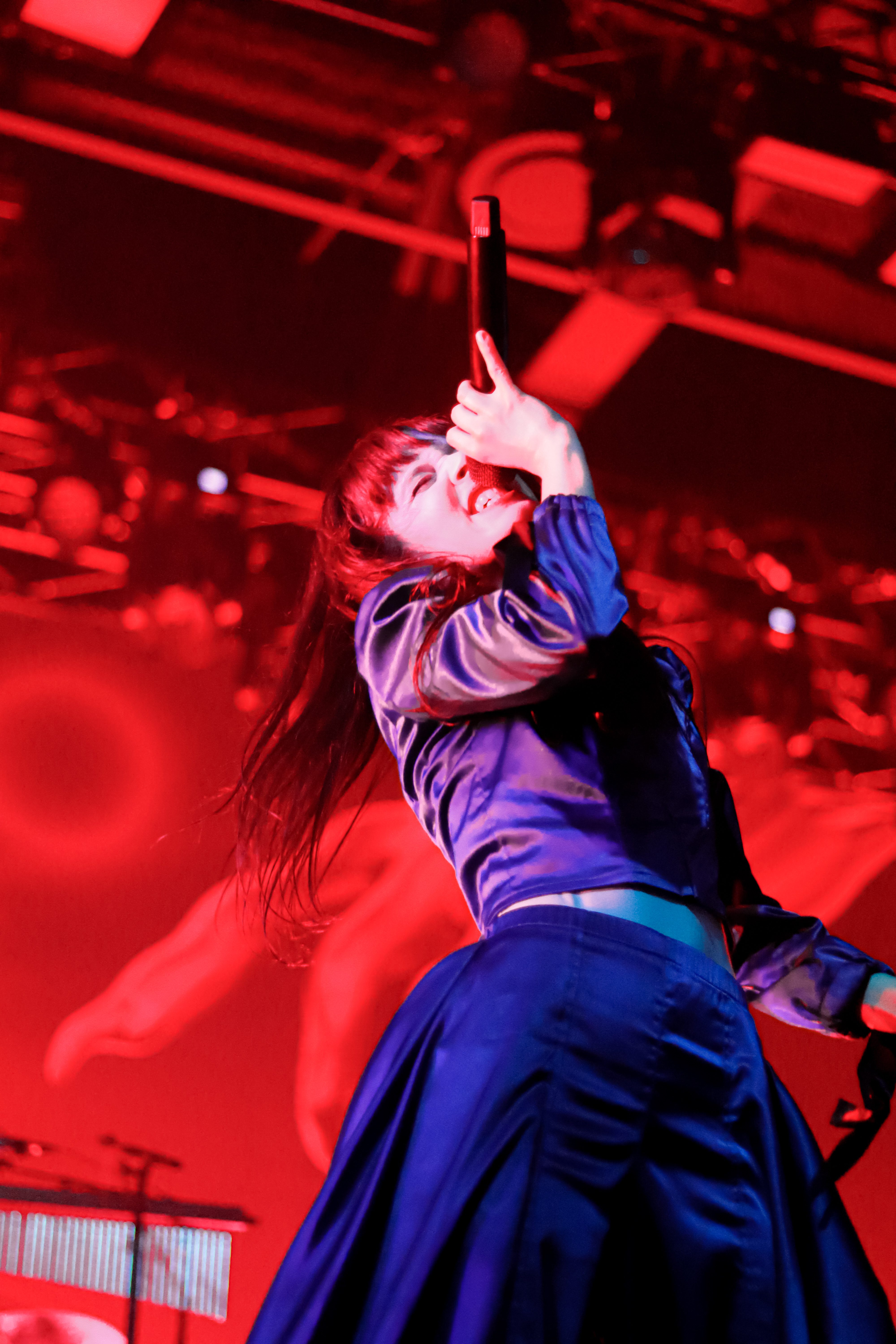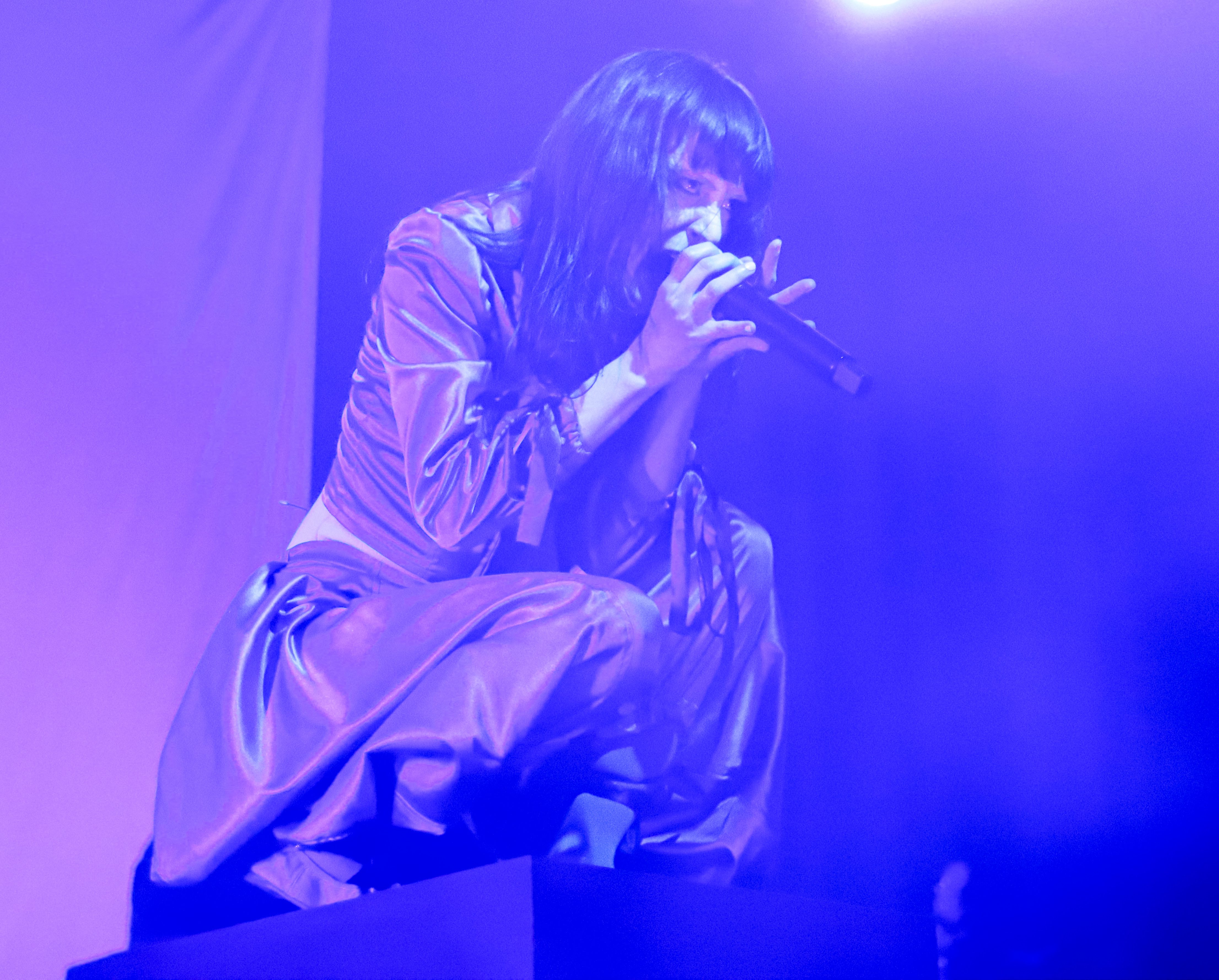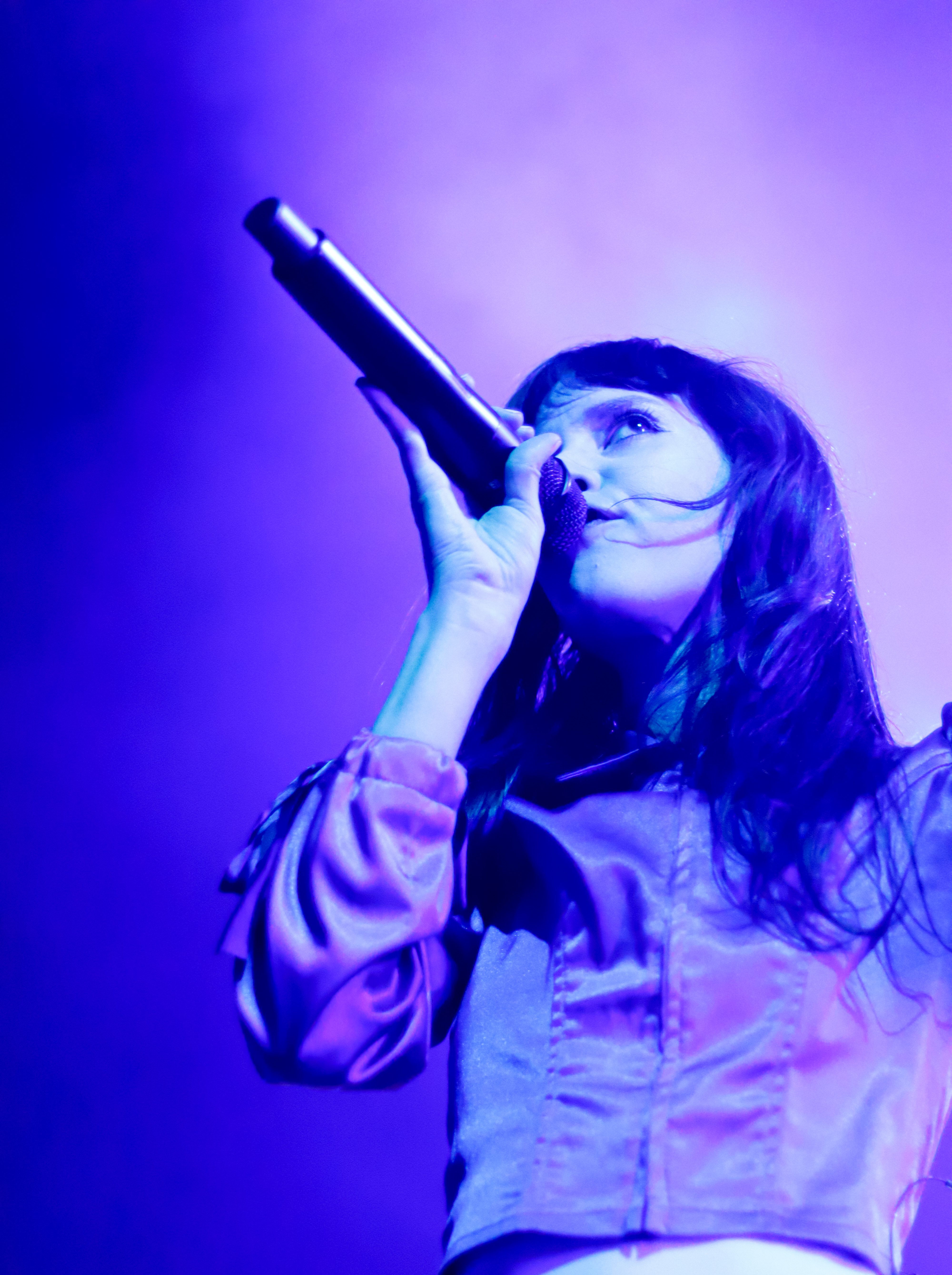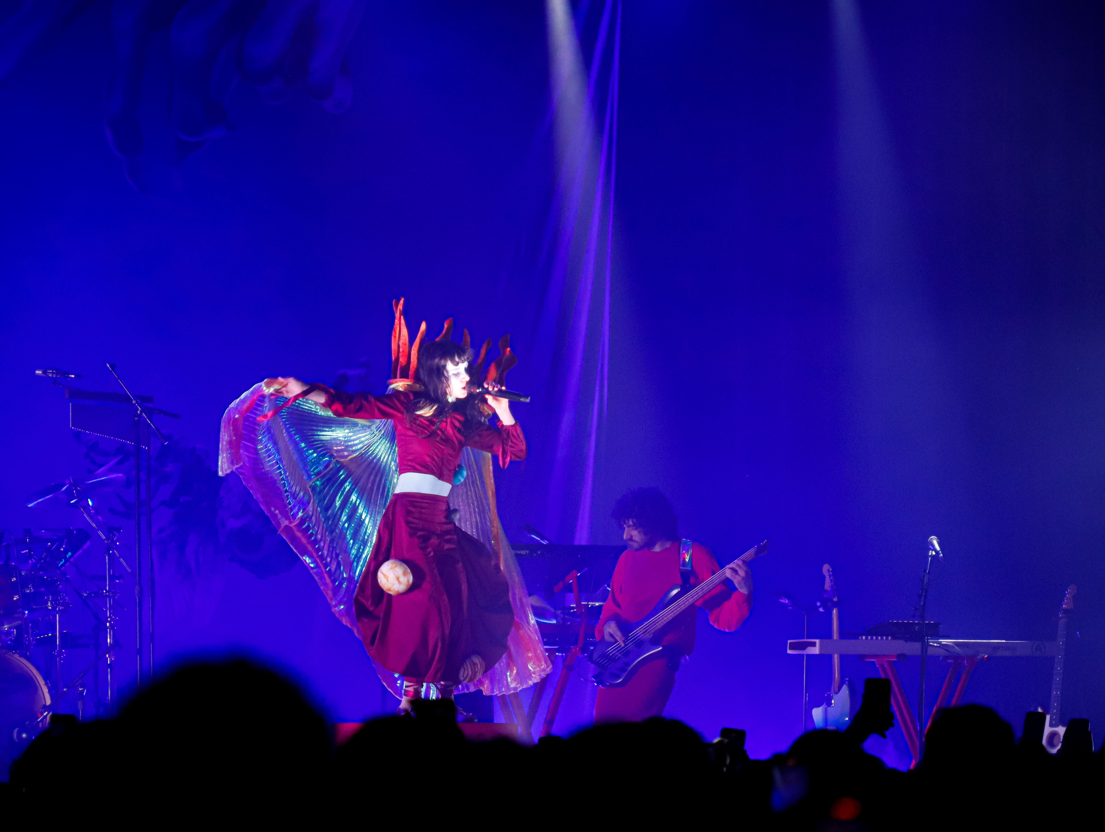 Magdalena Bay, a synth-pop duo, came out onto the stage at 9:00 p.m., and all you could hear were screams of excitement as they started their set off with “She Looked Like Me!,” which is also the first song on their newest album Imaginal Disk, which was released in August 2024. Throughout the entirety of their set, she had a few costume changes. Her initial outfit was a beautiful satin blue two-piece suit with puffy pants, and the top half of her face covered in baby blue face paint. Other outfits she wore included a sunflower headpiece, a cape with a fire design around her head, and an angel costume.