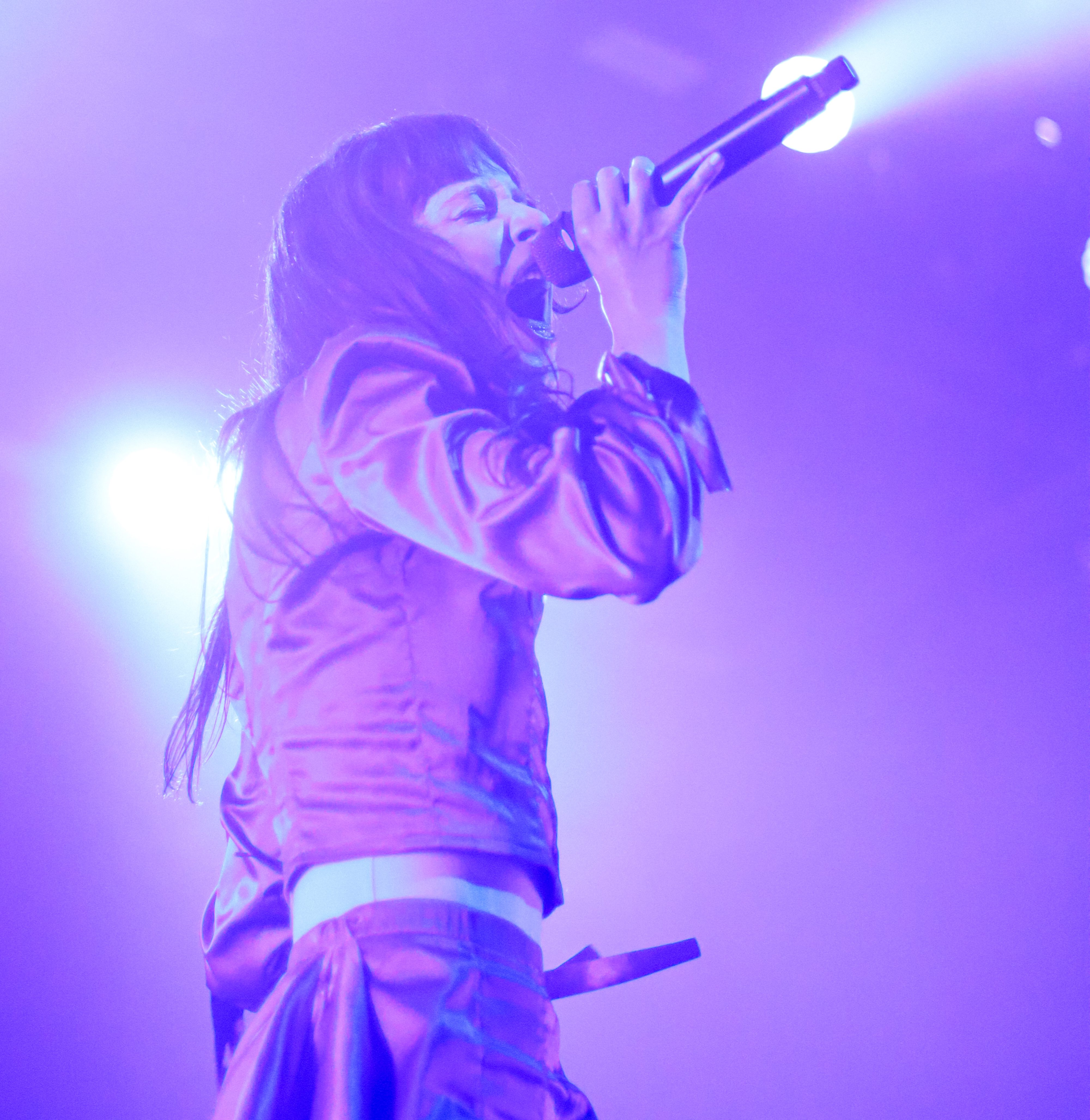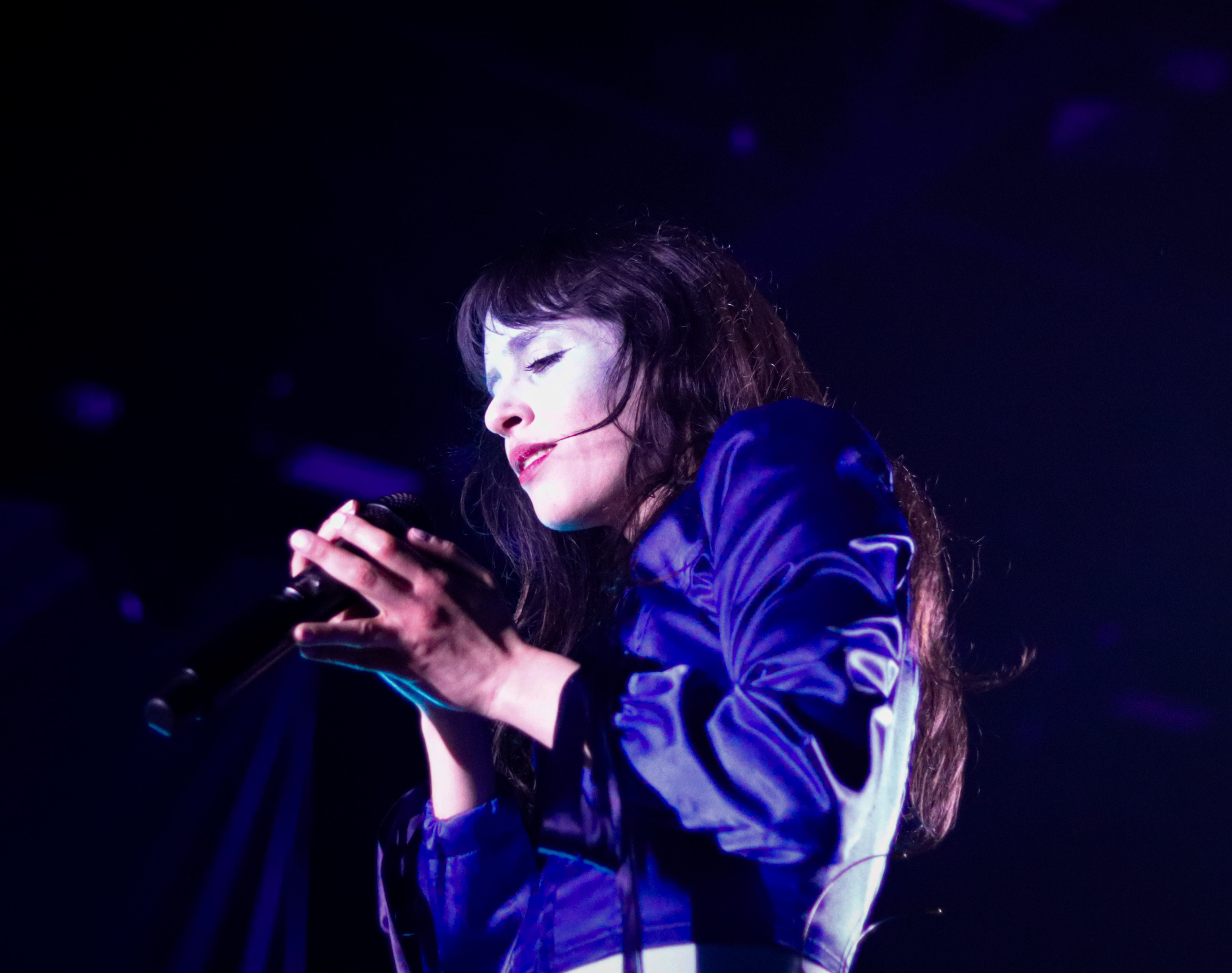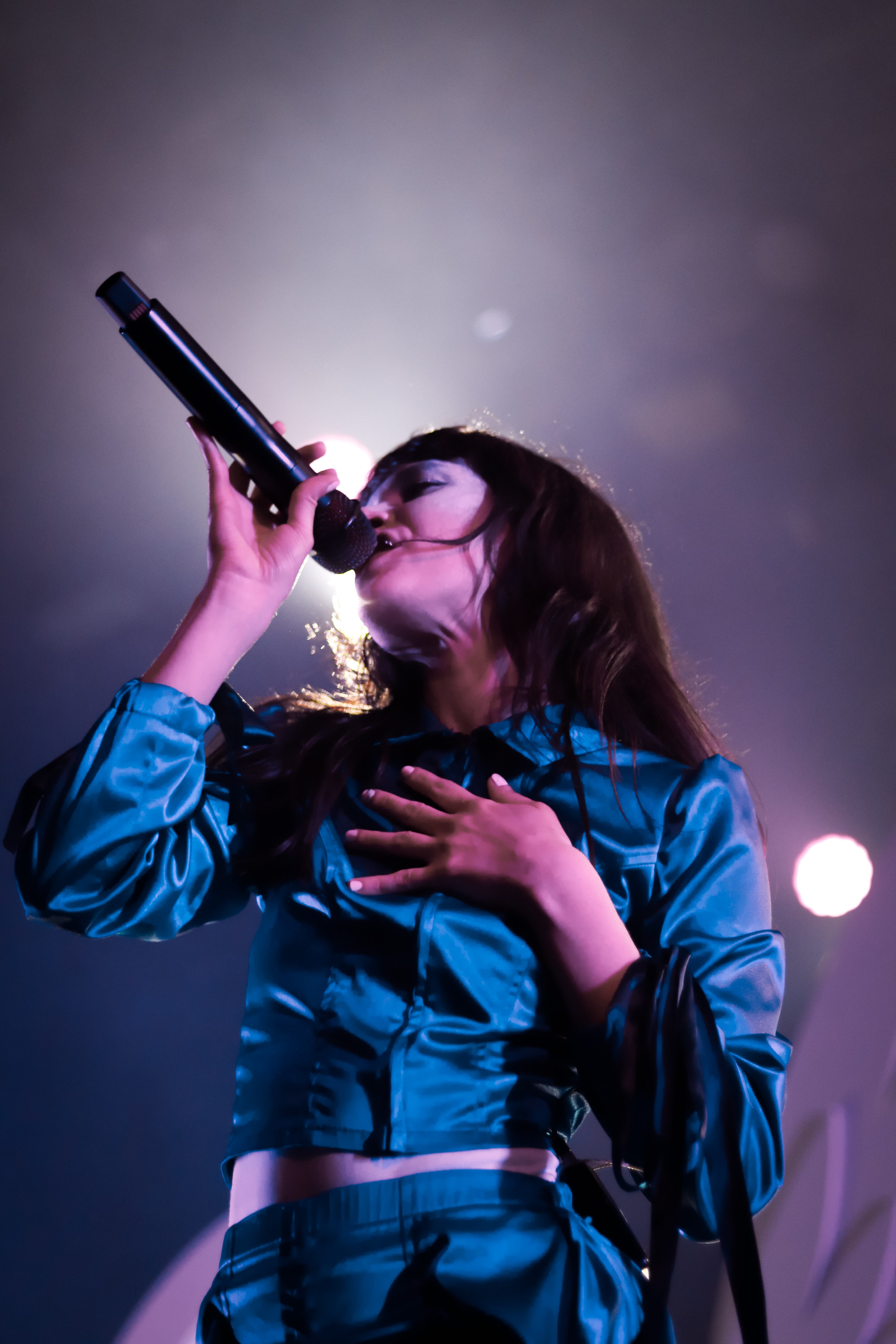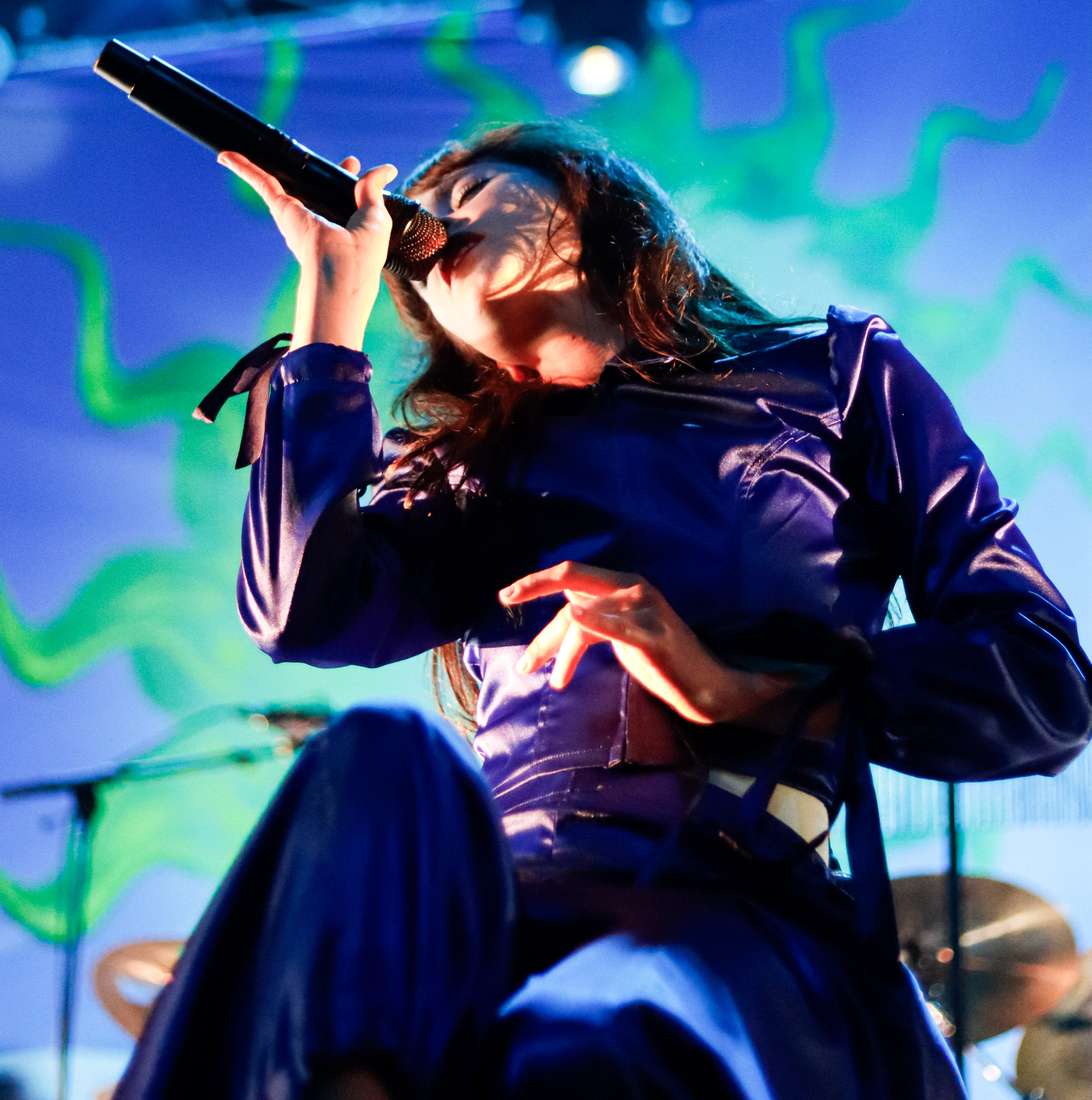 Magdalena Bay, a synth-pop duo, came out onto the stage at 9:00 p.m., and all you could hear were screams of excitement as they started their set off with “She Looked Like Me!,” which is also the first song on their newest album Imaginal Disk, which was released in August 2024. Throughout the entirety of their set, she had a few costume changes. Her initial outfit was a beautiful satin blue two-piece suit with puffy pants, and the top half of her face covered in baby blue face paint. Other outfits she wore included a sunflower headpiece, a cape with a fire design around her head, and an angel costume.