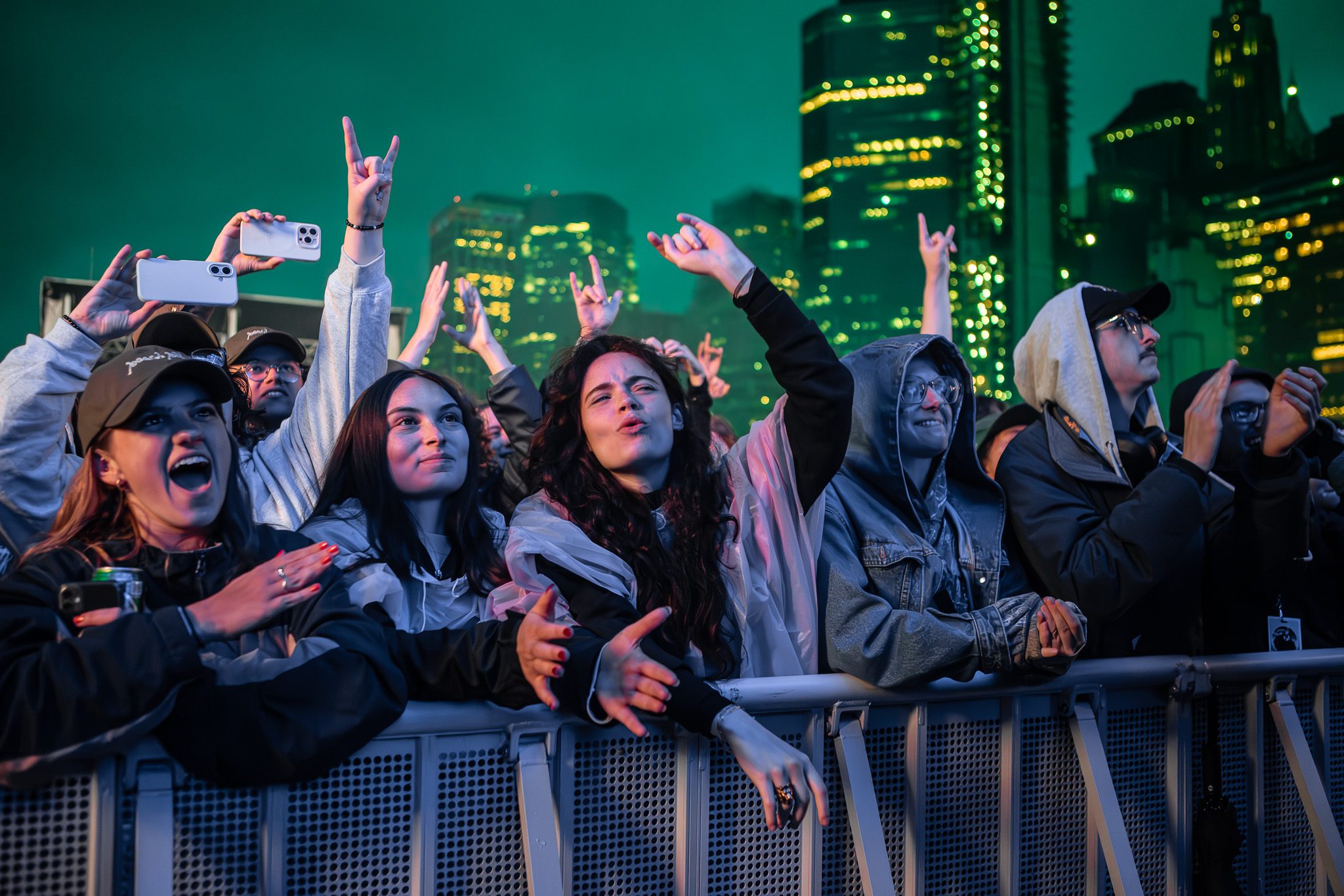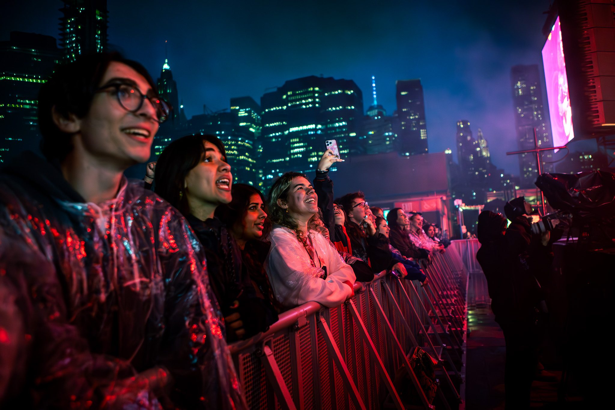 The rain didn’t let up Thursday night in New York City, but on The Rooftop at Pier 17, Peach Pit spun it into magic. The skyline blurred behind sheets of water and fog, the East River churned, and yet nothing – not thunder, nor soaking hair or ruined sneakers – could keep the crowd from basking in the melancholic shimmer of their set.