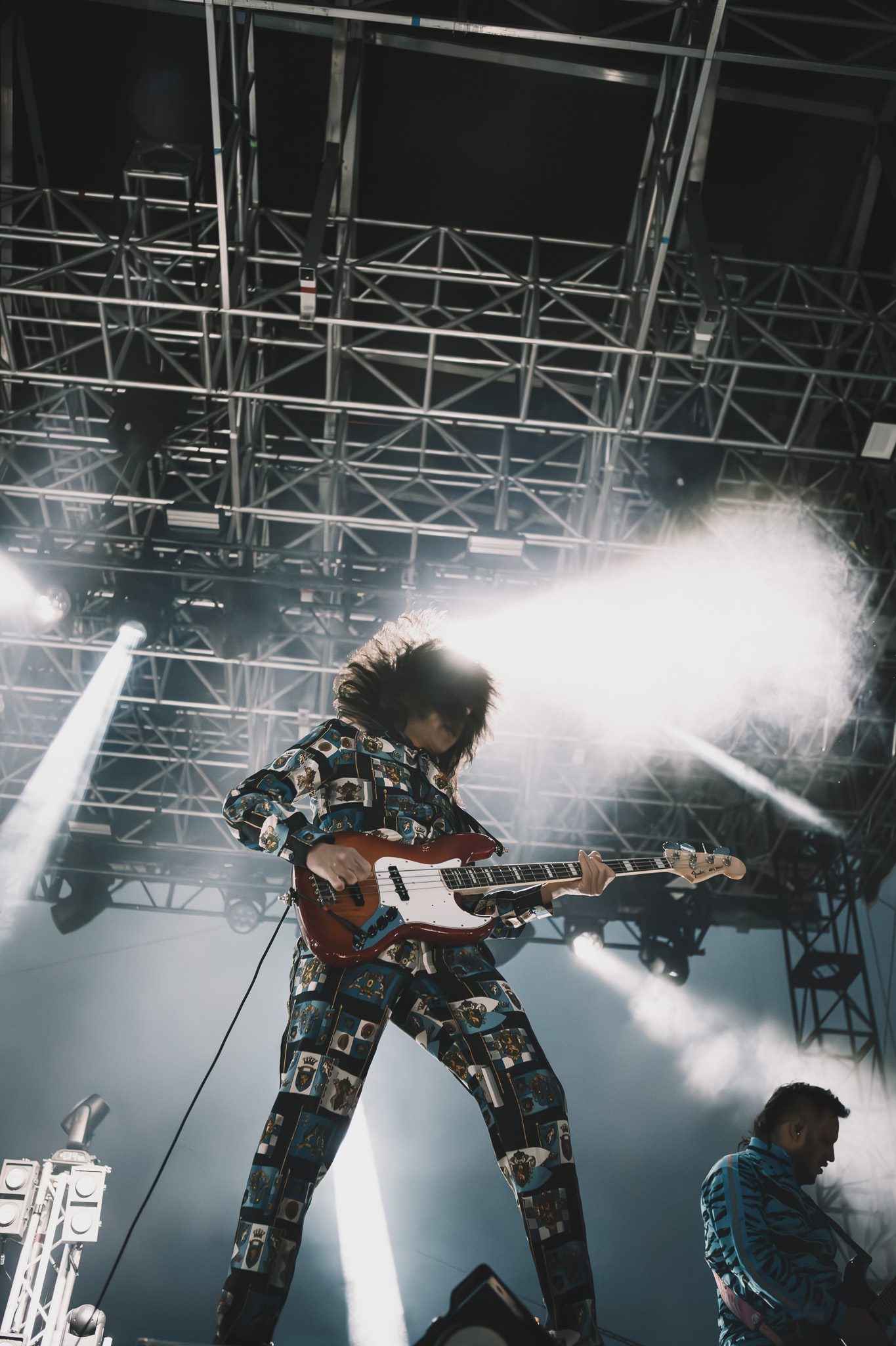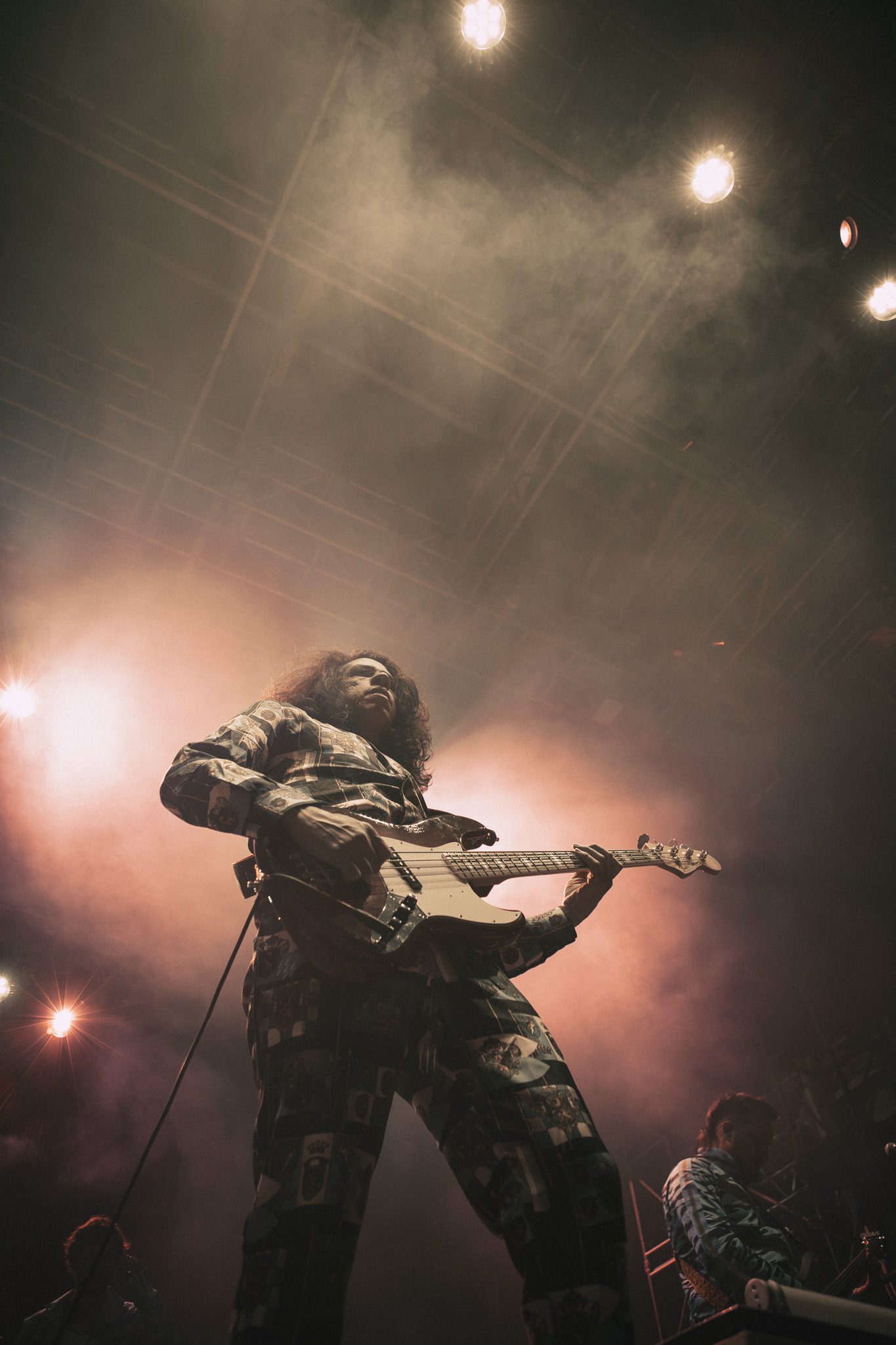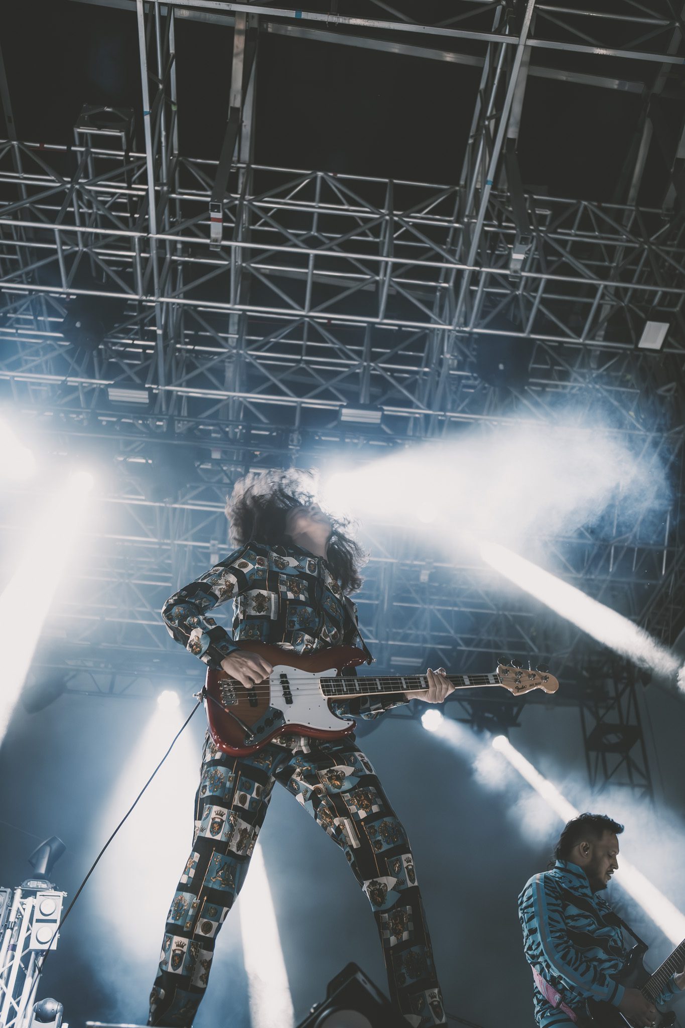 The Home Team was the sweet reprieve – a shimmering interlude dressed in silk and groove. Frontman Brian Butcher is, without a doubt, one of the strongest vocalists in the scene today. His live performance mirrors the band’s studio polish with haunting fidelity, soaring through melodies like a ribbon pulled tight. There are few artists remaining on my “bucket list of shows to photograph,” but The Home Team has been top of it for awhile. And they did not disappoint. Under a canvas of coral light, “Walk This World With Me” rose over the skyline like a prayer, and the crowd, suspended in the moment, swayed in collective surrender with their phone lights illuminating the stage. Butcher looked out and said it plainly: “This is the biggest crowd we’ve ever played to.” Judging by their rising stardom – and with their next album The Crucible of Life releasing July 12 – it won’t hold that title for long. Their set was a celebration of genre-blending, effortlessly marrying funk rhythms with rock intensity.