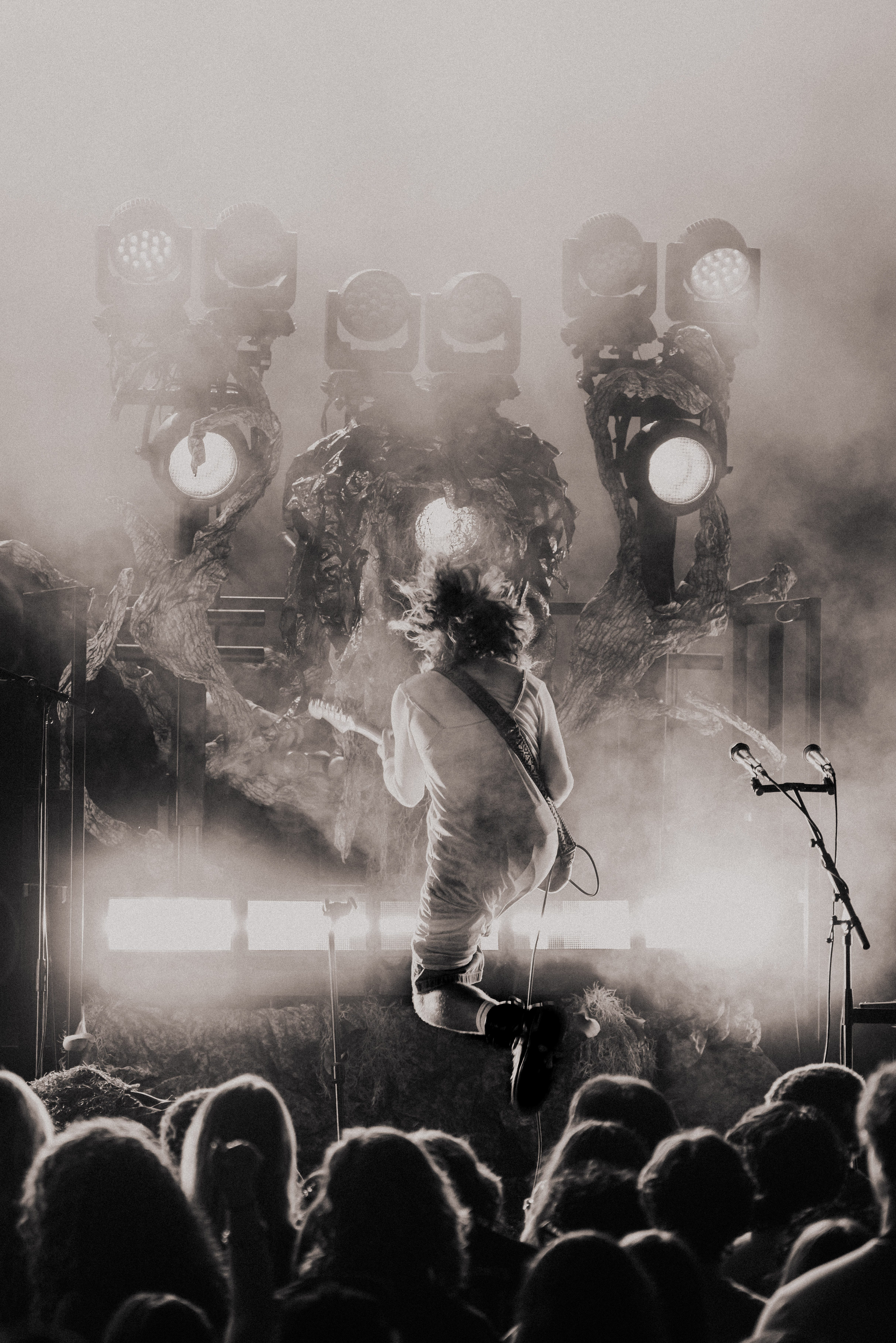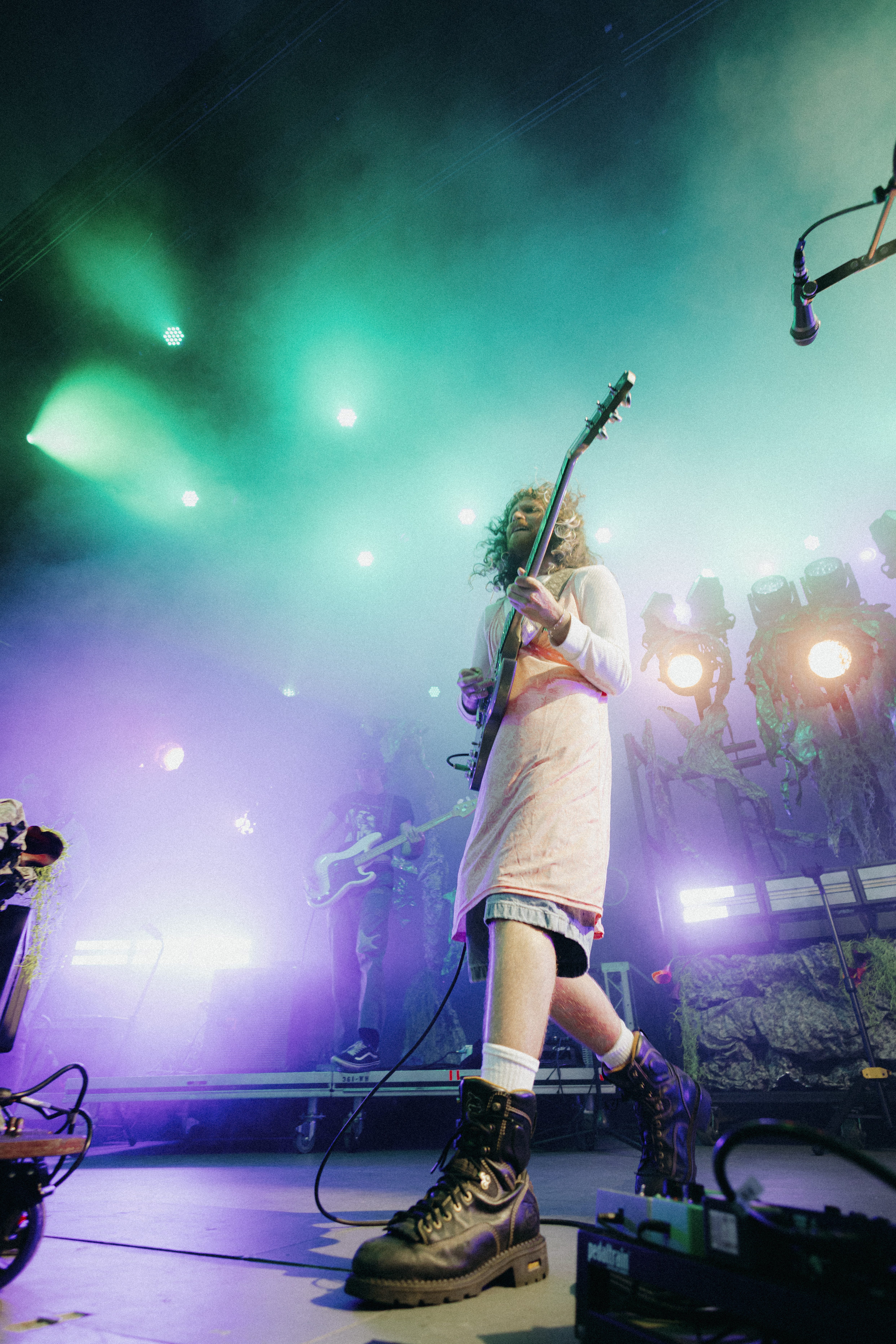 Opening the evening, Briston Maroney brought the world of his new album JIMMY to life with a visually playful and immersive stage design that transformed the theater into something resembling a technicolor forest. With fake trees, vines, googly-eyed woodland creatures, and softly glowing rocks scattered around the stage, the set felt like a live-action scene pulled straight from a weird fairy tale.