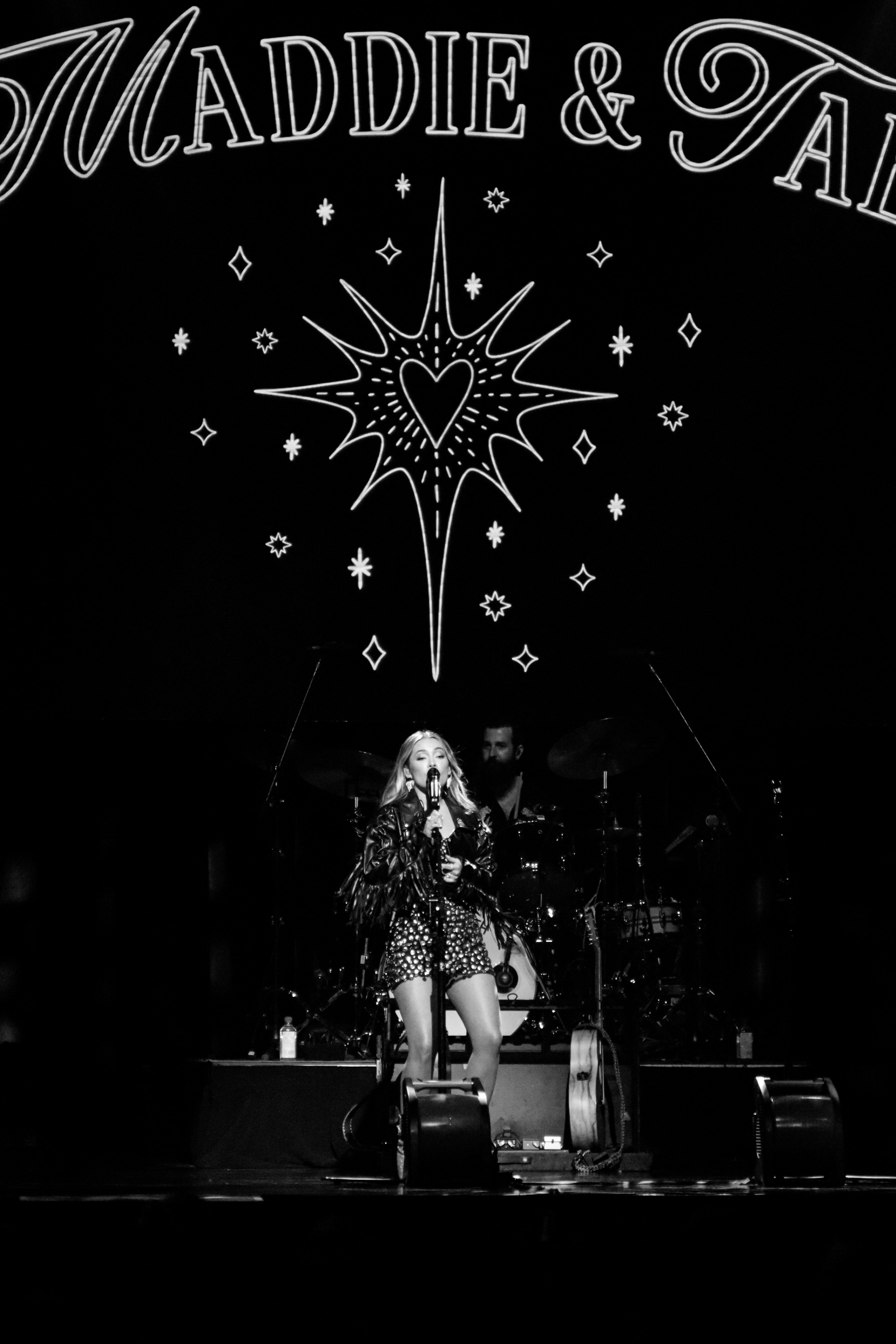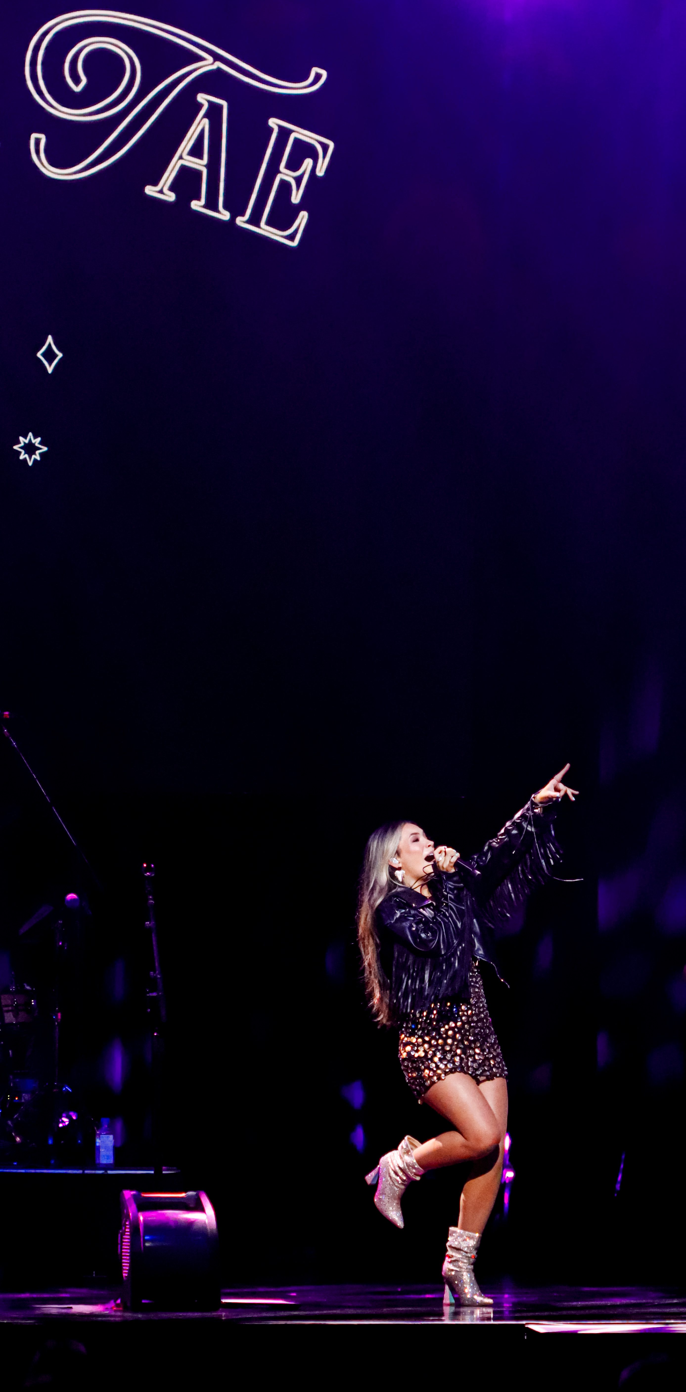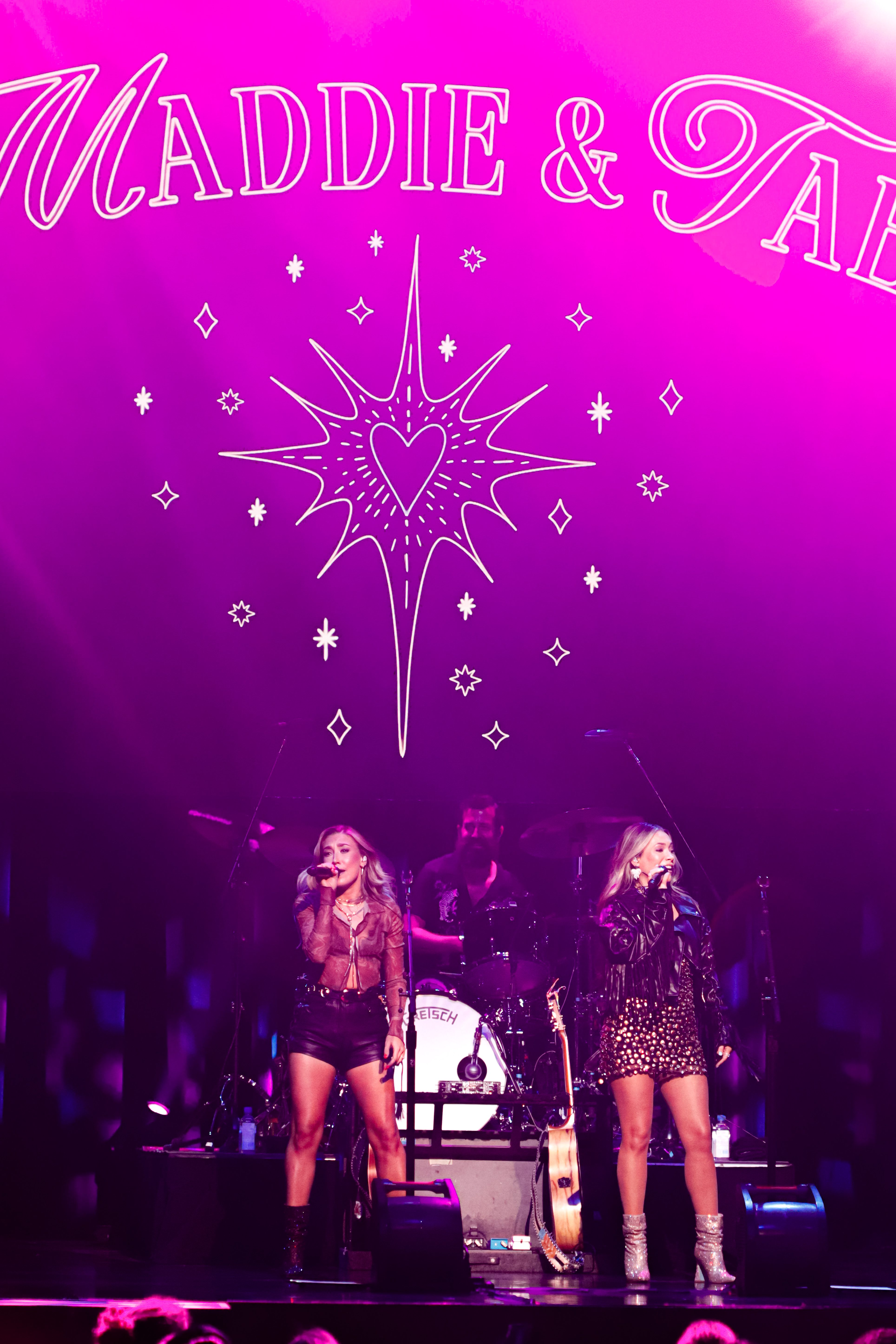 Starting their show off with some upbeat dancing music, they played “Free Like,” “Shut Up And Fish,” and “Sad Girl Summer.” Their energy was off the charts, as they basically had an entire cardio workout on the stage. Maddie was dressed in a cute crop top with black leather shorts and short brown sparkly high heels, and Tae was dressed in a black and brown polka-dot mini dress with a black leather fringe jacket and silver sparkly high heels. They were glittering and shining all night.