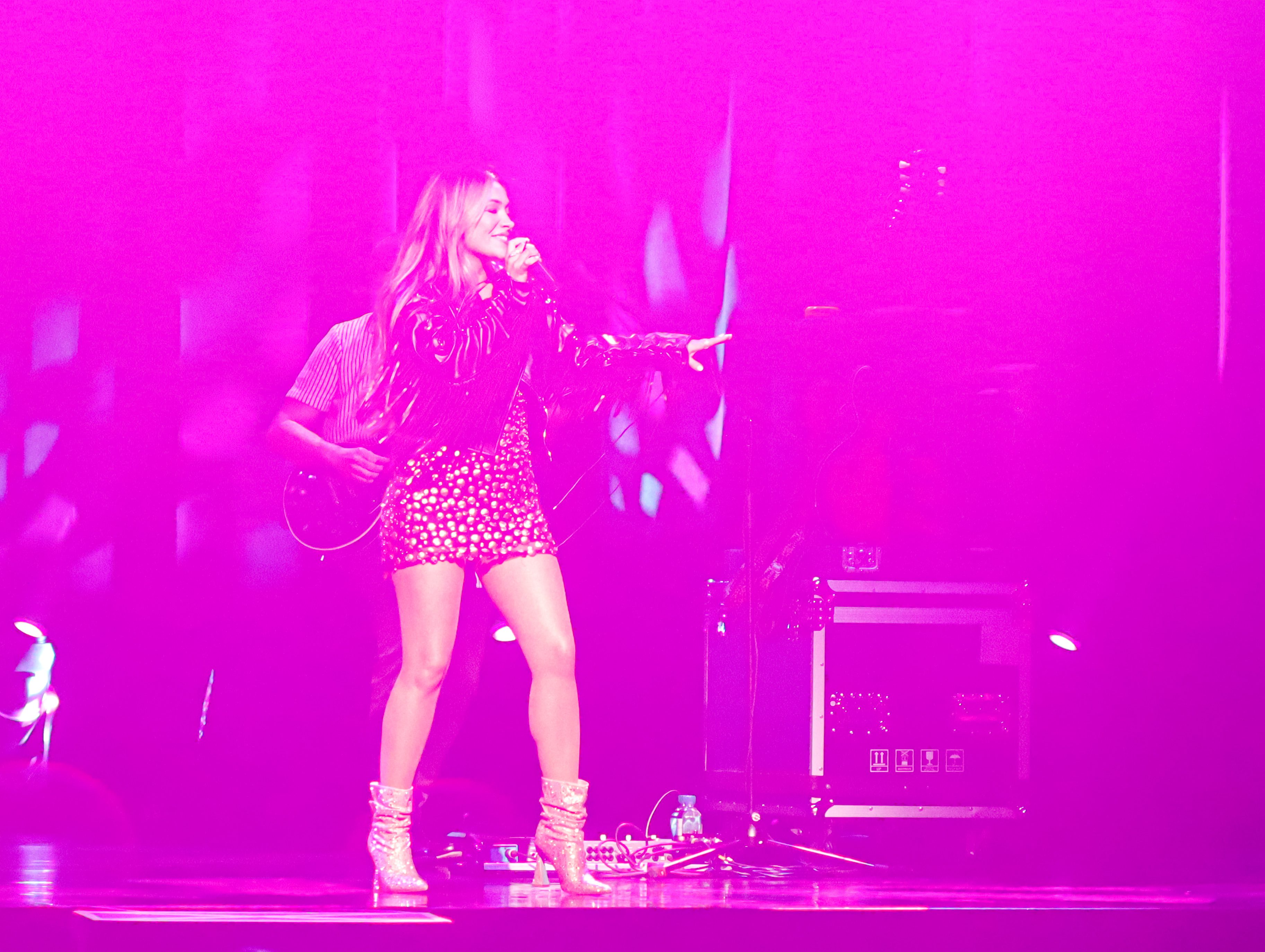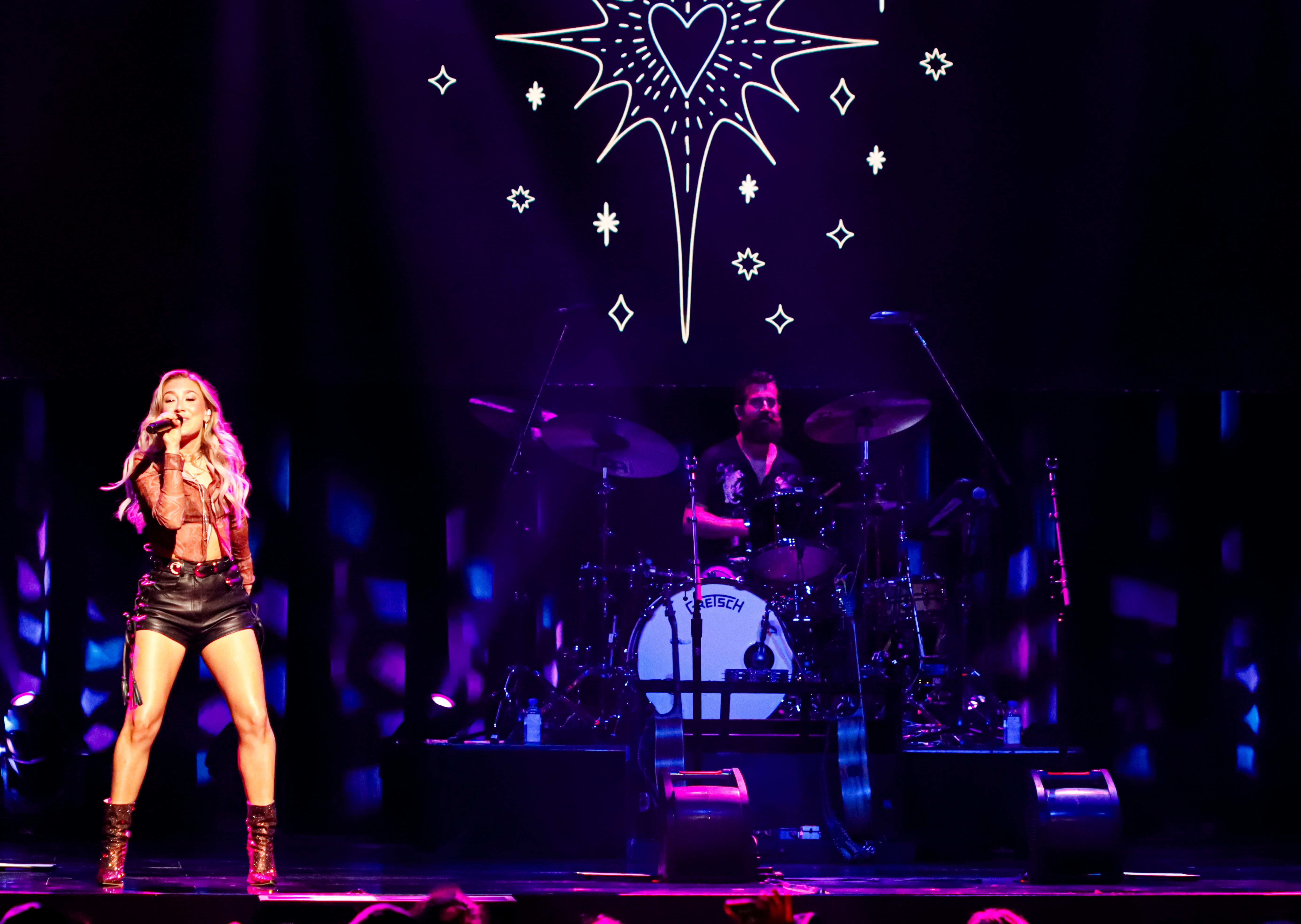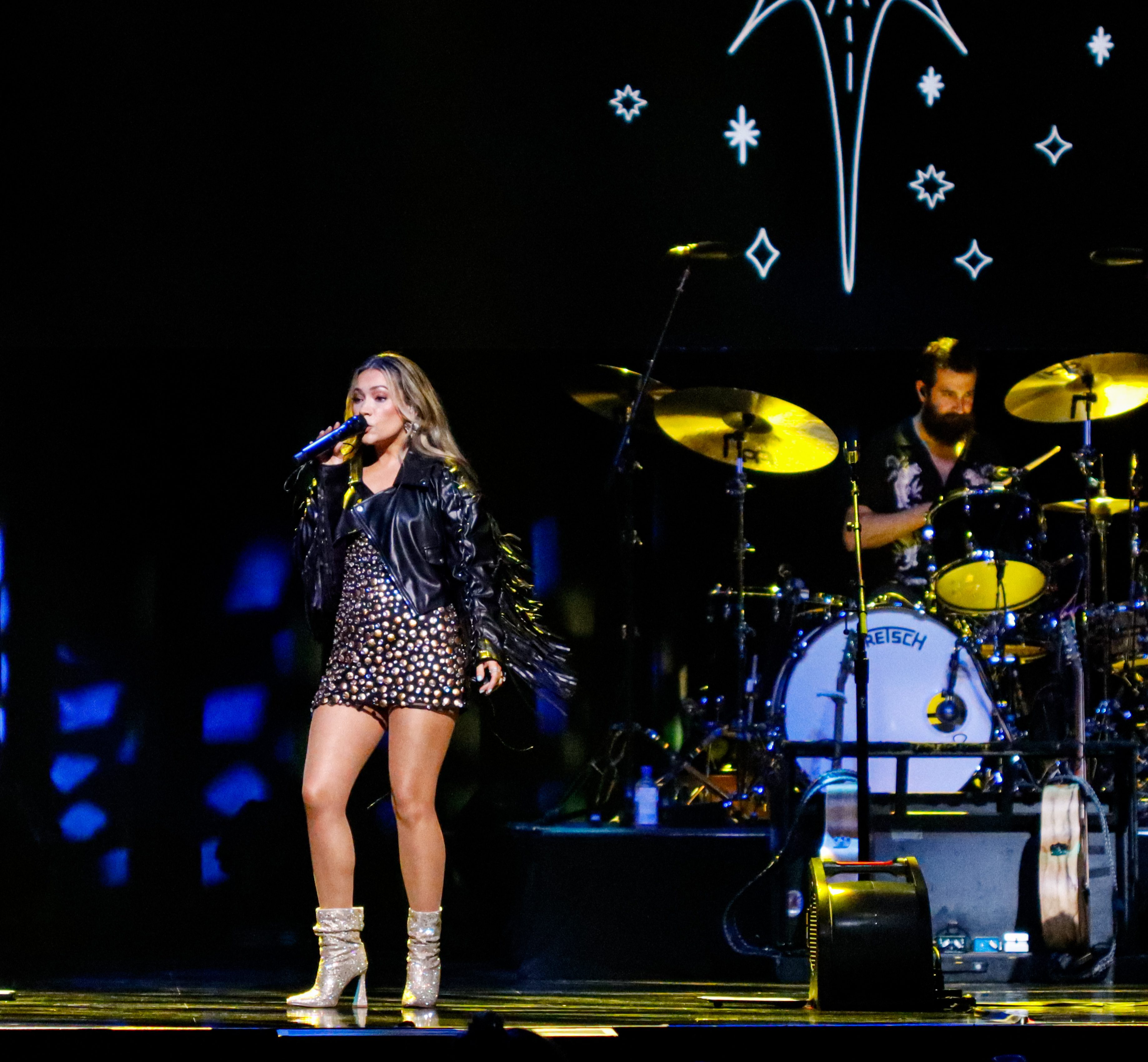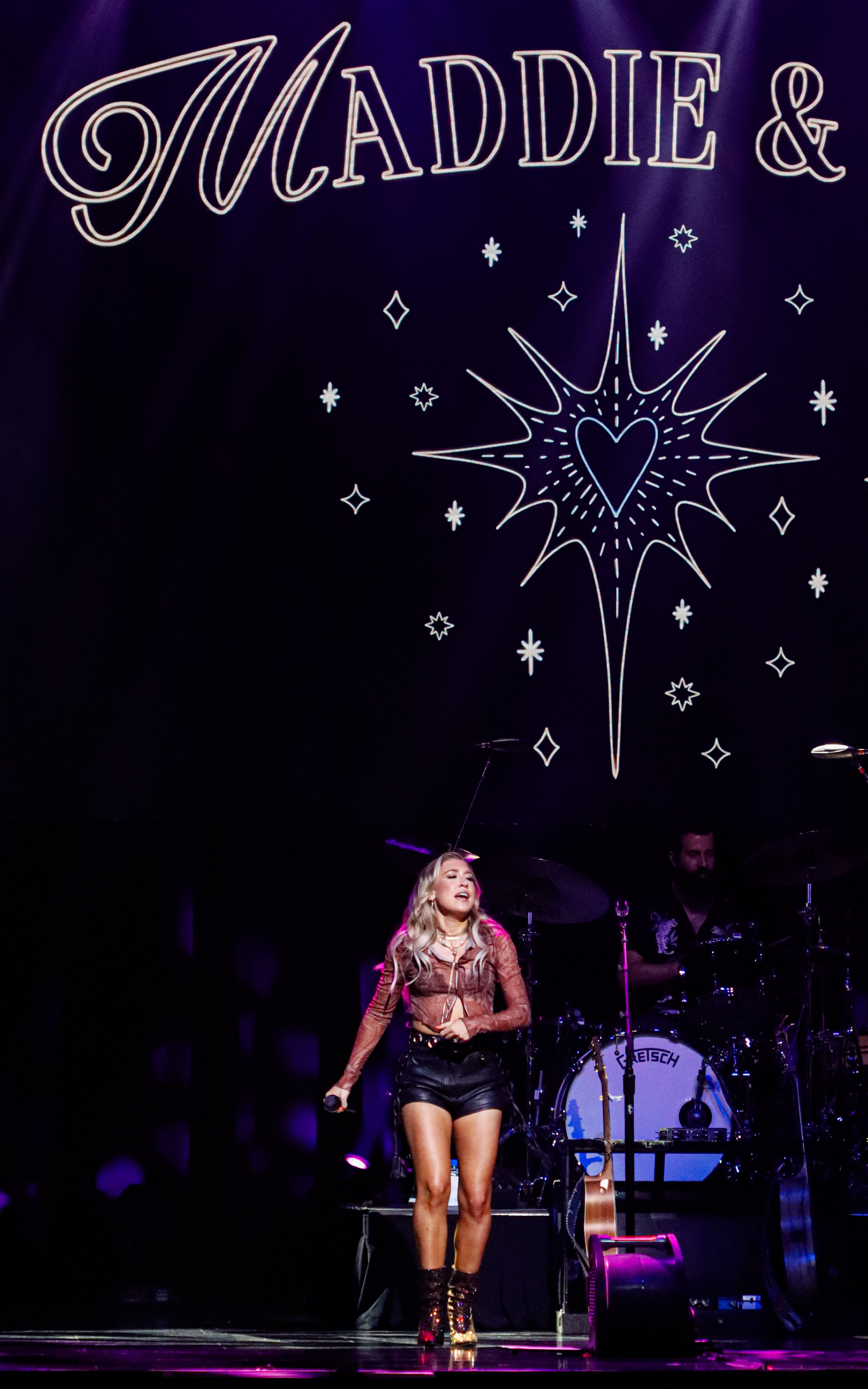 Starting their show off with some upbeat dancing music, they played “Free Like,” “Shut Up And Fish,” and “Sad Girl Summer.” Their energy was off the charts, as they basically had an entire cardio workout on the stage. Maddie was dressed in a cute crop top with black leather shorts and short brown sparkly high heels, and Tae was dressed in a black and brown polka-dot mini dress with a black leather fringe jacket and silver sparkly high heels. They were glittering and shining all night.