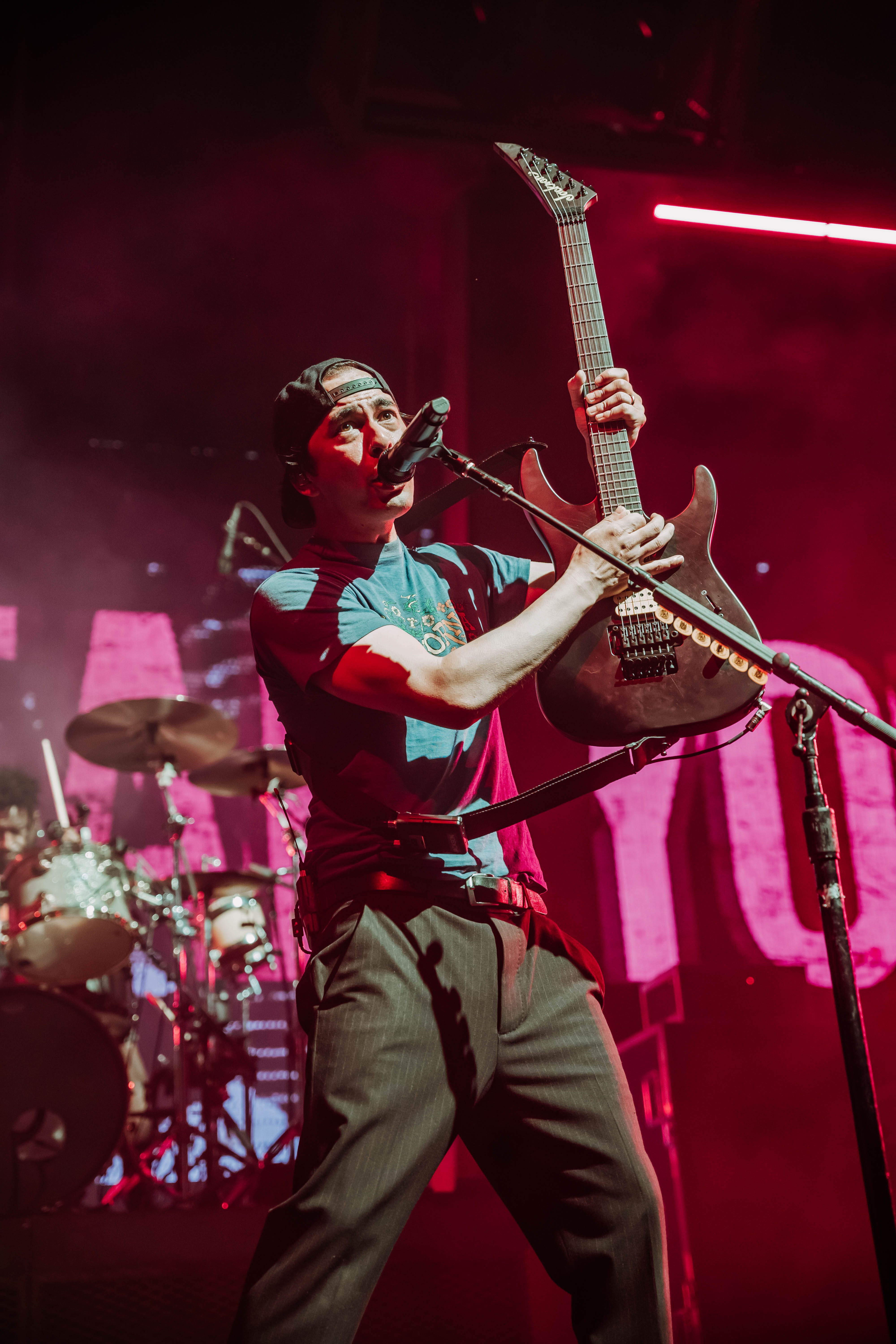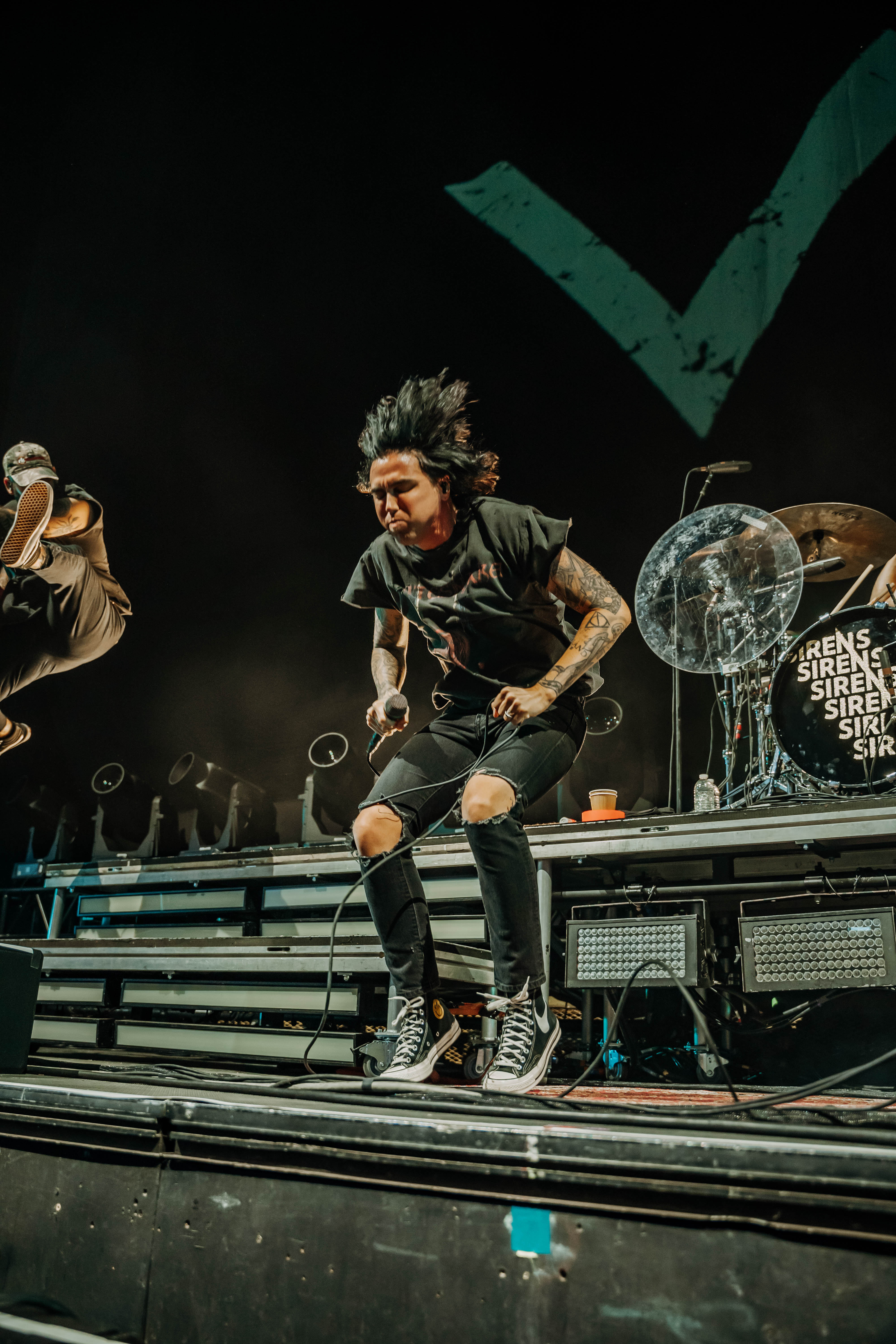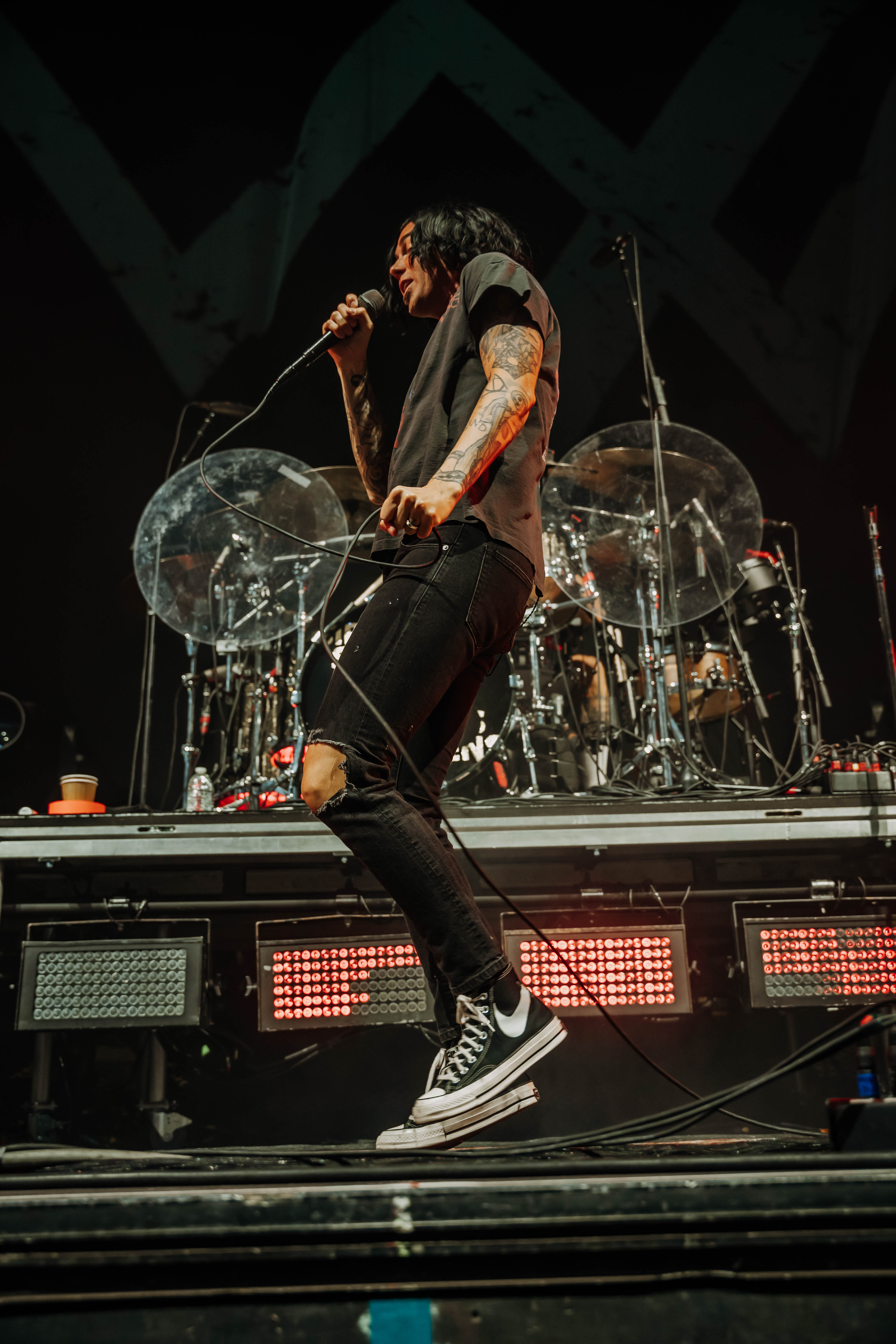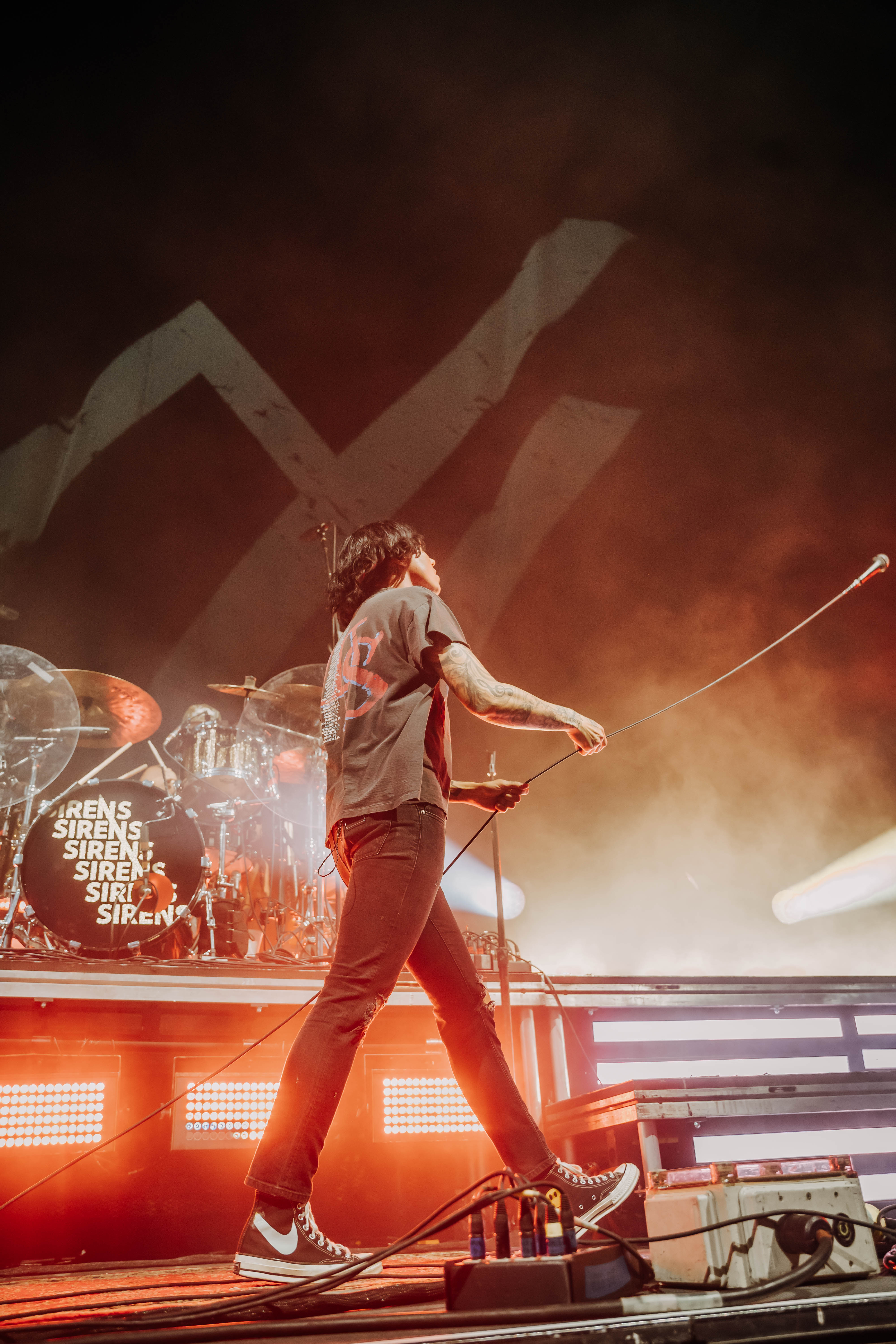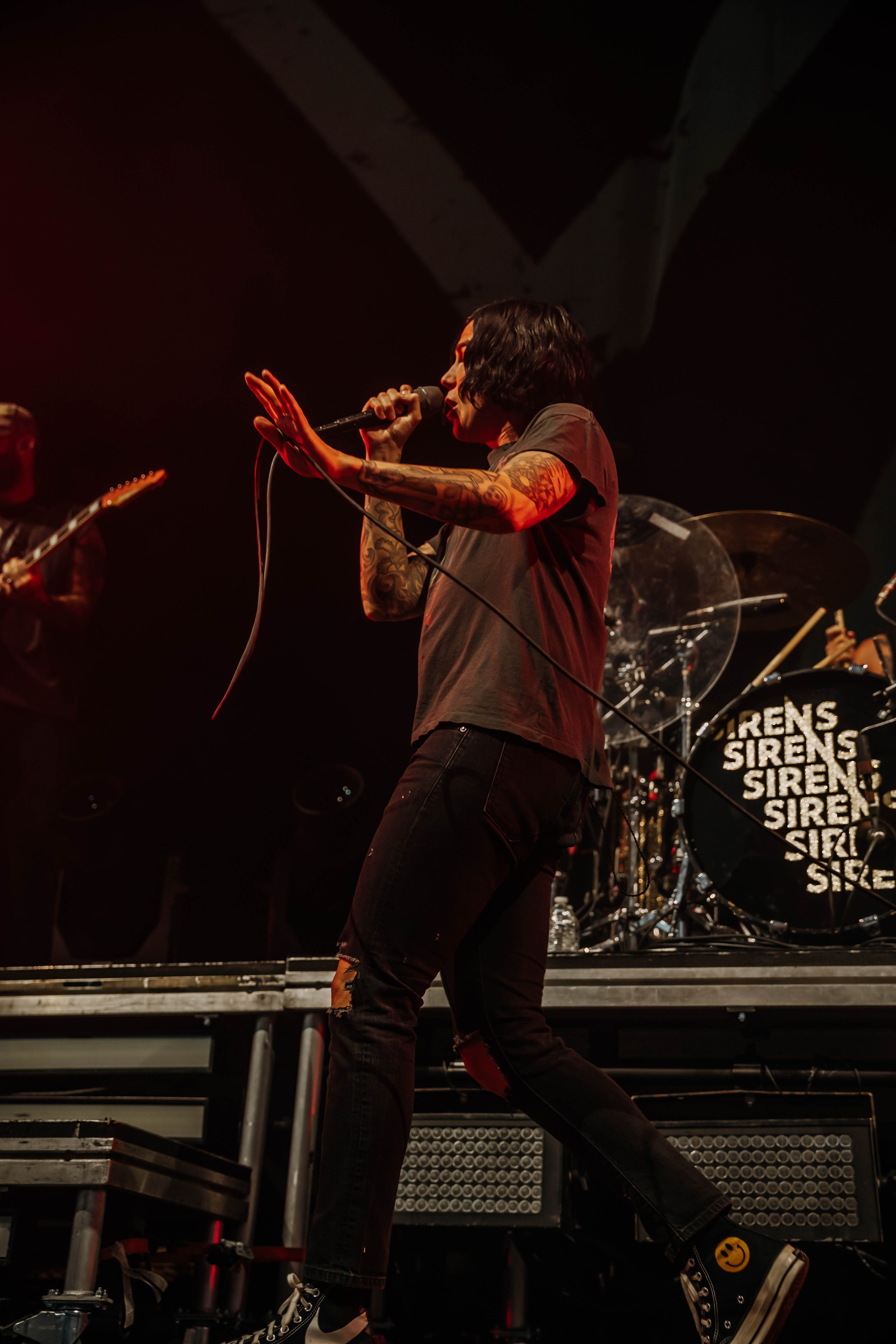 But the night wasn’t over—not even close. When the lights dimmed again, the amphitheatre exploded in anticipation, and then came the unmistakable opening of Pierce The Veil’s “Emergency Contact.” From that first note, it was chaos in the best way. Vic Fuentes commanded the stage with the ease of a seasoned icon, delivering track after track of blistering emotion and melodic grit. Songs like “Bulls in the Bronx” and “Pass the Nirvana” reminded everyone why this band continues to thrive after all these years. One of the night’s most intimate moments came when Vic grabbed his acoustic guitar and megaphone, stripping everything back for a haunting solo performance that quieted even the most chaotic pockets of the crowd.