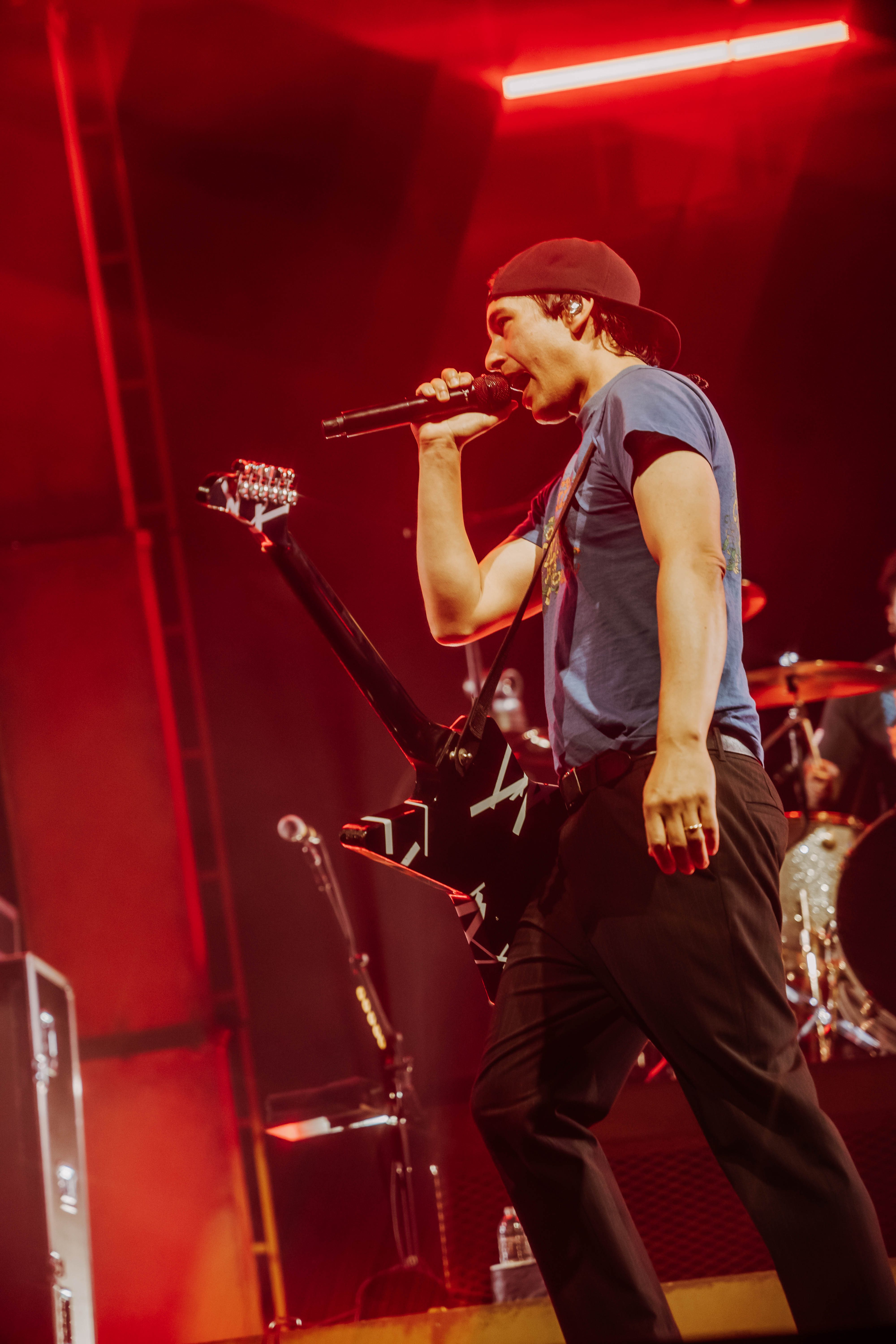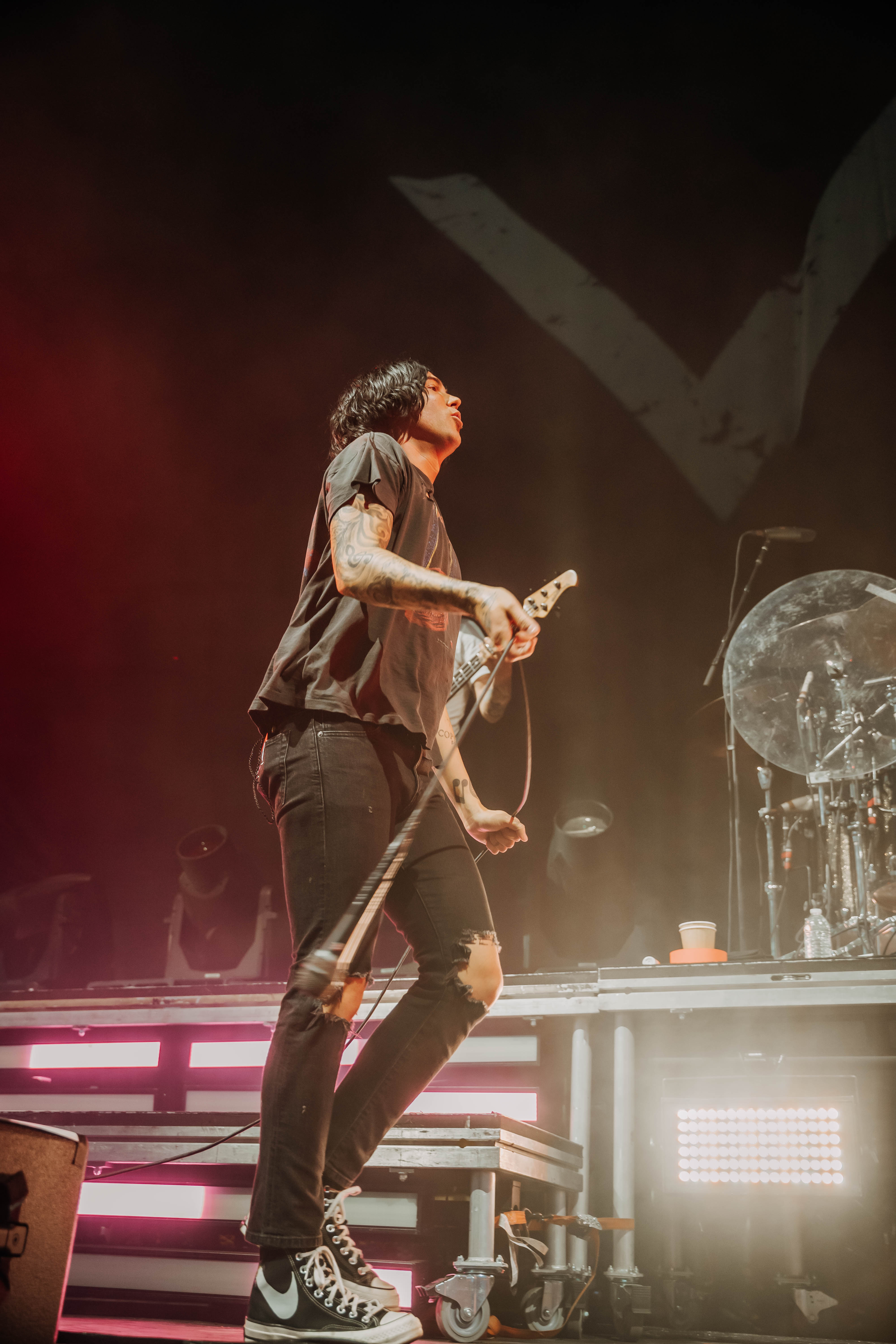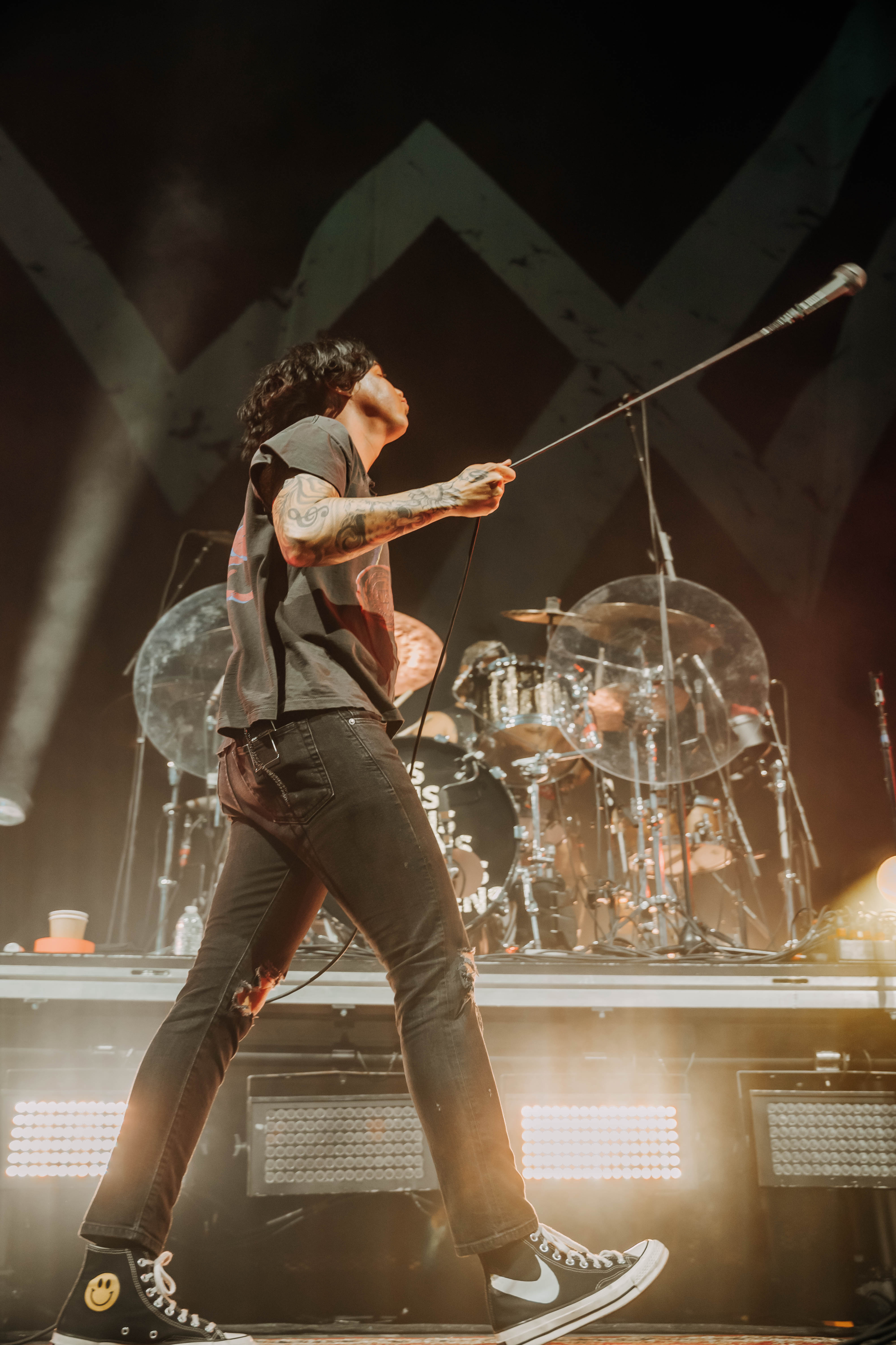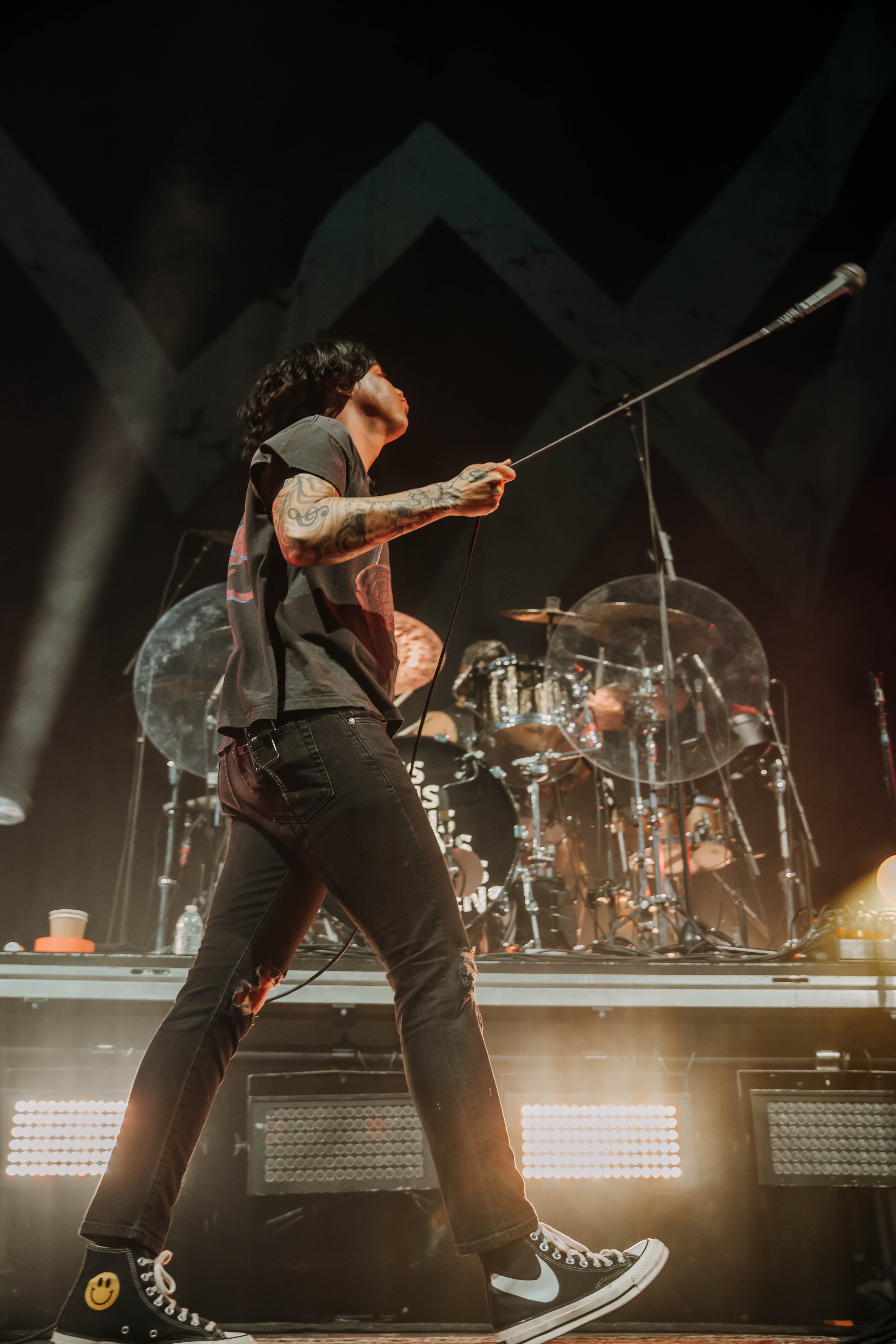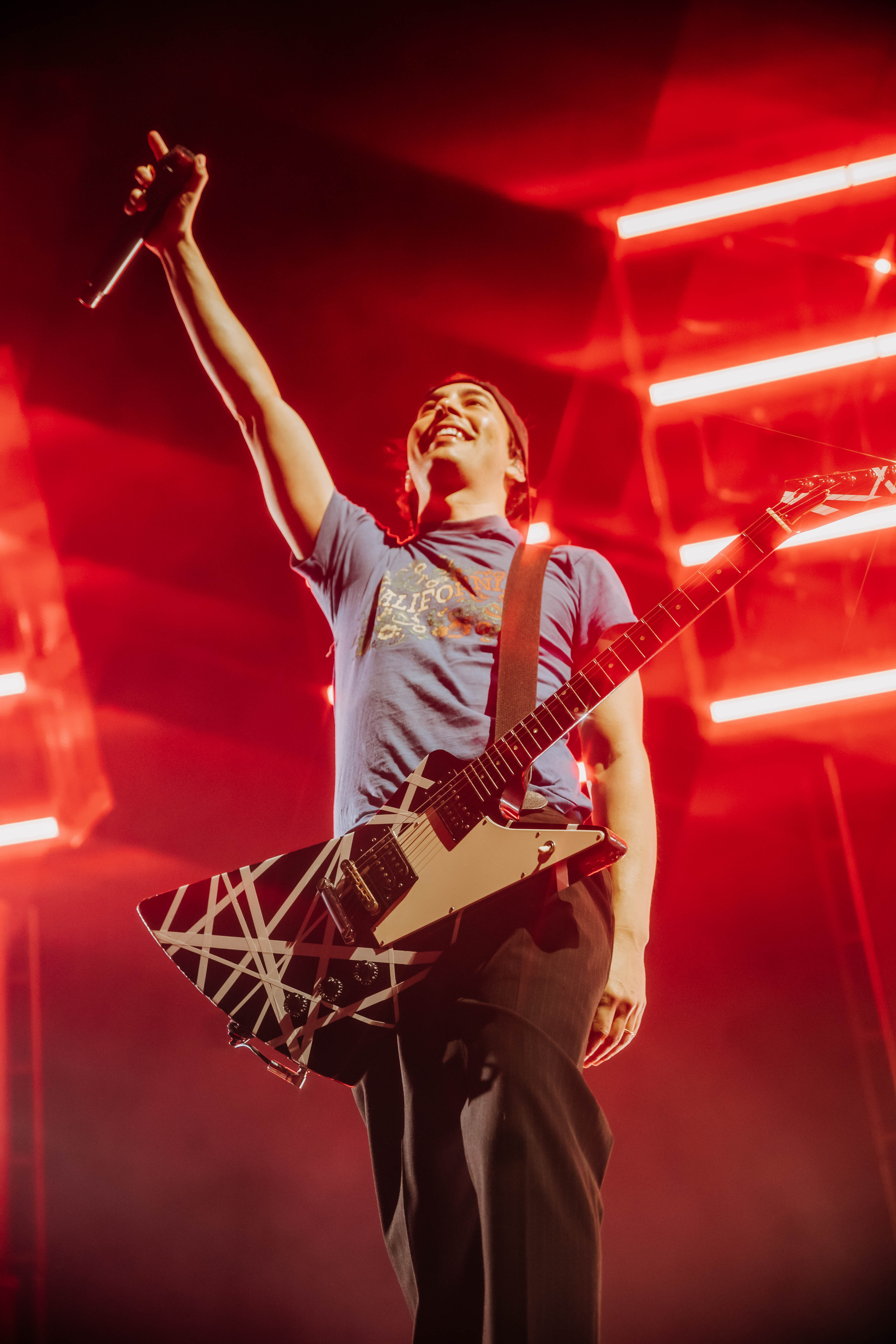 But the night wasn’t over—not even close. When the lights dimmed again, the amphitheatre exploded in anticipation, and then came the unmistakable opening of Pierce The Veil’s “Emergency Contact.” From that first note, it was chaos in the best way. Vic Fuentes commanded the stage with the ease of a seasoned icon, delivering track after track of blistering emotion and melodic grit. Songs like “Bulls in the Bronx” and “Pass the Nirvana” reminded everyone why this band continues to thrive after all these years. One of the night’s most intimate moments came when Vic grabbed his acoustic guitar and megaphone, stripping everything back for a haunting solo performance that quieted even the most chaotic pockets of the crowd.