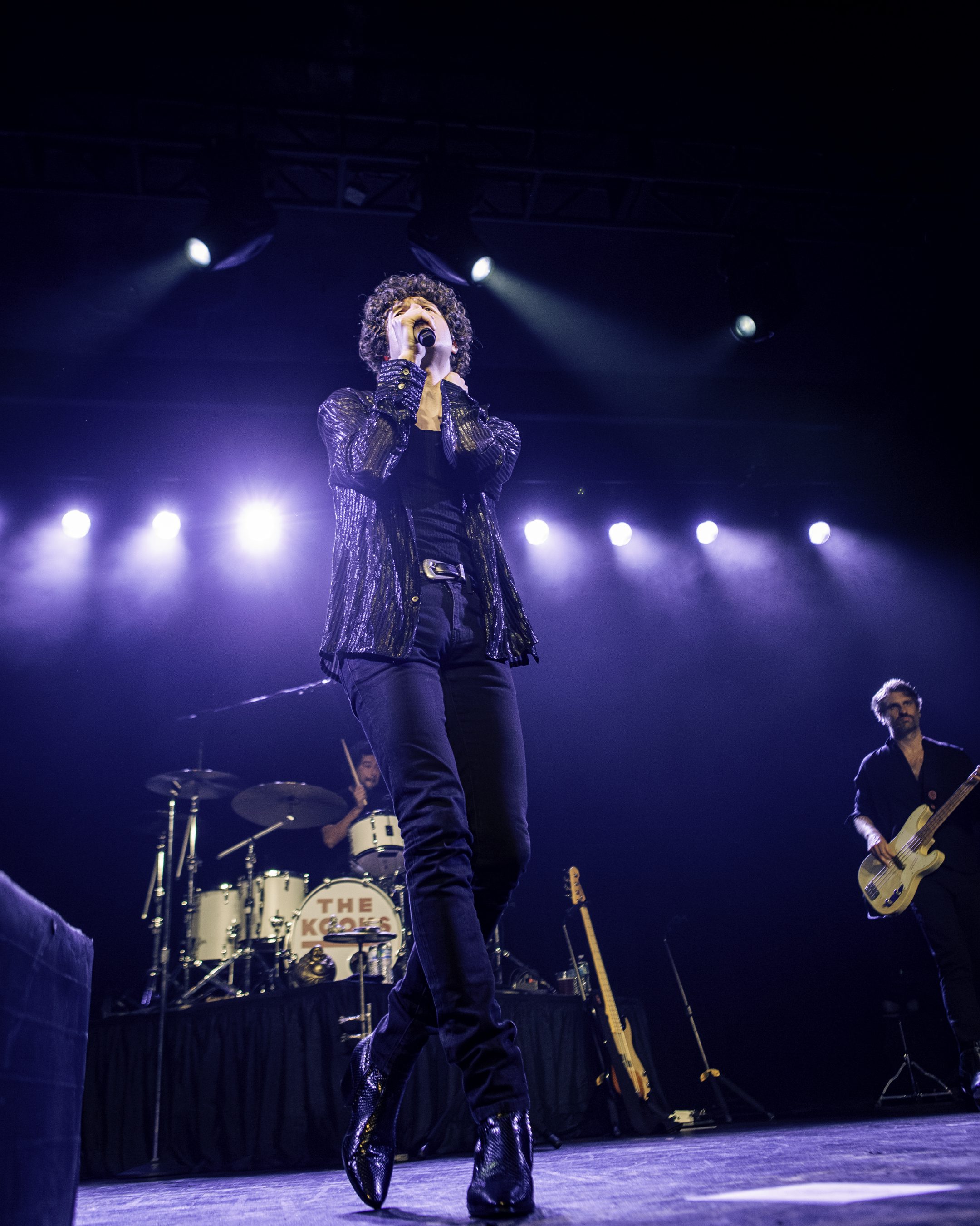 The house lights dim as the stage lights come on and a recording of Neil Diamond’s “Sweet Caroline” begins to play. Voices in the audience hush in anticipation and then begin to join in on the chorus of “Sweet Caroline.” As the recording fades out, the band enters the stage to cheers and applause. Vocalist Luke Pritchard’s sequined black jacket glimmers in the bright white lights on stage as he taps his feet and twirls to “Sofa Song,” The Kooks‘ first song of the evening at their show at the Roseland Theater.