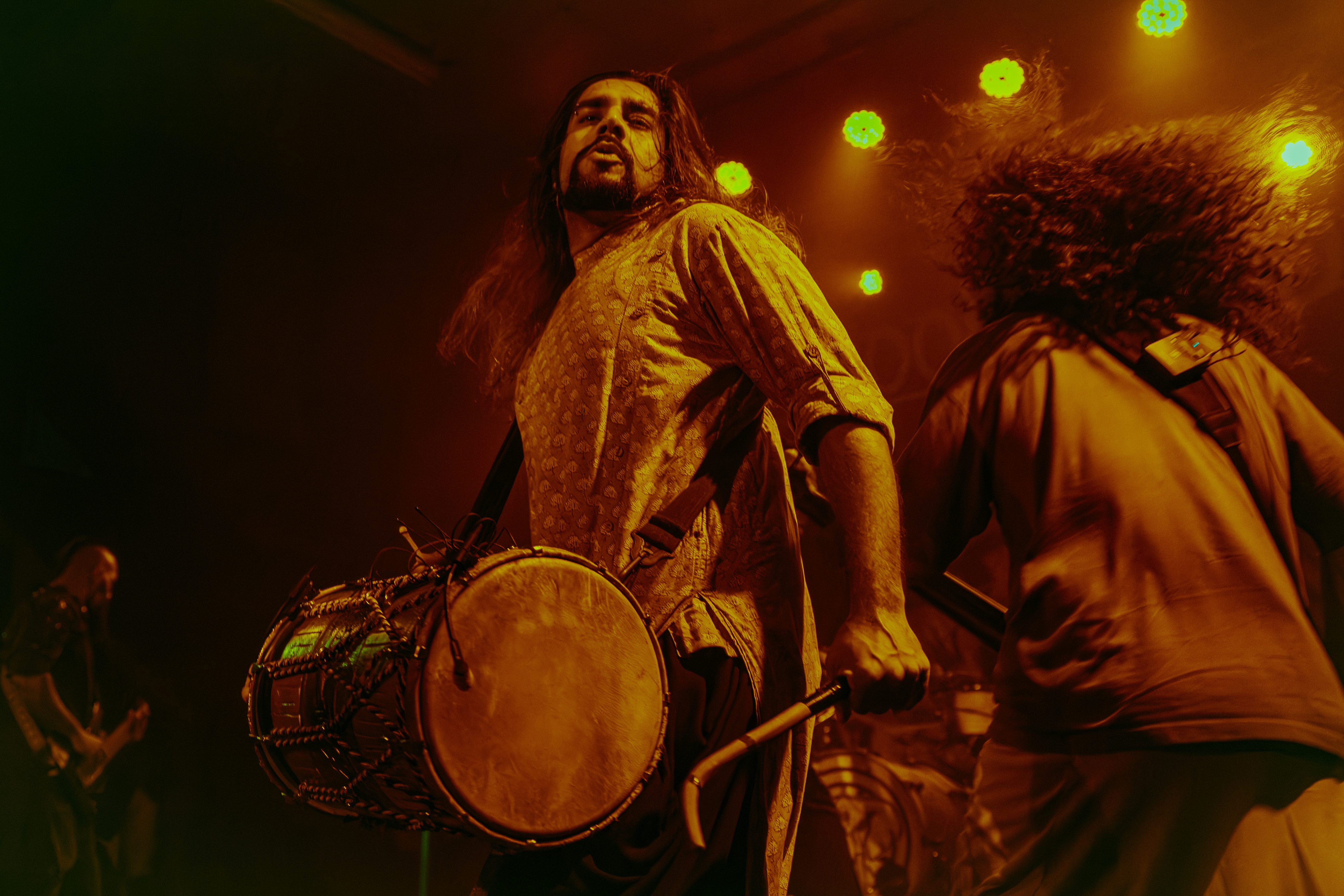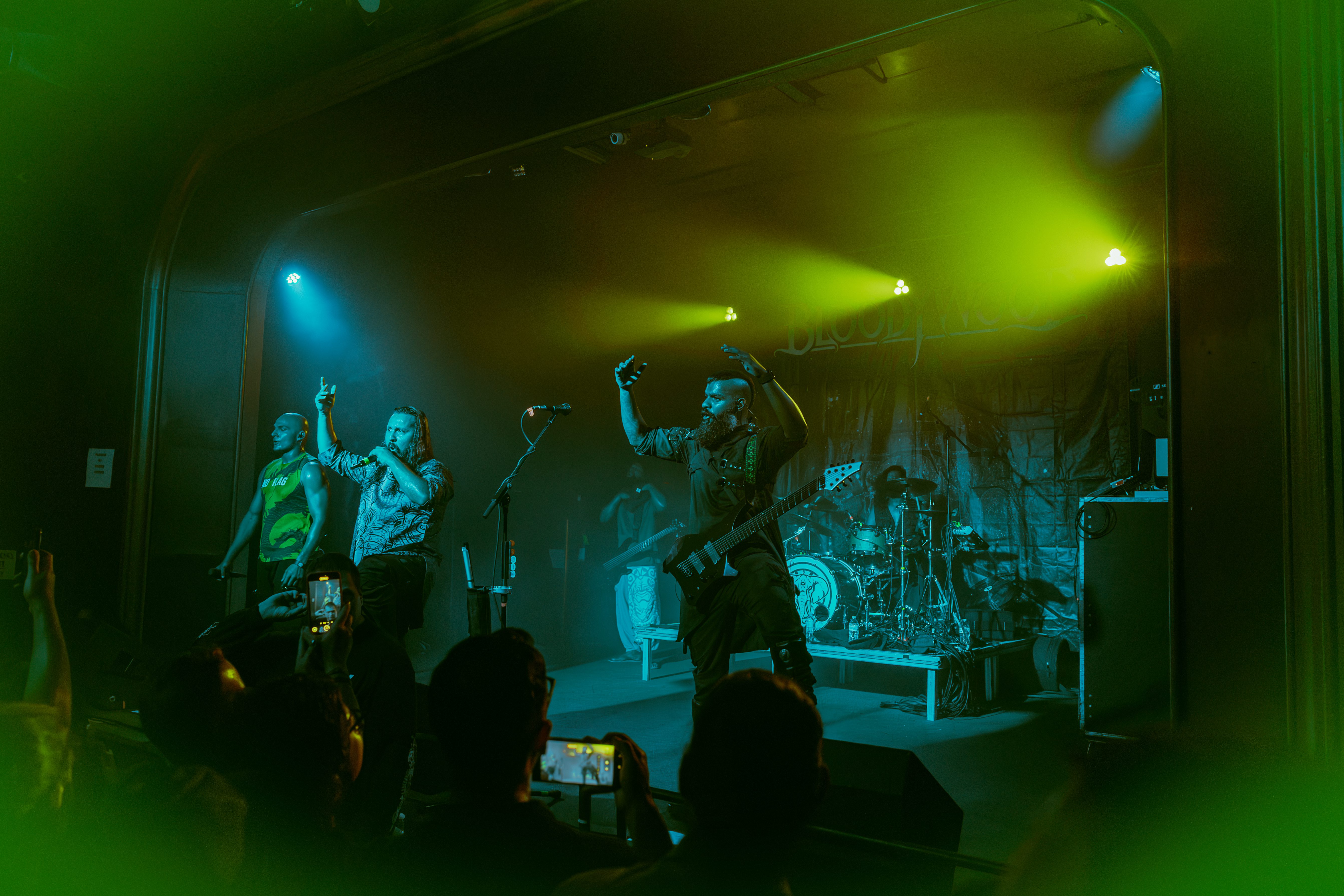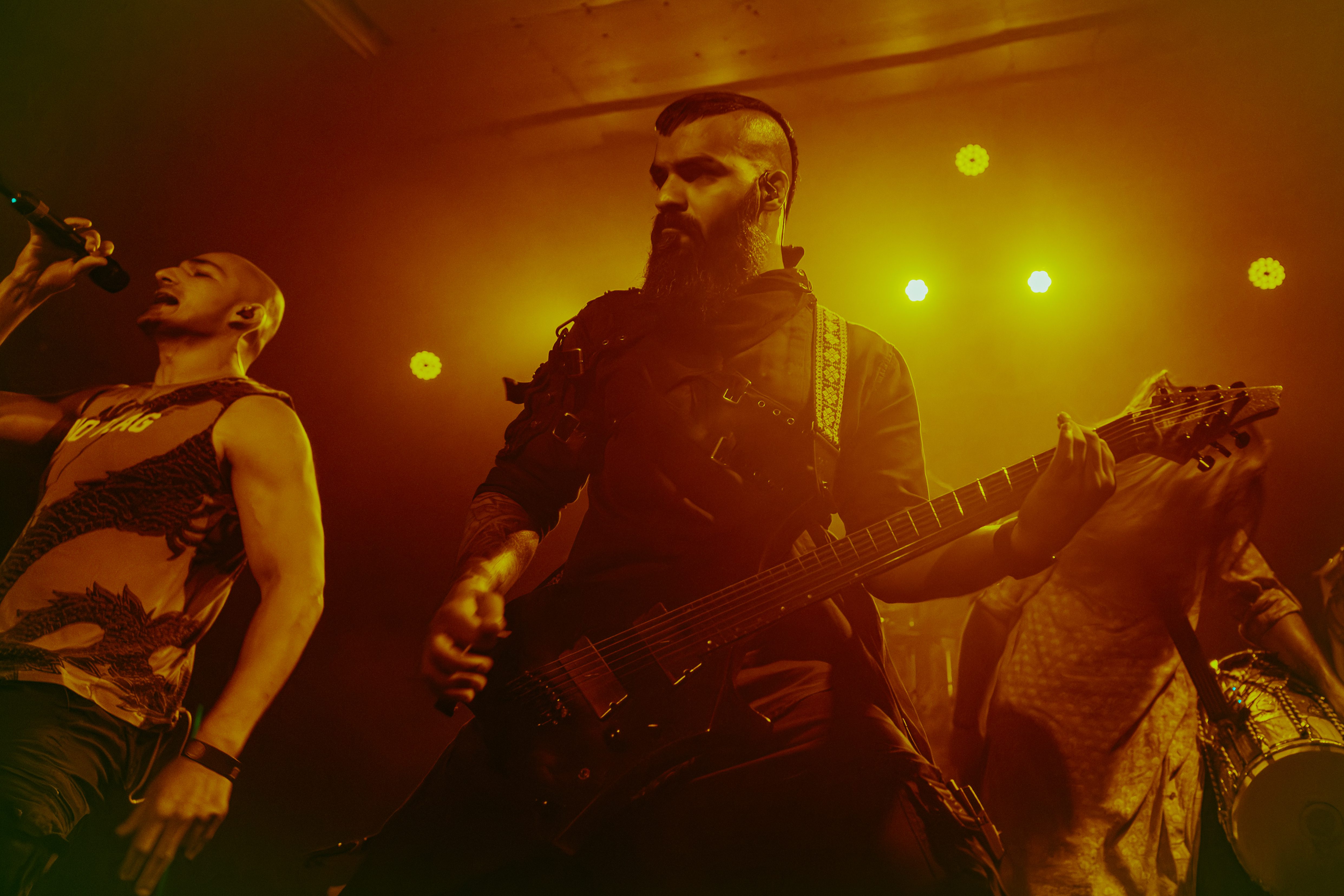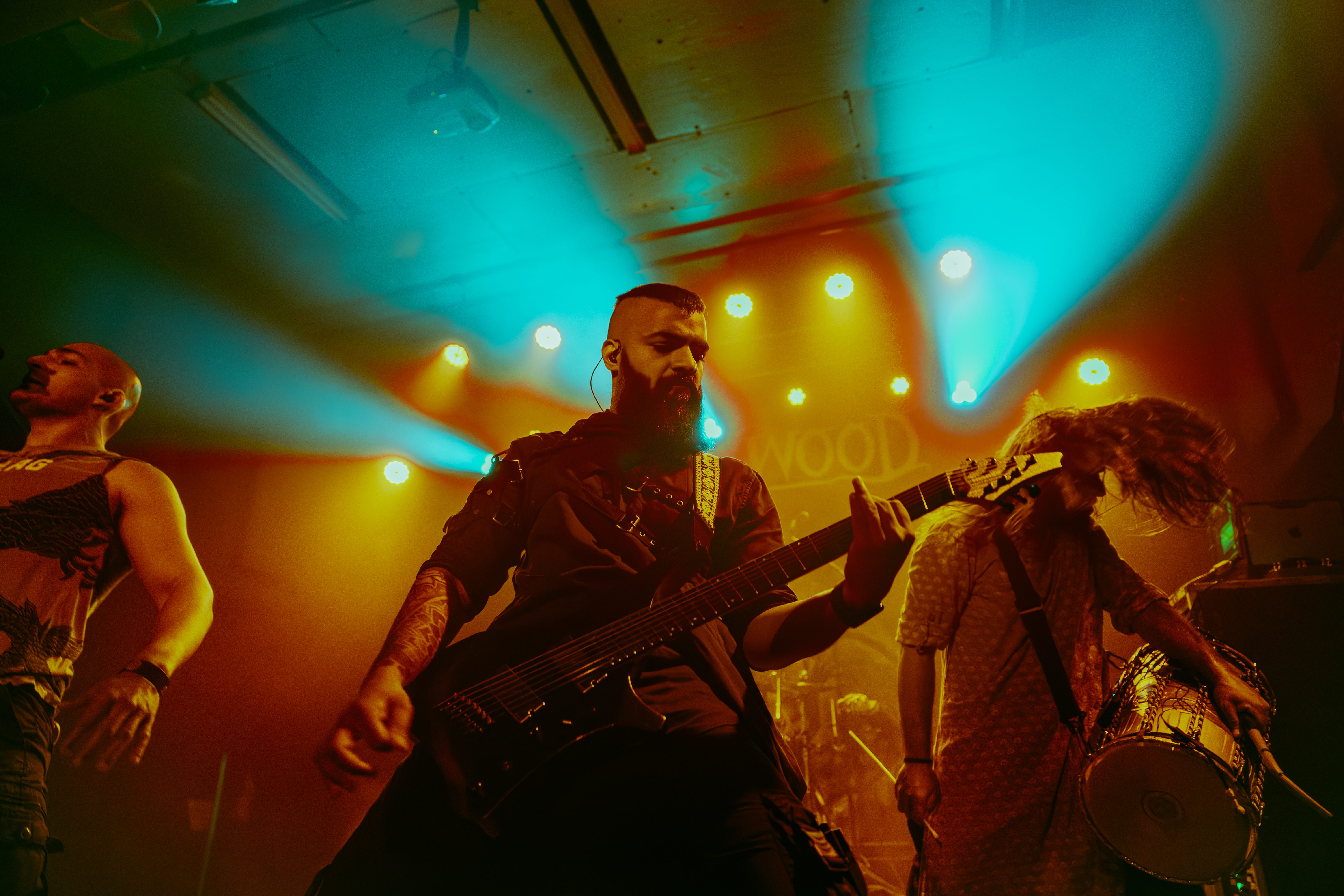A roar from the crowd signaled the main event and I barely cleared the photo pit before Bloodywood burst onto the stage. The six?piece – dual vocal frontline, guitar/multi?instrumentalist, kit + dhol percussion, bass – owned every inch of the stage. When the traditional dhol thudded under down?tuned riffs and tumbi/flute melodies cut through the mix, the whole floor shook.
