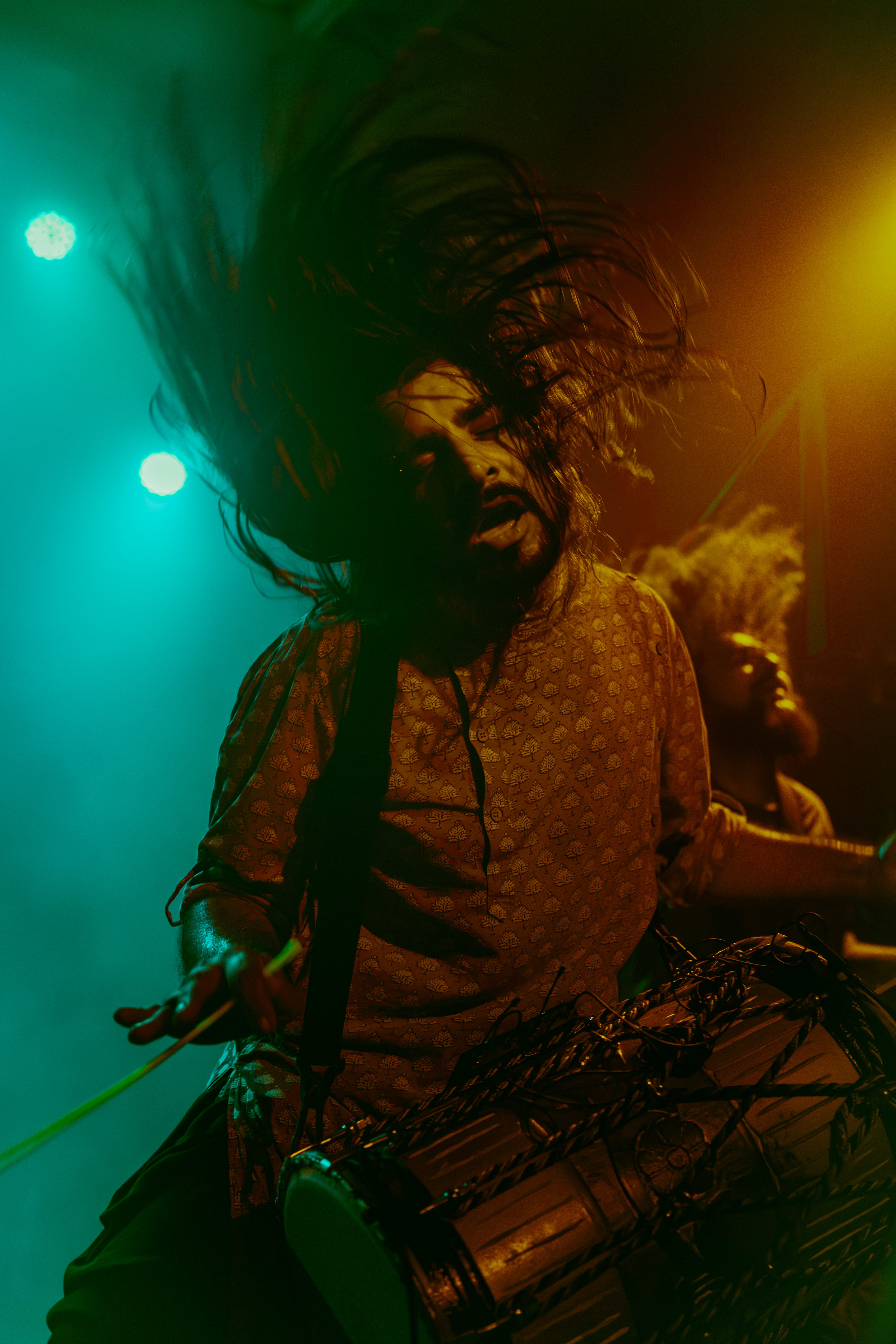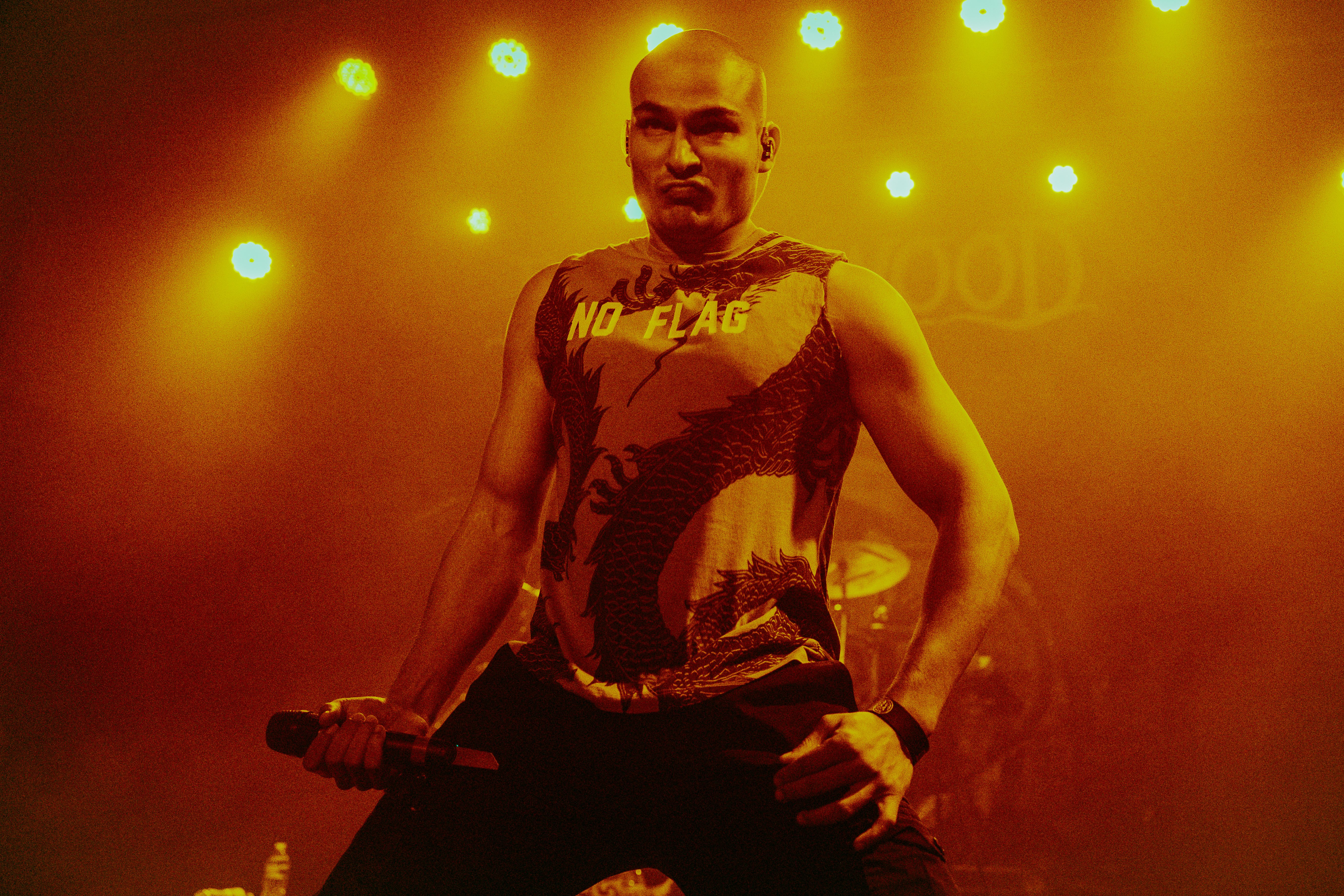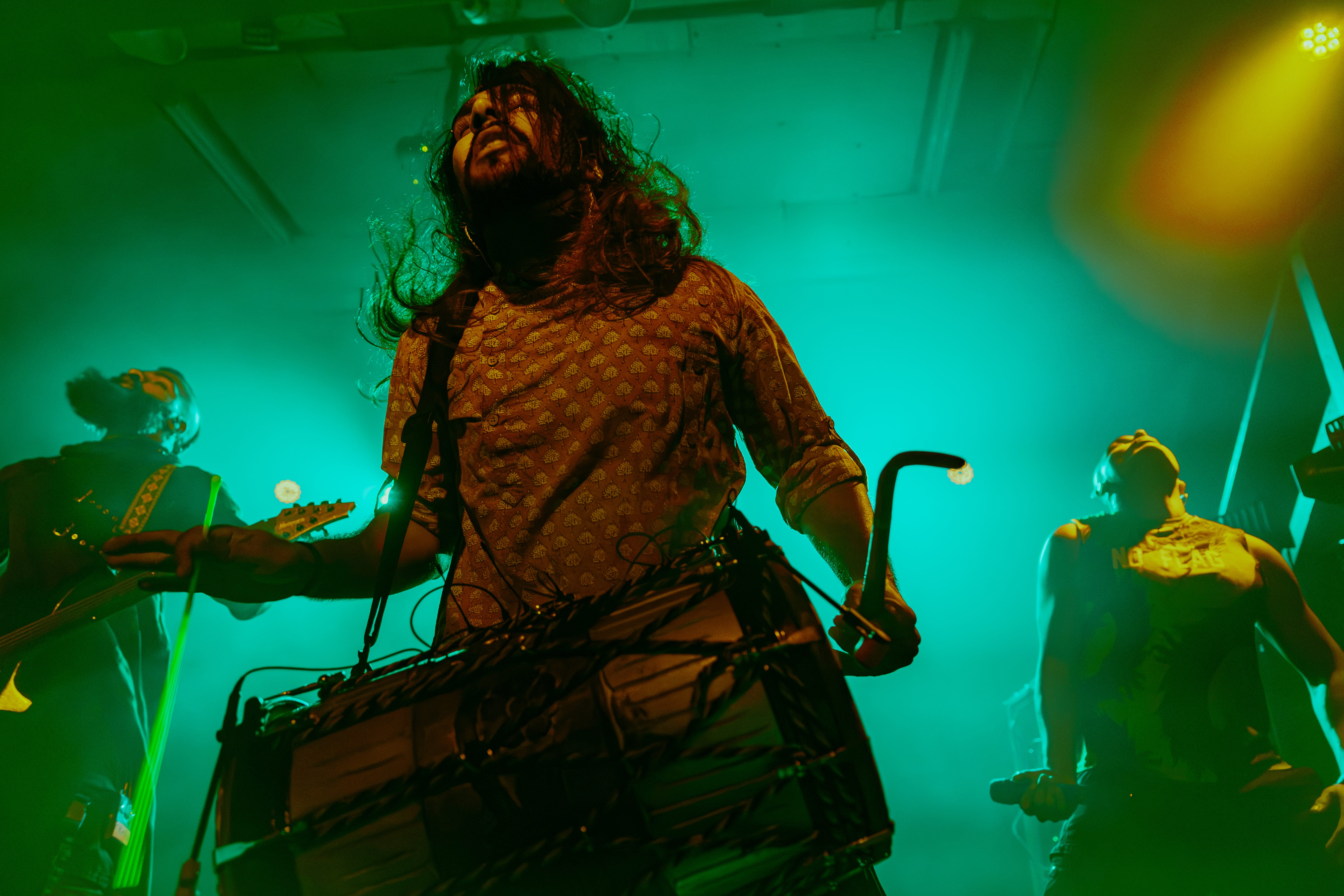 A roar from the crowd signaled the main event and I barely cleared the photo pit before Bloodywood burst onto the stage. The six?piece – dual vocal frontline, guitar/multi?instrumentalist, kit + dhol percussion, bass – owned every inch of the stage. When the traditional dhol thudded under down?tuned riffs and tumbi/flute melodies cut through the mix, the whole floor shook.