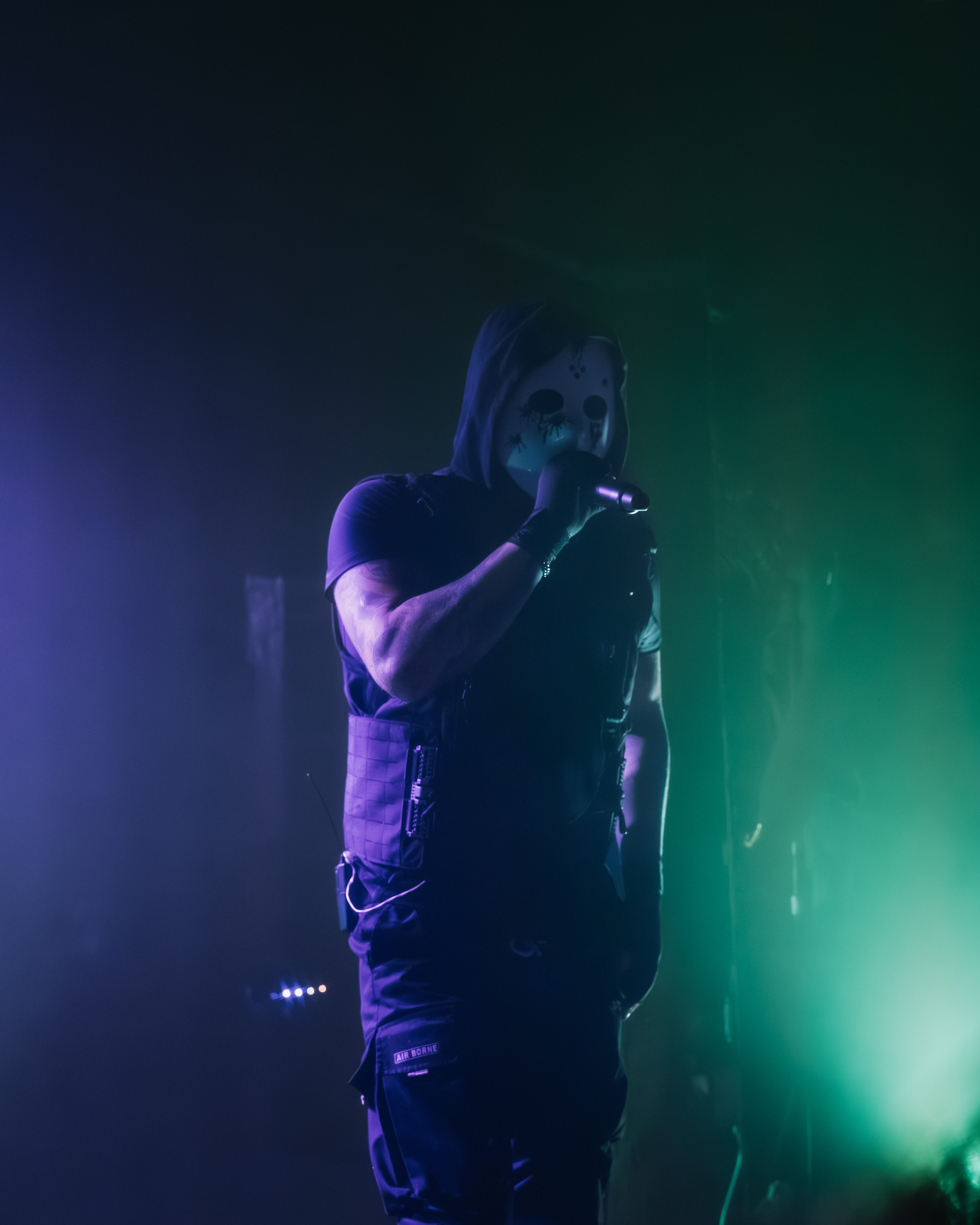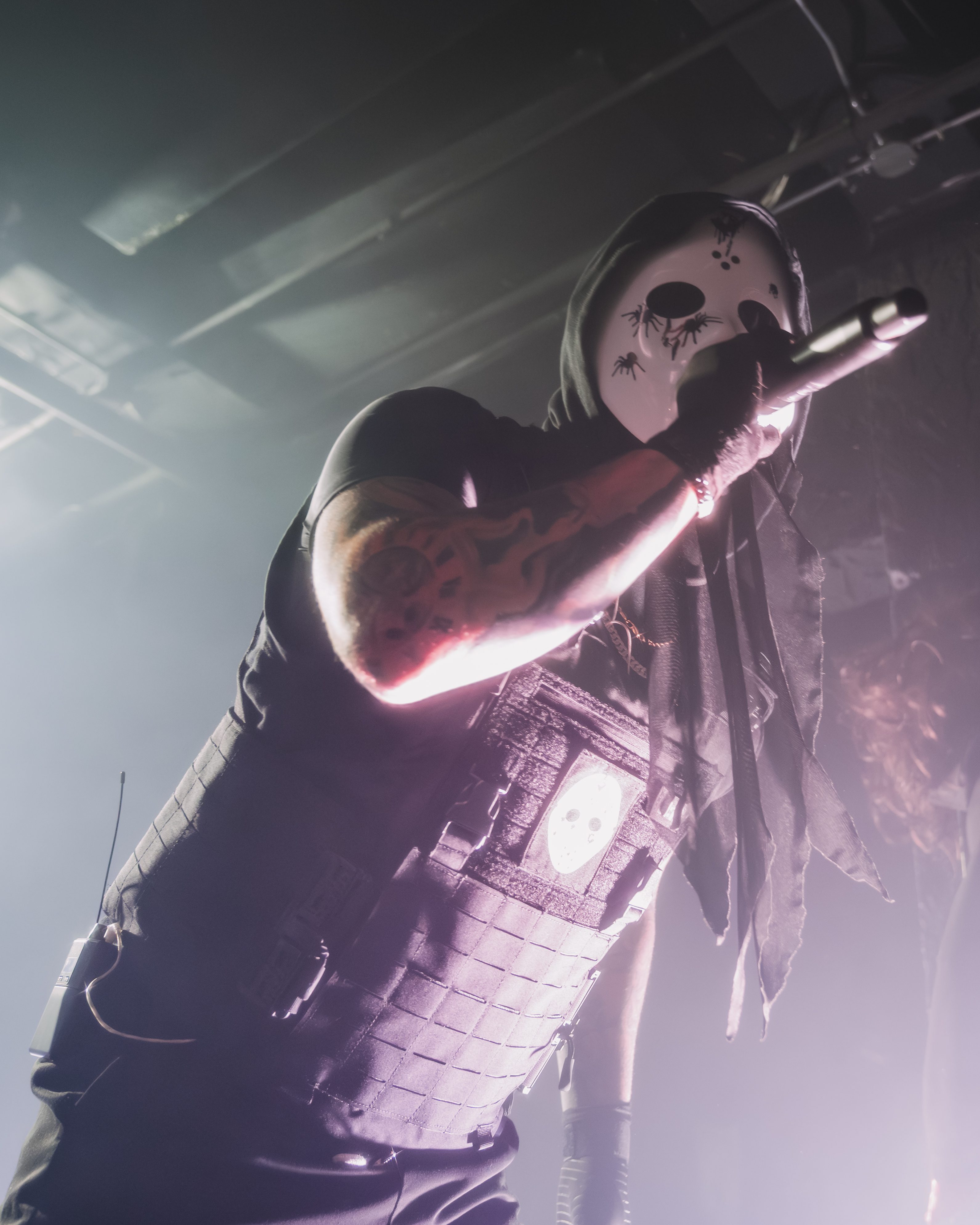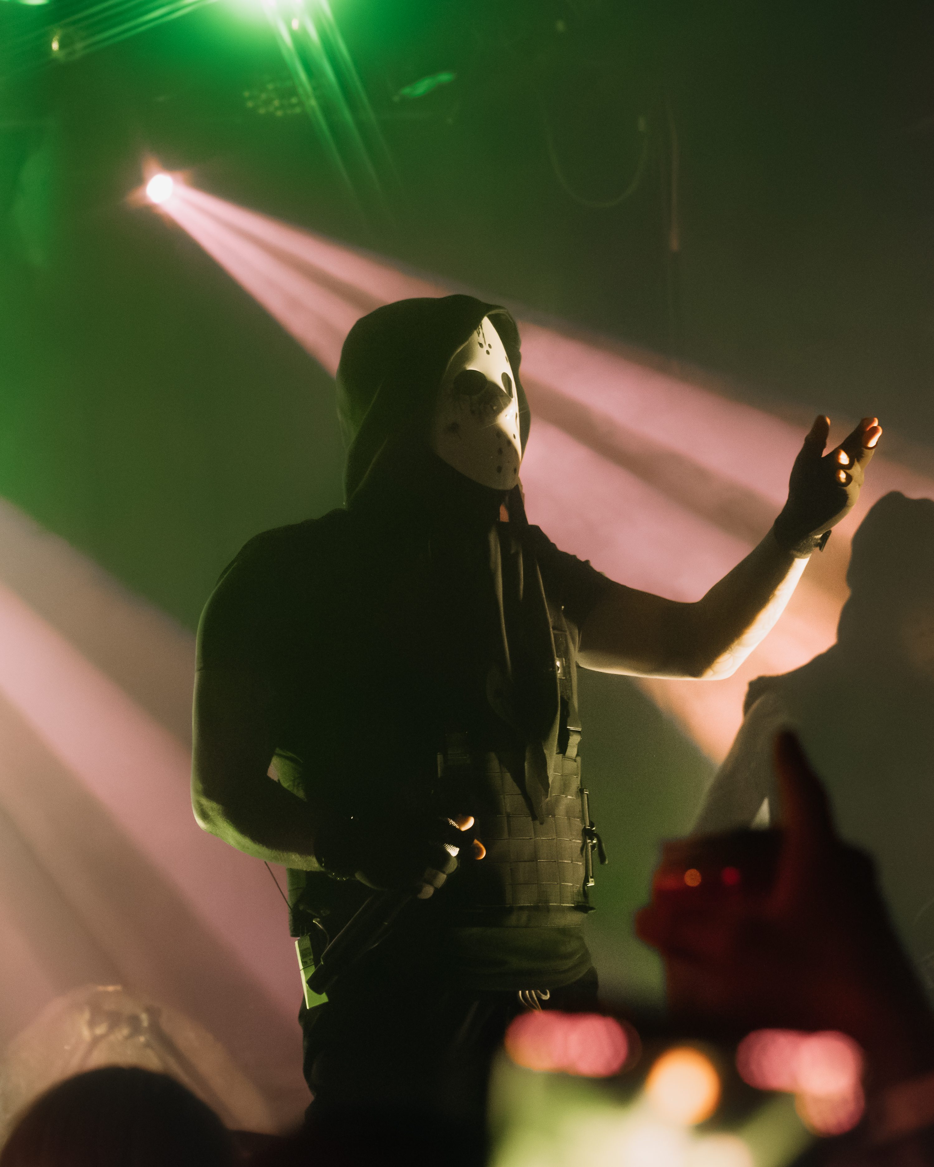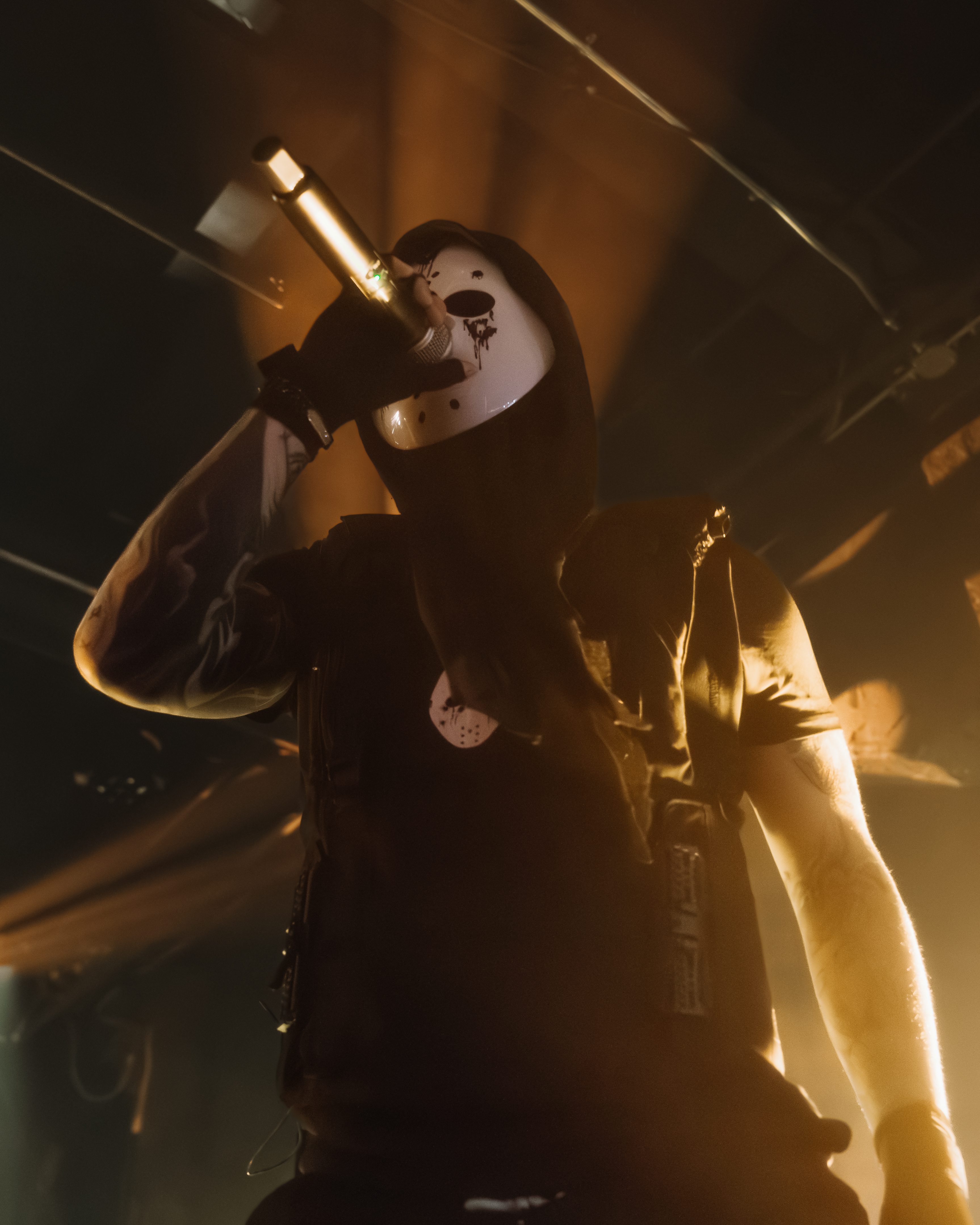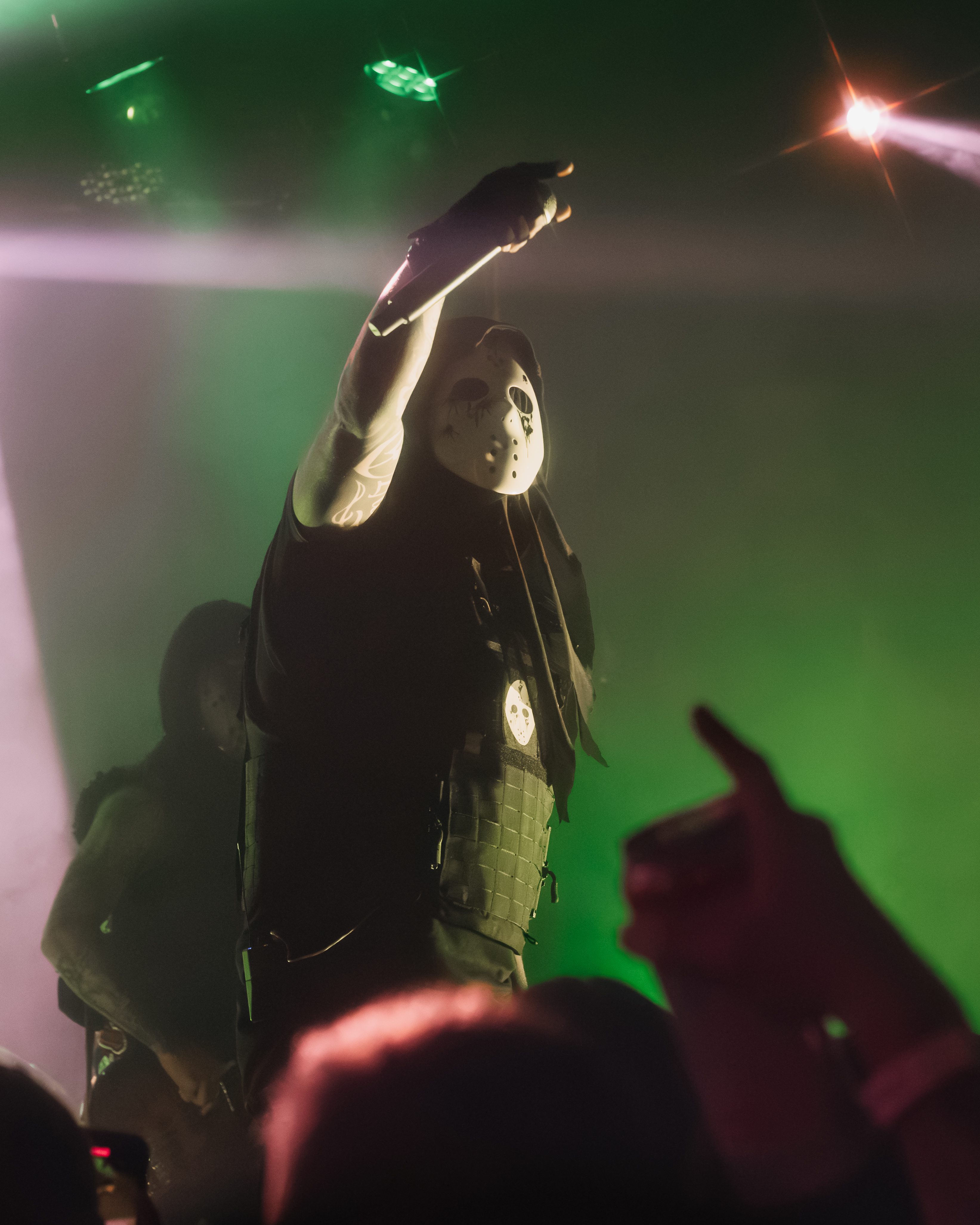 The opener, Resentvul, came out wearing a black ski mask like he’d just robbed a gas station. His DJ was decked out in a red sequined “Scream” mask that caught the lights like a disco ball from hell. The set hit fast and raw, a 30-minute barrage that felt like getting stomped in the back of a van. Then—silence. The kind of silence that trembles with anticipation. It was time.
