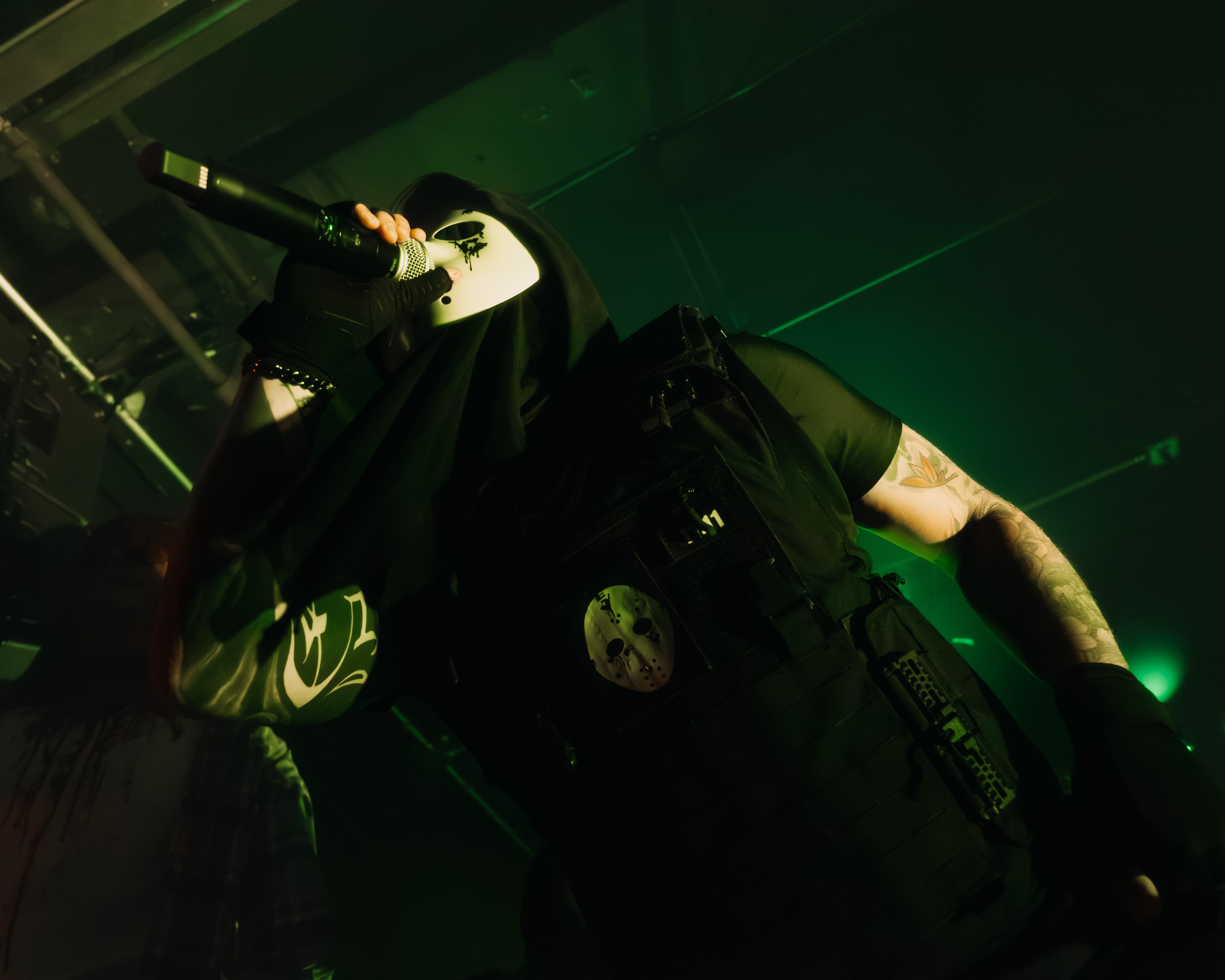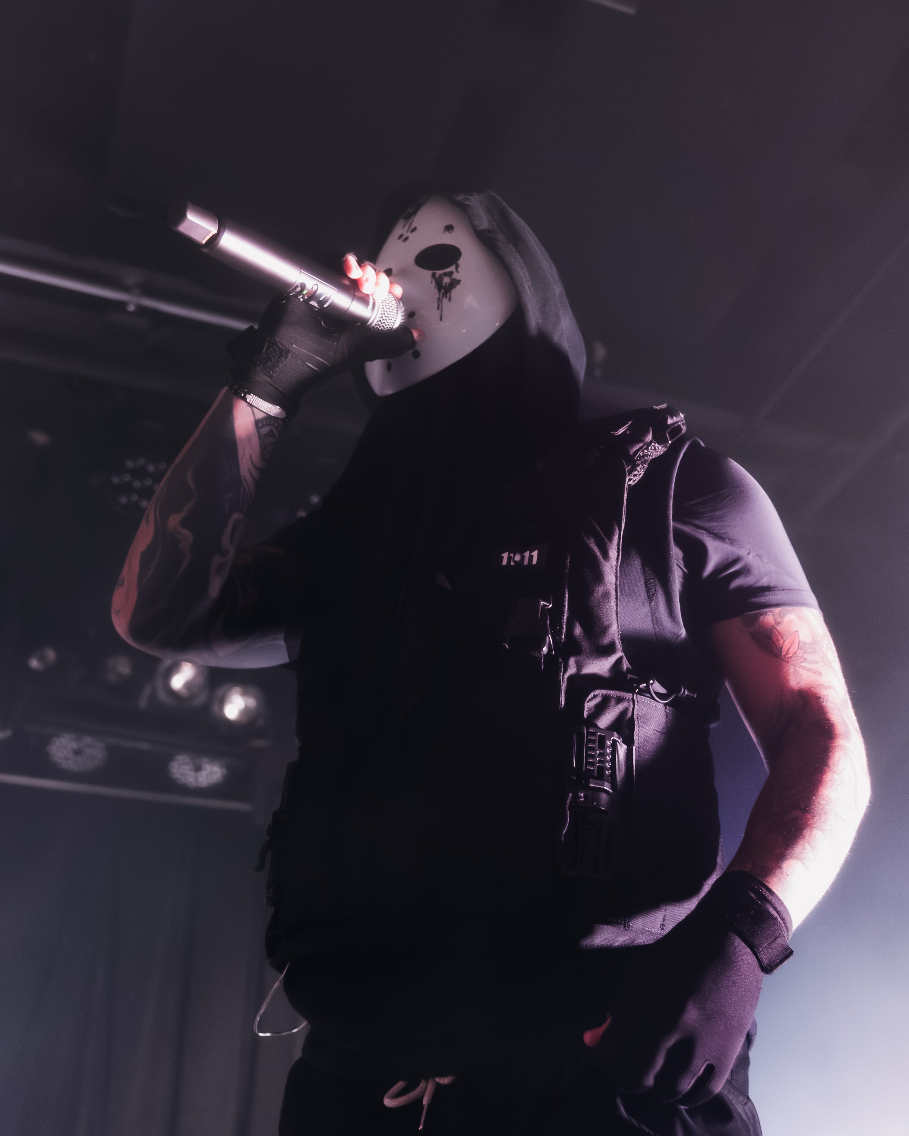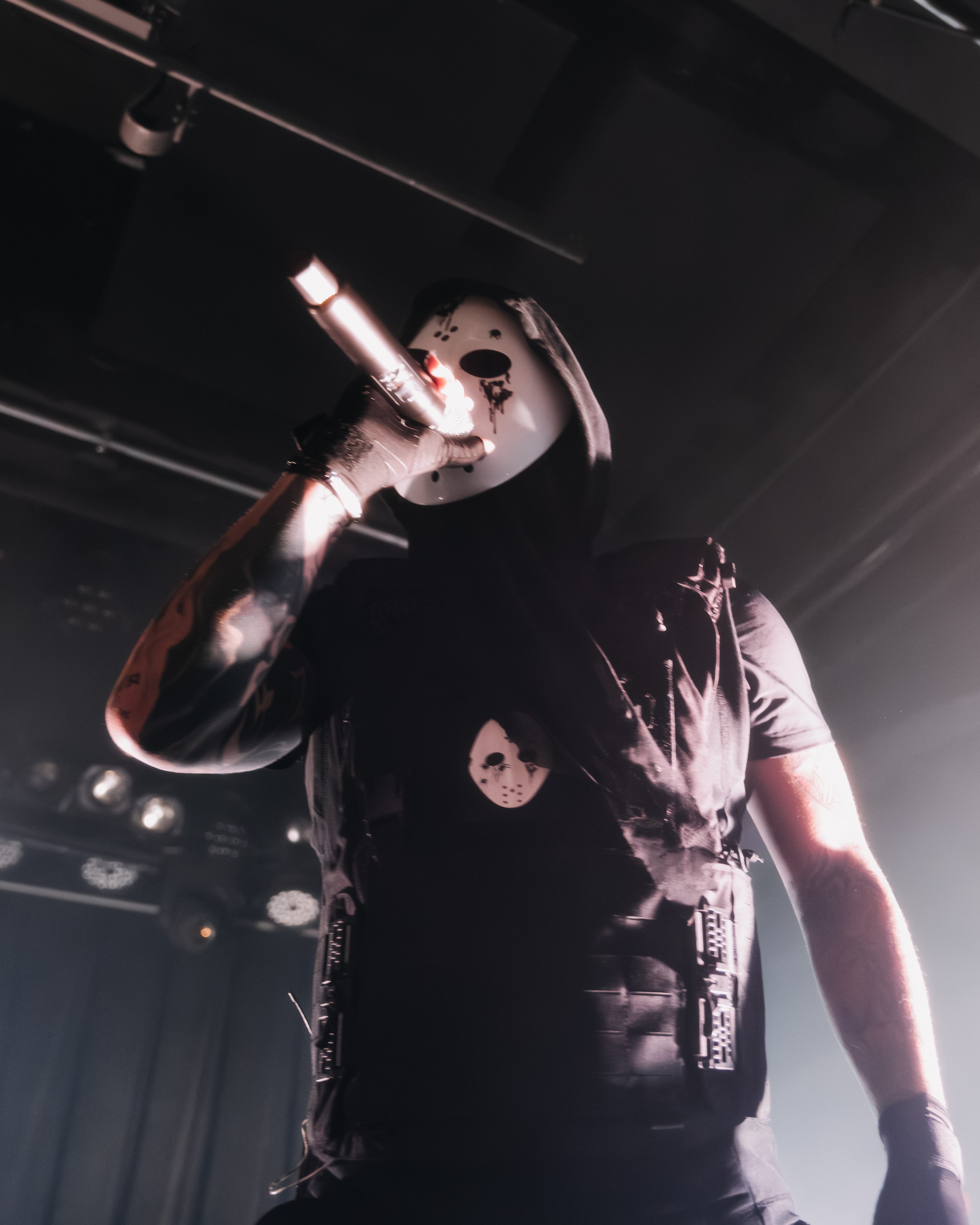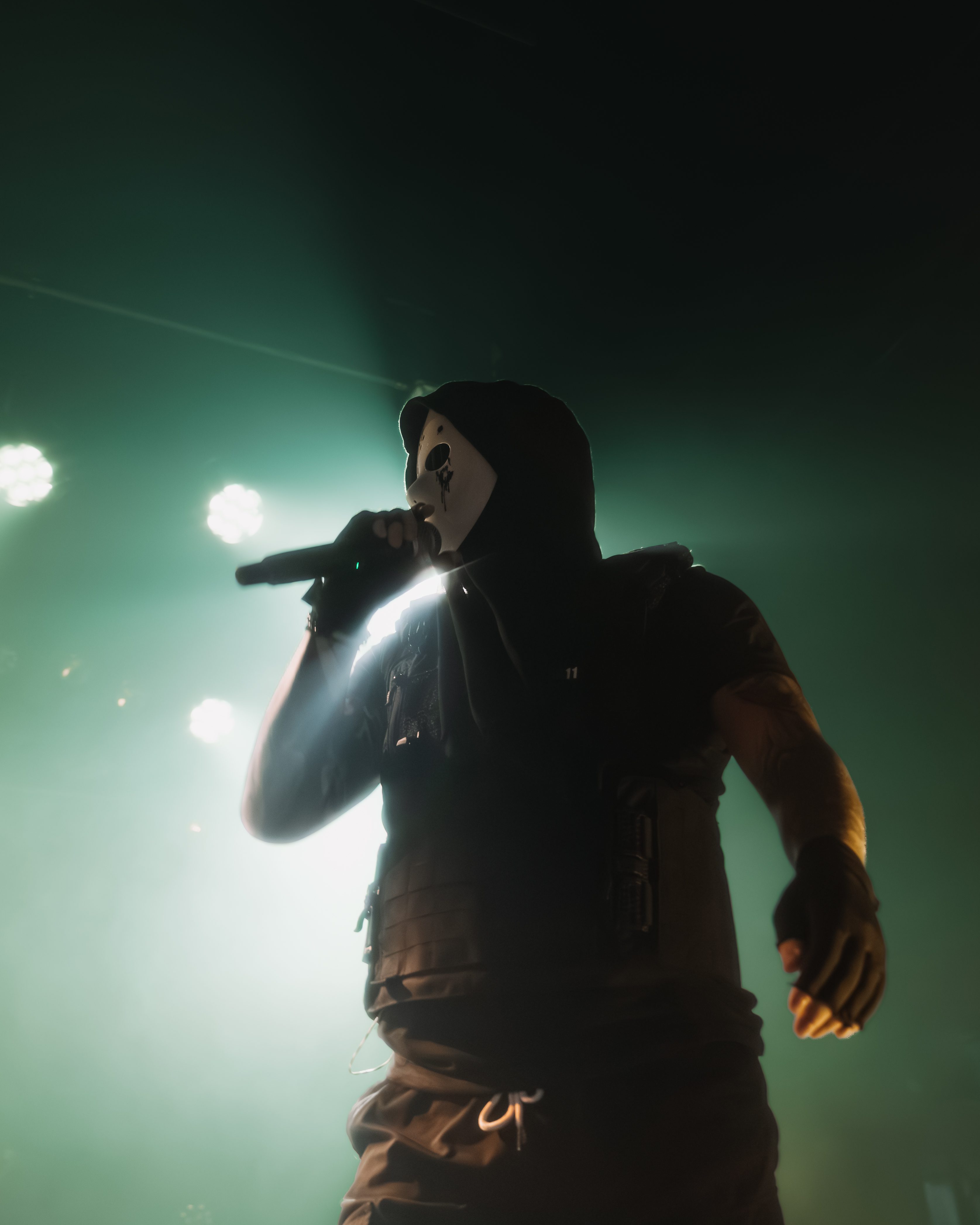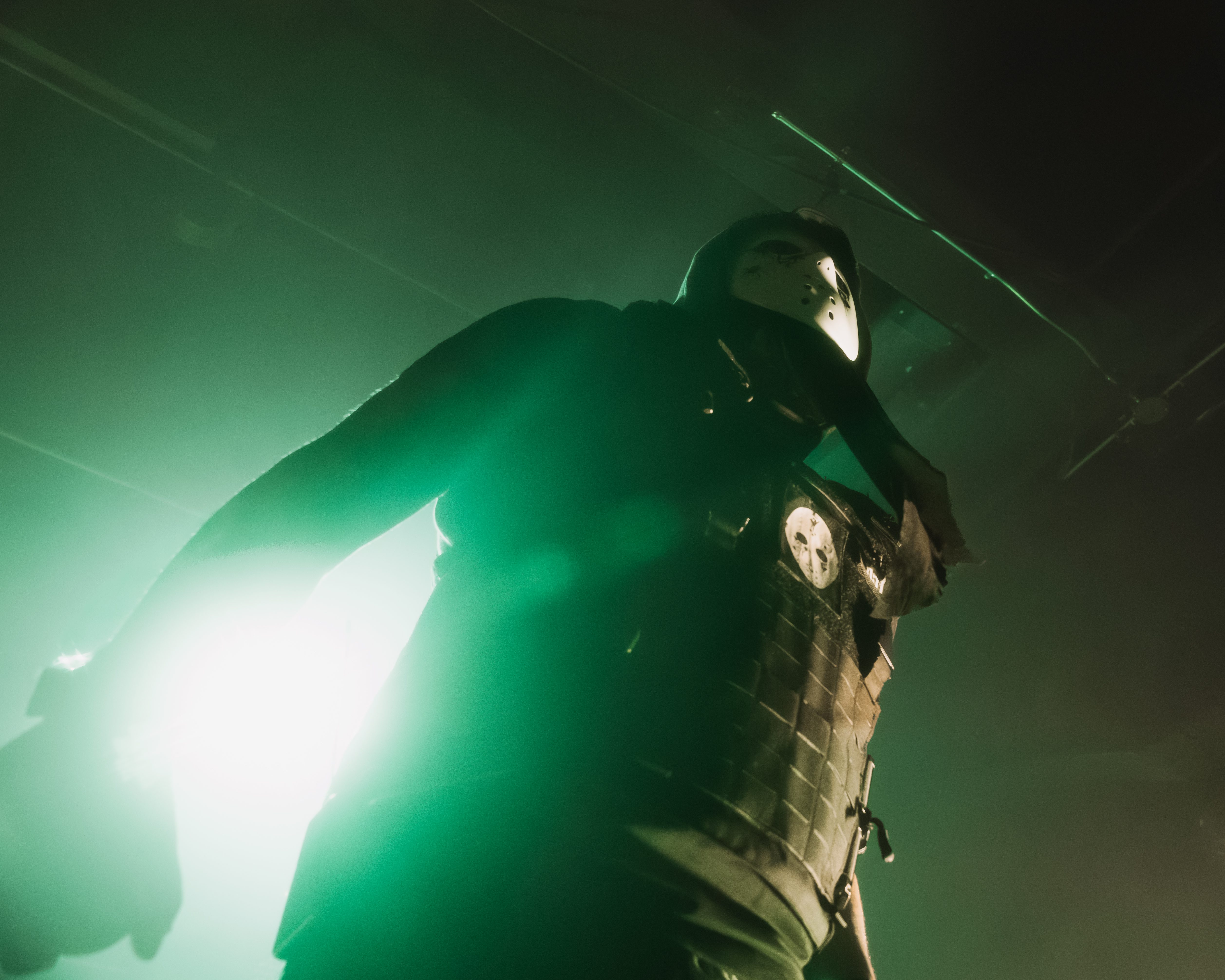 The opener, Resentvul, came out wearing a black ski mask like he’d just robbed a gas station. His DJ was decked out in a red sequined “Scream” mask that caught the lights like a disco ball from hell. The set hit fast and raw, a 30-minute barrage that felt like getting stomped in the back of a van. Then—silence. The kind of silence that trembles with anticipation. It was time.