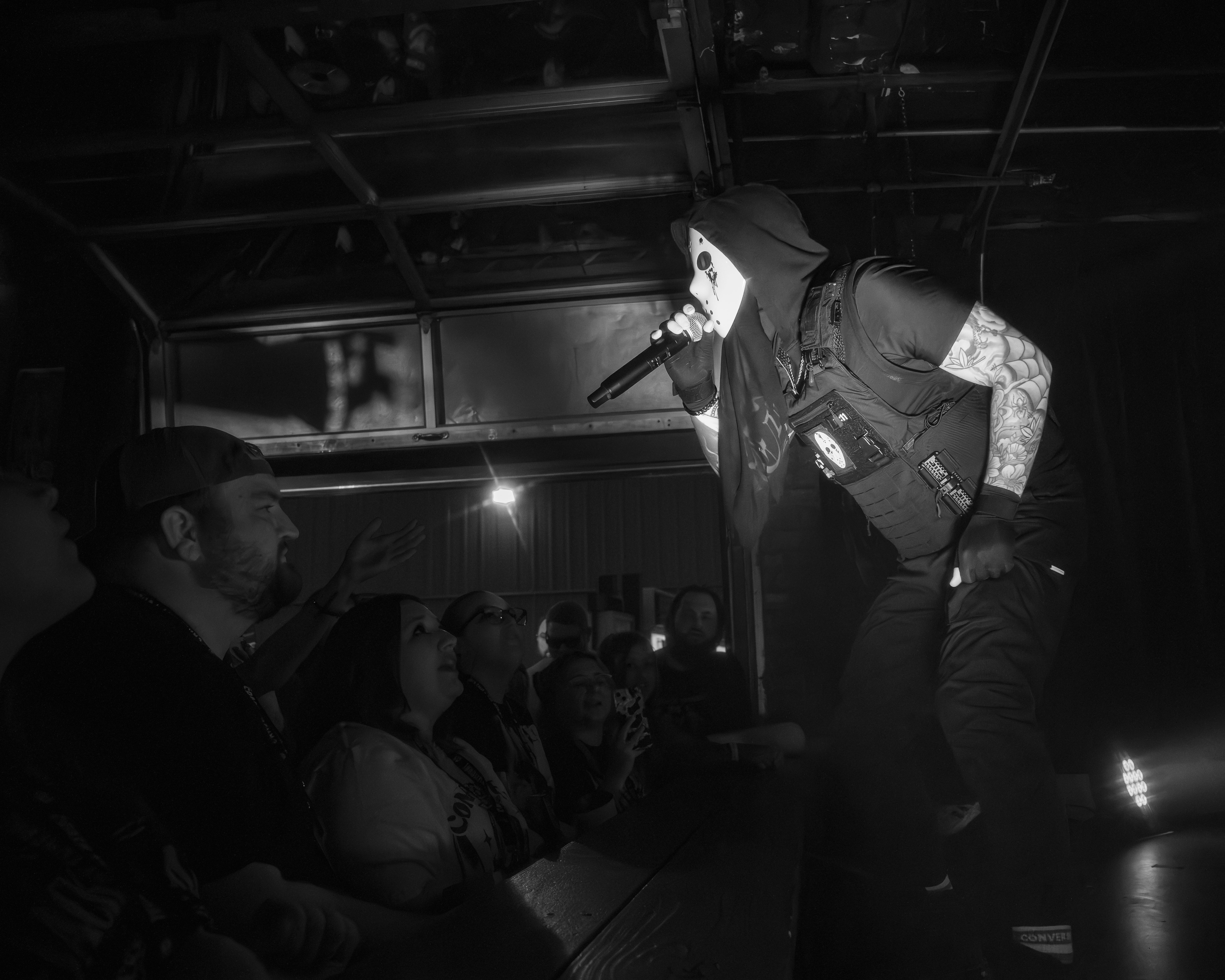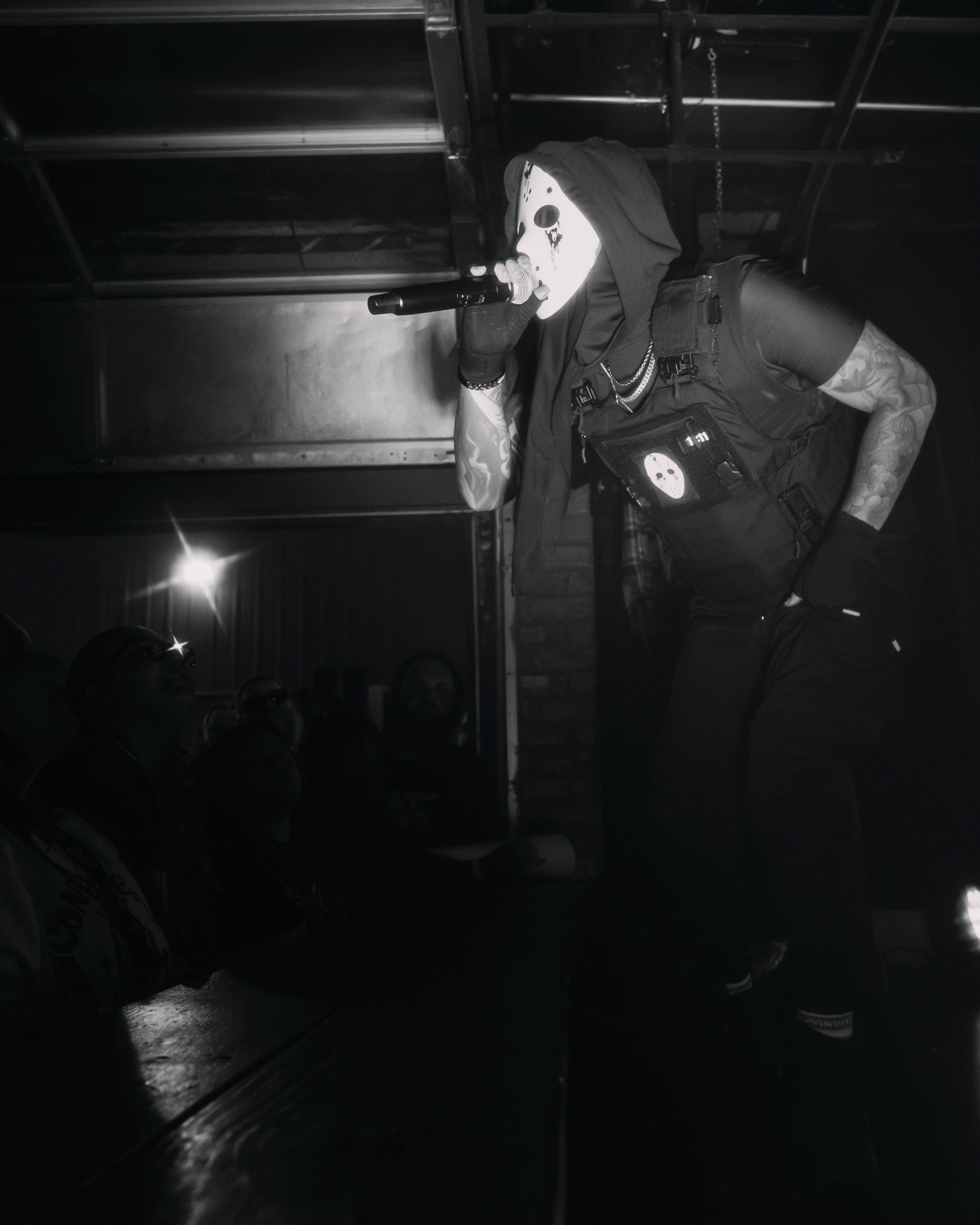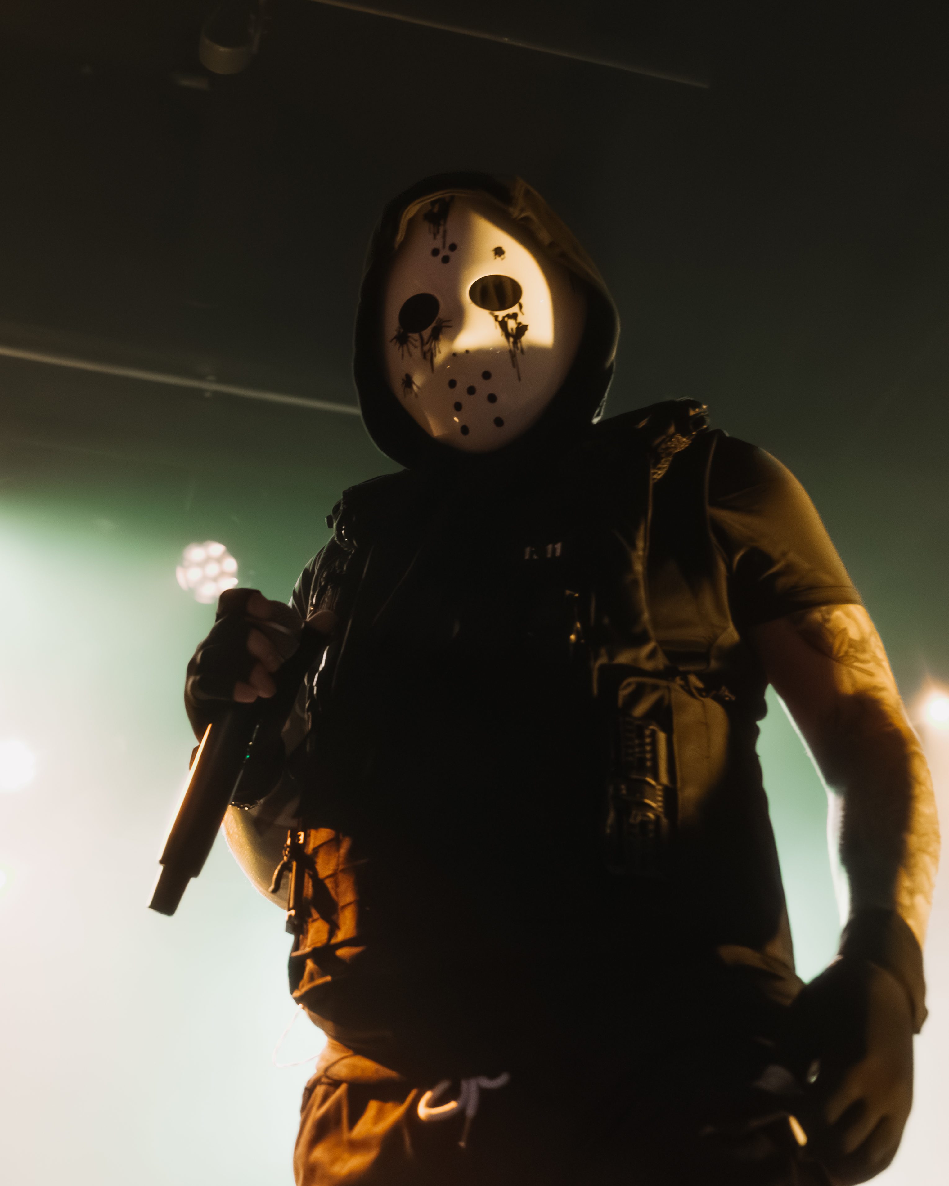 Diggy Graves stepped into the stage lights like a villain in a slasher film. Modified Jason mask. Bulletproof vest with another Jason mask duct-taped to the front. It was grim, theatrical, absurd and somehow… magnetic. The man has presence. Not just “I’m a rapper” presence. Cult leader presence. “Drink the Kool-Aid and you’ll see God” presence.