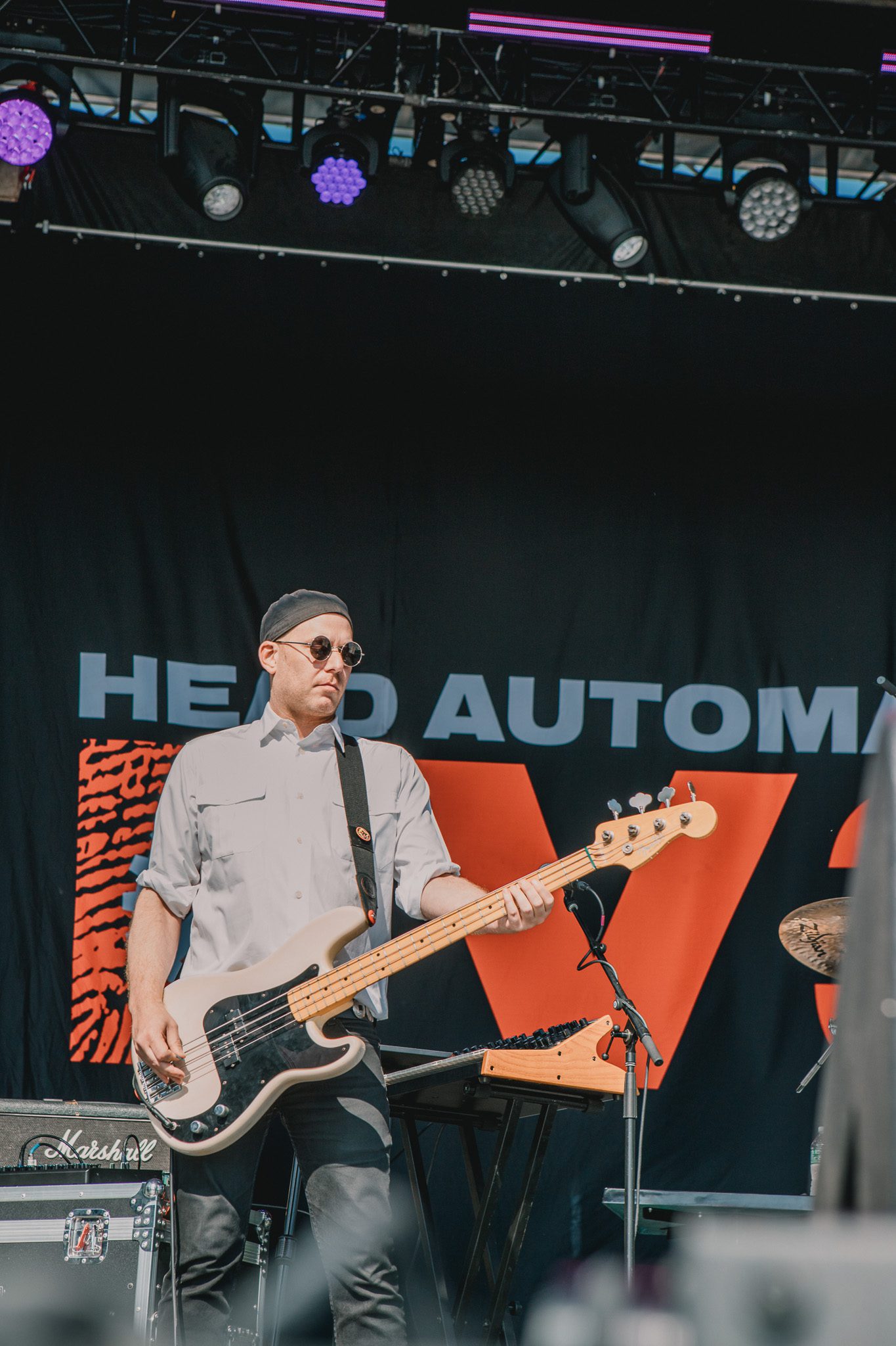 Crowd enjoying a live performance by Head Automatica at the Great South Bay Music Festival, with a vibrant stage and blue sky in the background.