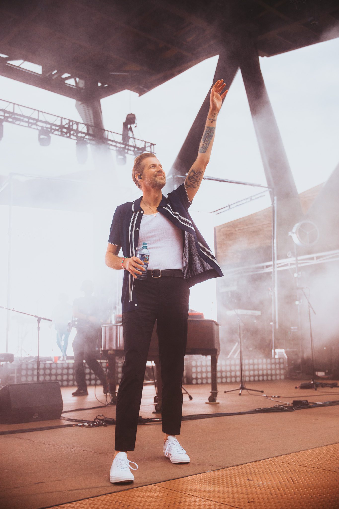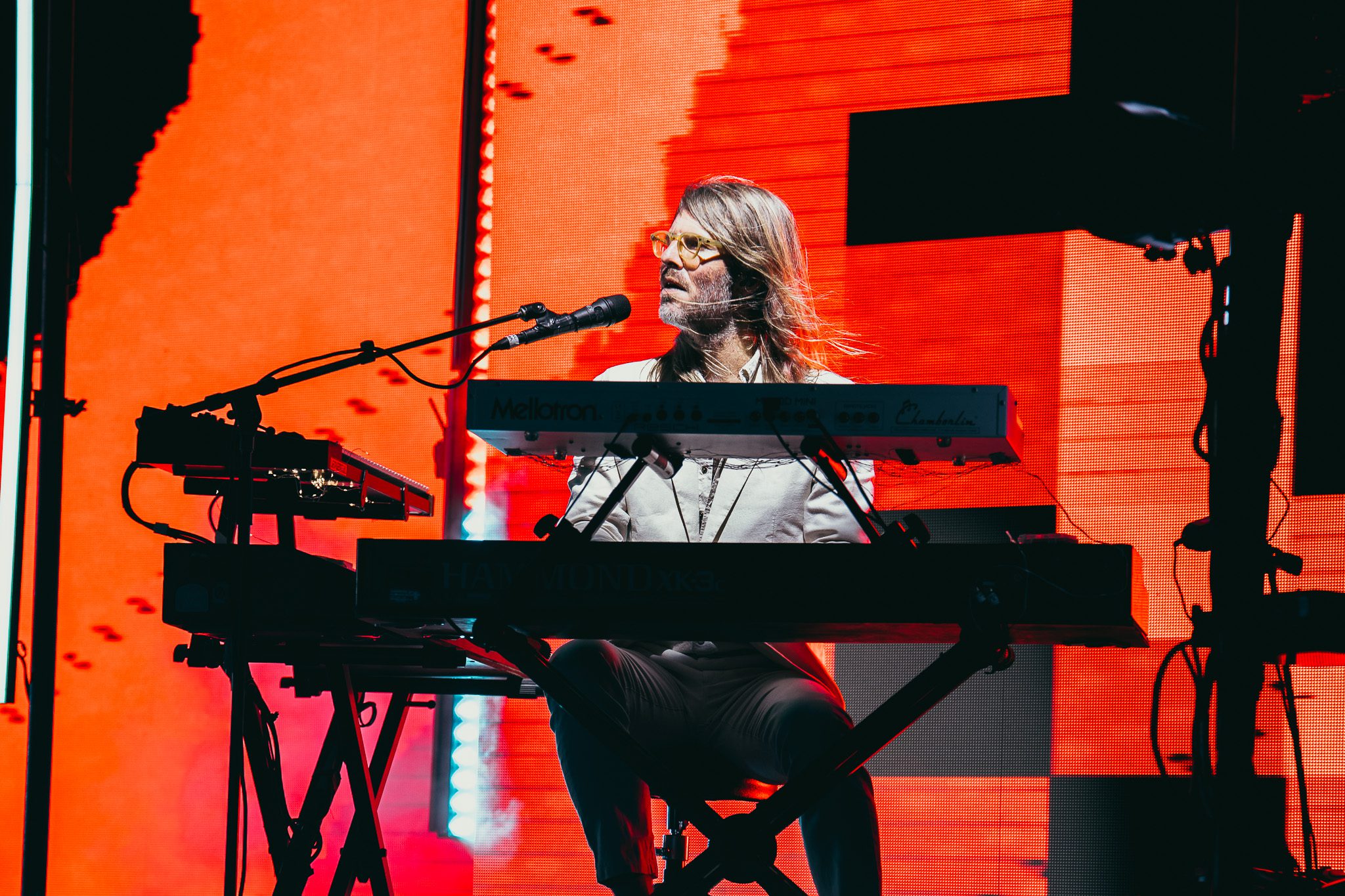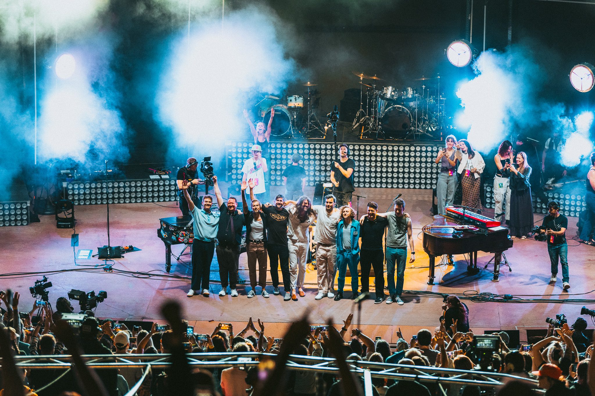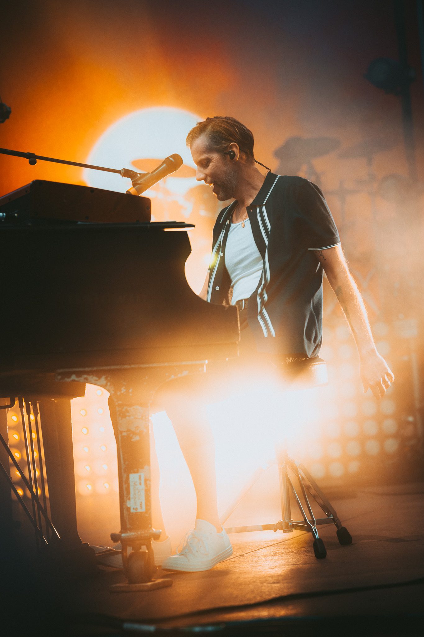 Another piano appeared on screen, his next love letter unfolding. “This was our moment, the two of us, my young family and a new band of old friends criss crossing the continent on a new mission. Could I do it better this time? Could I fight for a dream without losing myself along the way? There were so many questions in those bright uncertain days, but none more pressing than this: Would this fickle world of noise permit another name change, another sound?” The answer to those questions was a resounding yes—words speaking, of course, to McMahon’s most recent and current project, Andrew McMahon in the Wilderness, a project that would go on to redefine his career and deliver his biggest success yet. The band took the stage, kicking off the set with “Love and Great Buildings,” and continuing with favorites like “High Dive” and “Maps For The Getaway.” “Canyon Moon” was a necessary choice given the setting, and McMahon took to the crowd during the song, climbing the many steps of the venue without missing a beat. He shared that it has always been a dream to play a huge venue outside in the summer because there is something so magical about it. Josh Partington joined the band for “Little Disaster,” a track from the most recent Wilderness album, Tilt At The Wind No More, and Zac Clark featured on a verse of “Island Radio,” which he co-wrote with McMahon. McMahon jokingly noted that there was “only one song left” for the night, before closing out the Wilderness set dancing beneath a vibrant parachute in the middle of the crowd for “Synesthesia.”