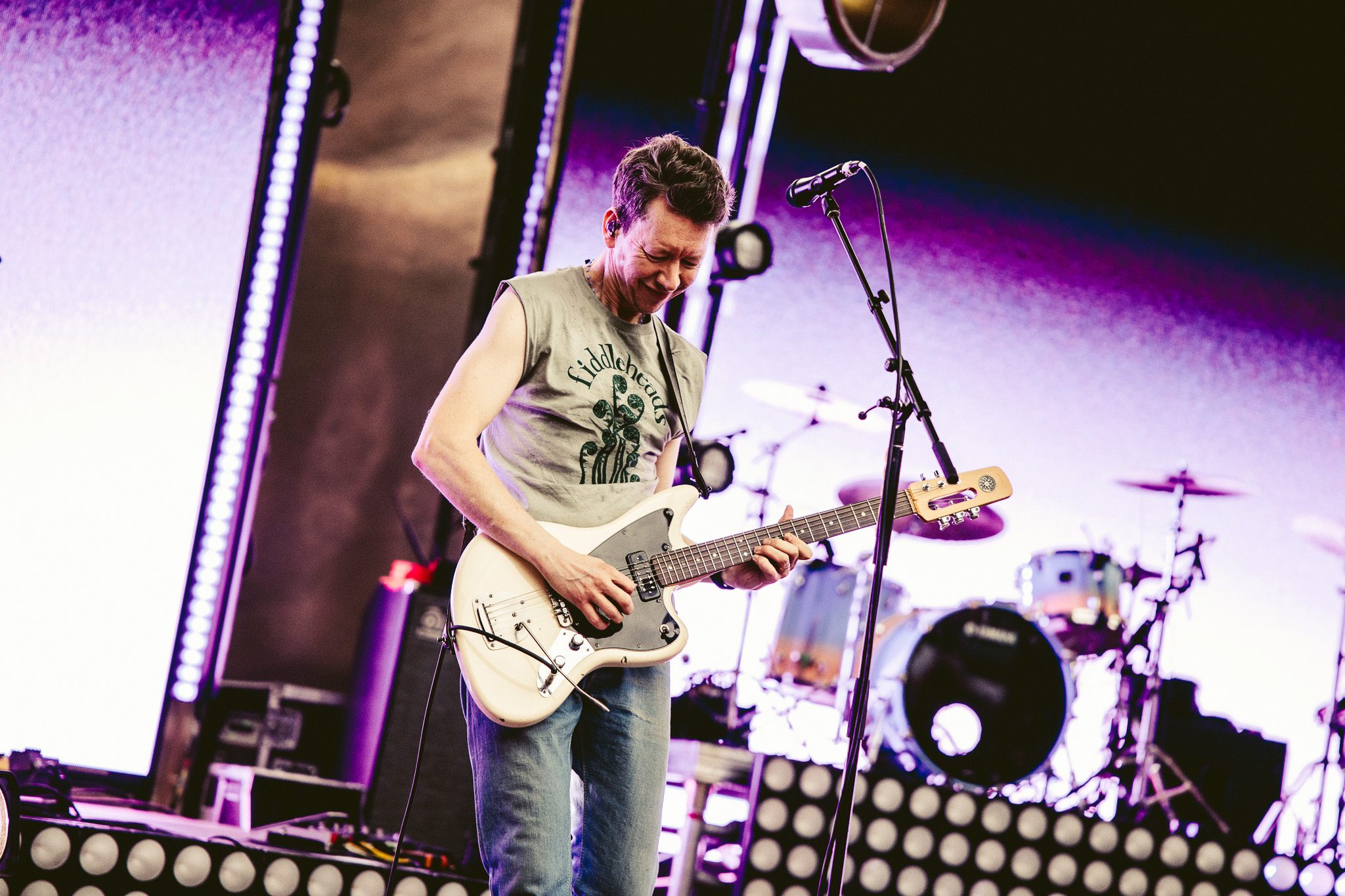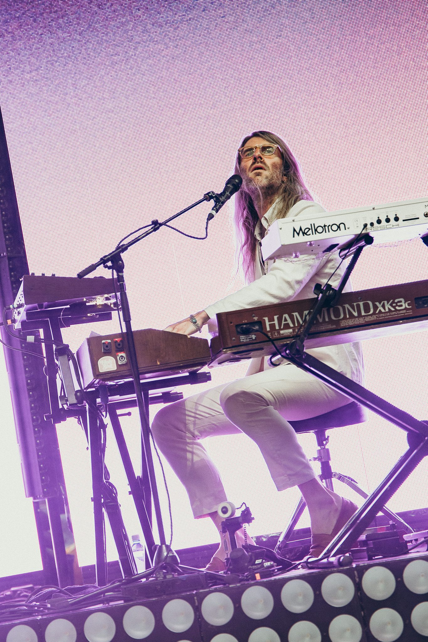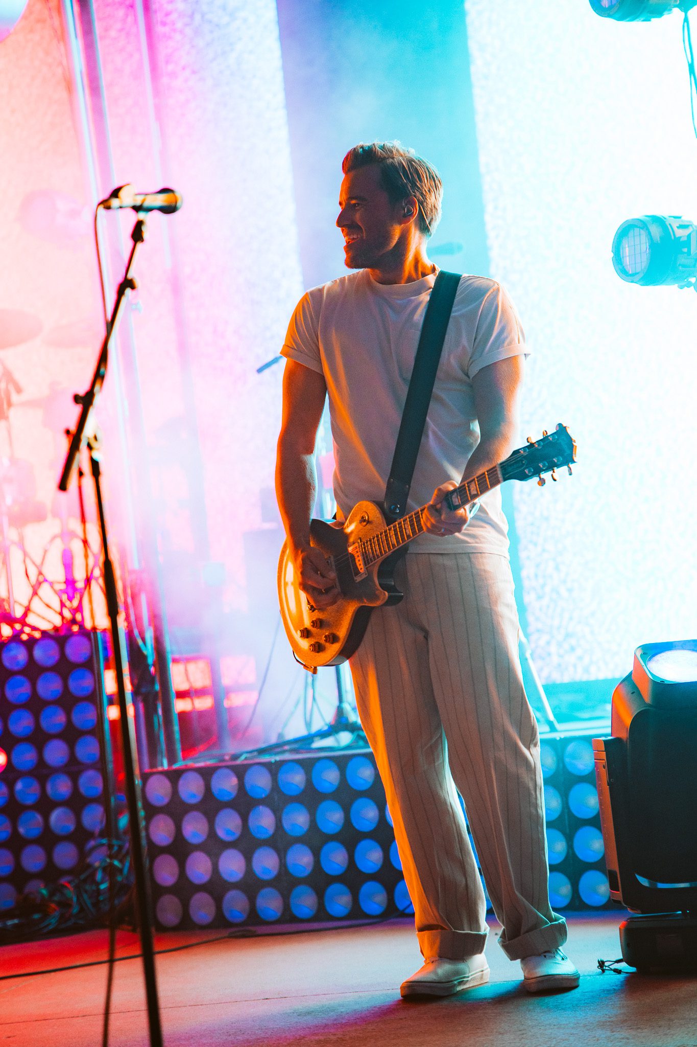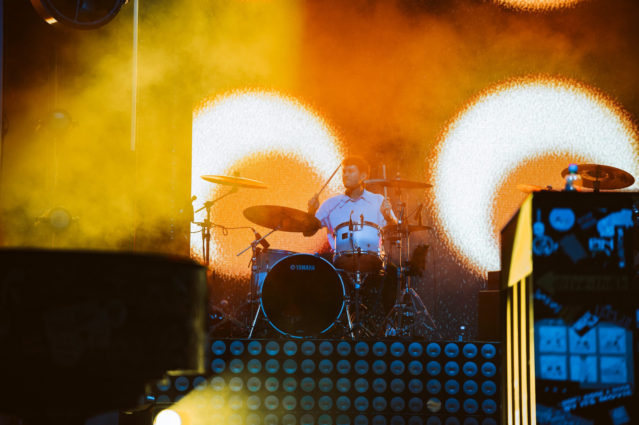 Another piano appeared on screen, his next love letter unfolding. “This was our moment, the two of us, my young family and a new band of old friends criss crossing the continent on a new mission. Could I do it better this time? Could I fight for a dream without losing myself along the way? There were so many questions in those bright uncertain days, but none more pressing than this: Would this fickle world of noise permit another name change, another sound?” The answer to those questions was a resounding yes—words speaking, of course, to McMahon’s most recent and current project, Andrew McMahon in the Wilderness, a project that would go on to redefine his career and deliver his biggest success yet. The band took the stage, kicking off the set with “Love and Great Buildings,” and continuing with favorites like “High Dive” and “Maps For The Getaway.” “Canyon Moon” was a necessary choice given the setting, and McMahon took to the crowd during the song, climbing the many steps of the venue without missing a beat. He shared that it has always been a dream to play a huge venue outside in the summer because there is something so magical about it. Josh Partington joined the band for “Little Disaster,” a track from the most recent Wilderness album, Tilt At The Wind No More, and Zac Clark featured on a verse of “Island Radio,” which he co-wrote with McMahon. McMahon jokingly noted that there was “only one song left” for the night, before closing out the Wilderness set dancing beneath a vibrant parachute in the middle of the crowd for “Synesthesia.”