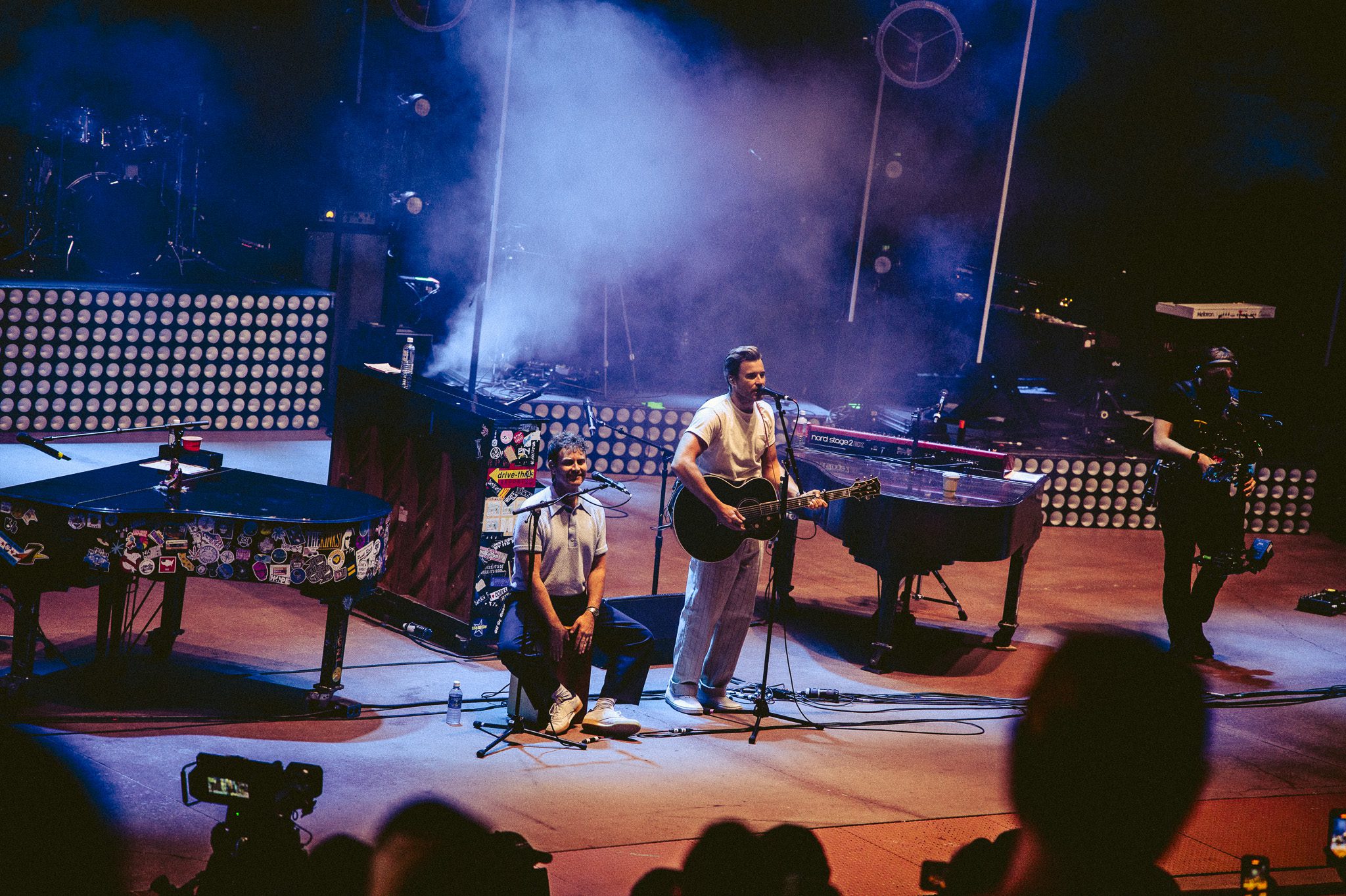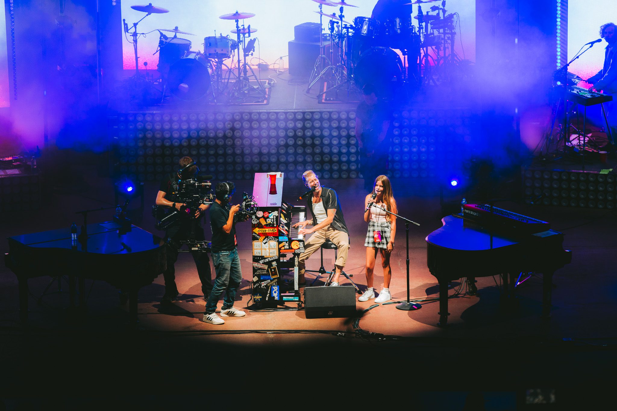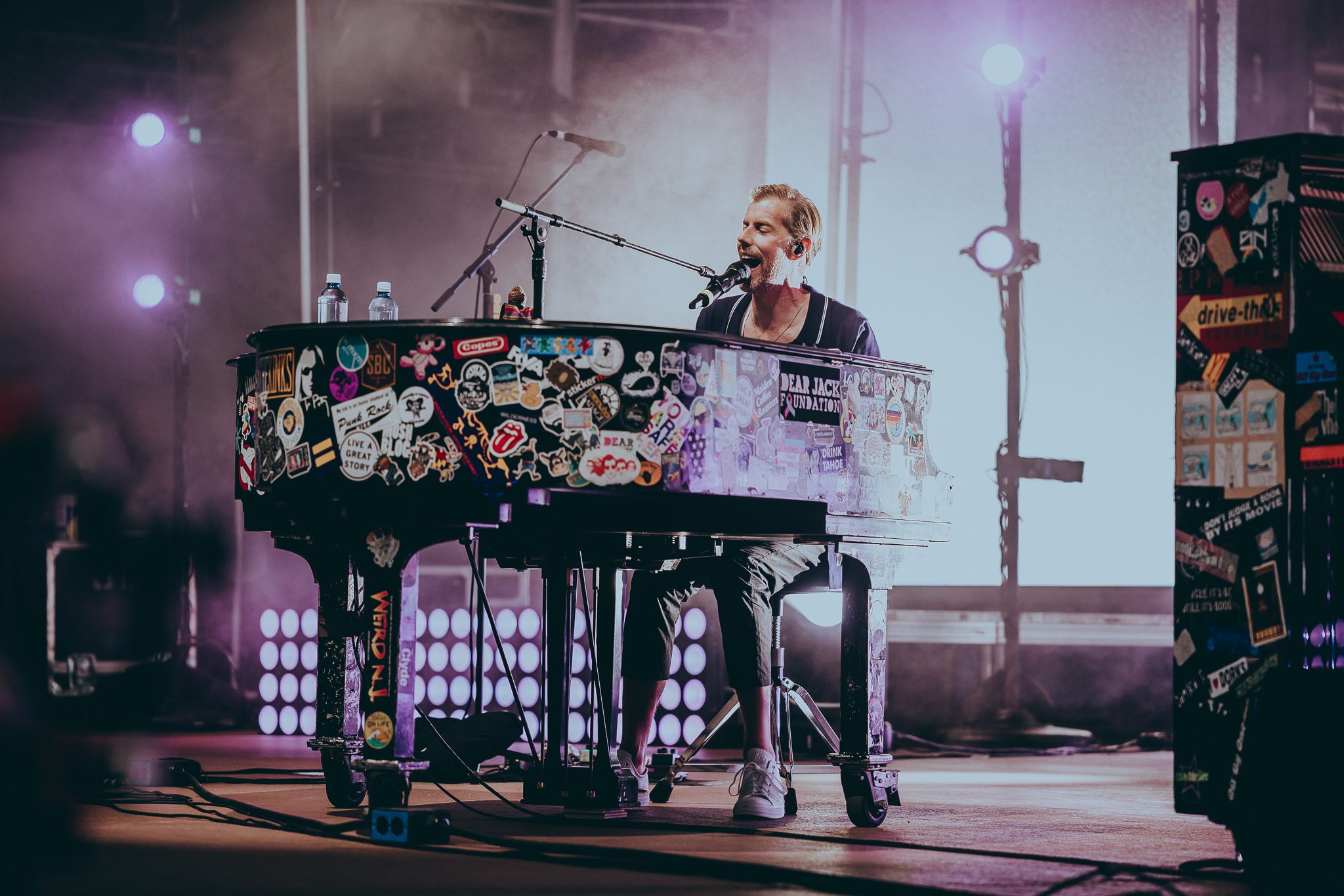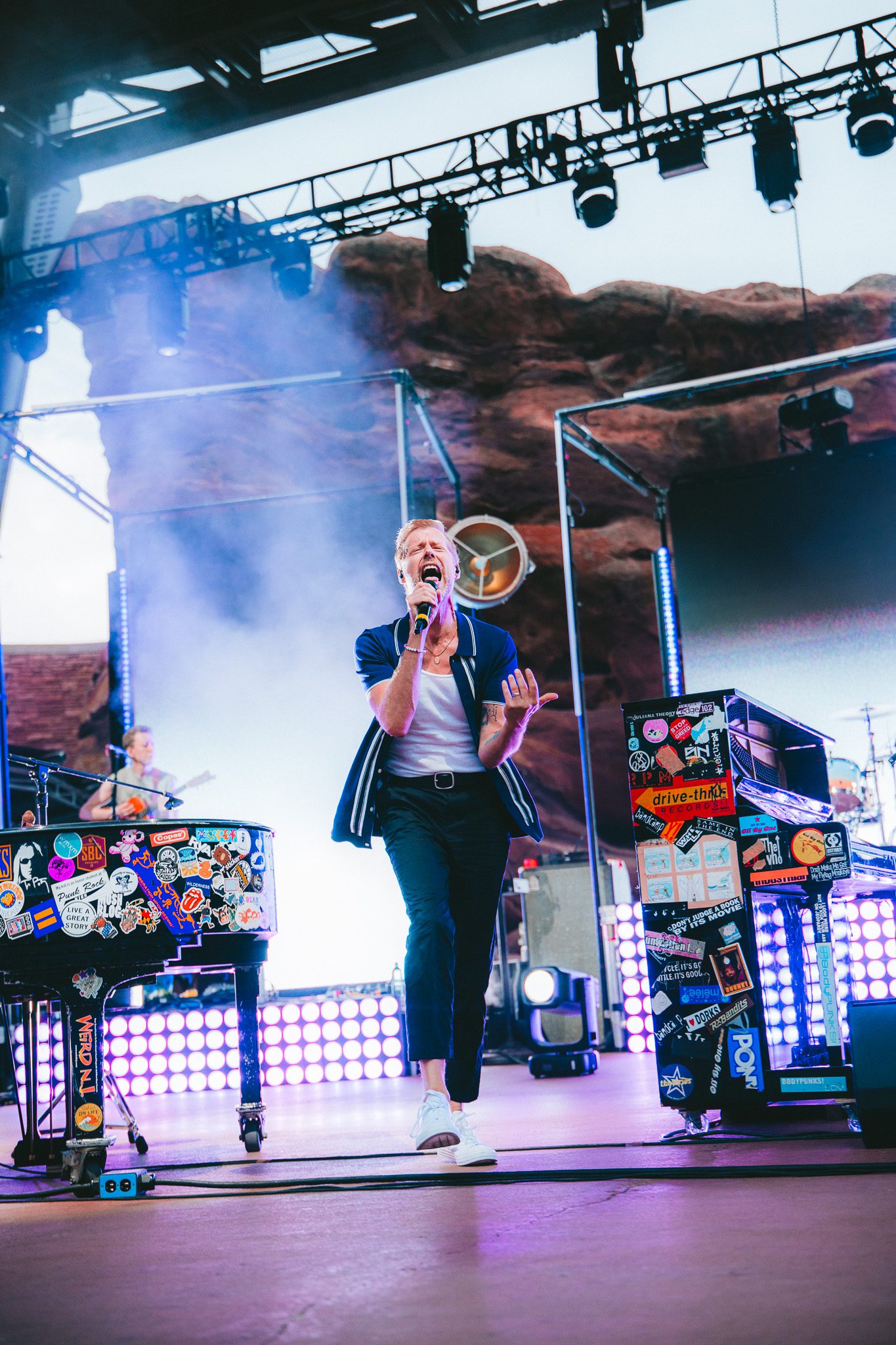 When the week finally arrived, it wasn’t just a one-night experience—it was preceded by a series of “Prelude to the Pianos” gatherings that set the stage for the main show. Fans had plenty of chances to connect and celebrate, including several Dear Jack events benefiting Andrew’s nonprofit which supports young adults with cancer. Highlights included a casual hangout at a Rockies game where Josh from Something Corporate made an appearance, and a pre-show party at the Skylark Lounge that offered the opportunity to shop event specific merch ahead of the show. Band members mingled freely at these events, with Clutch dropping by the Skylark Lounge to spend time with fans. On the day of the concert, Dear Jack hosted a picnic at the Red Rocks Trading Post, creating yet another opportunity for the community to come together, learn how Dear Jack is supporting young adults with cancer, and share in the excitement leading up to the monumental night. At this event, attendees enjoyed food and beverage while writing letters with love and learning about Dear Jack’s mission. It was also at this event that we learned United airlines would be matching up to 25,000 dollars in donations made that evening. Each of the events had a family reunion type feel, with friends from all over the world reuniting, sharing stories, laughter, and a deep bond forged through years of Andrew McMahon’s music and the memories it has created.