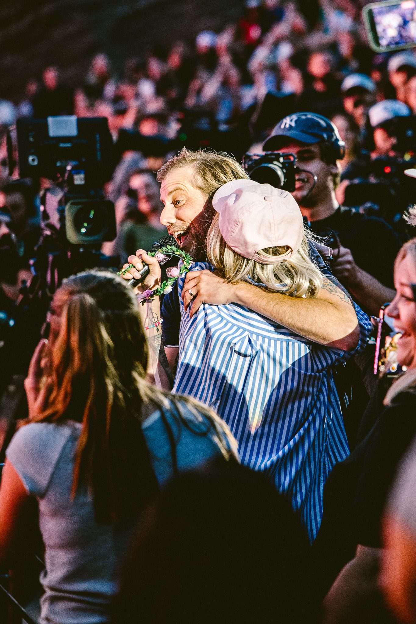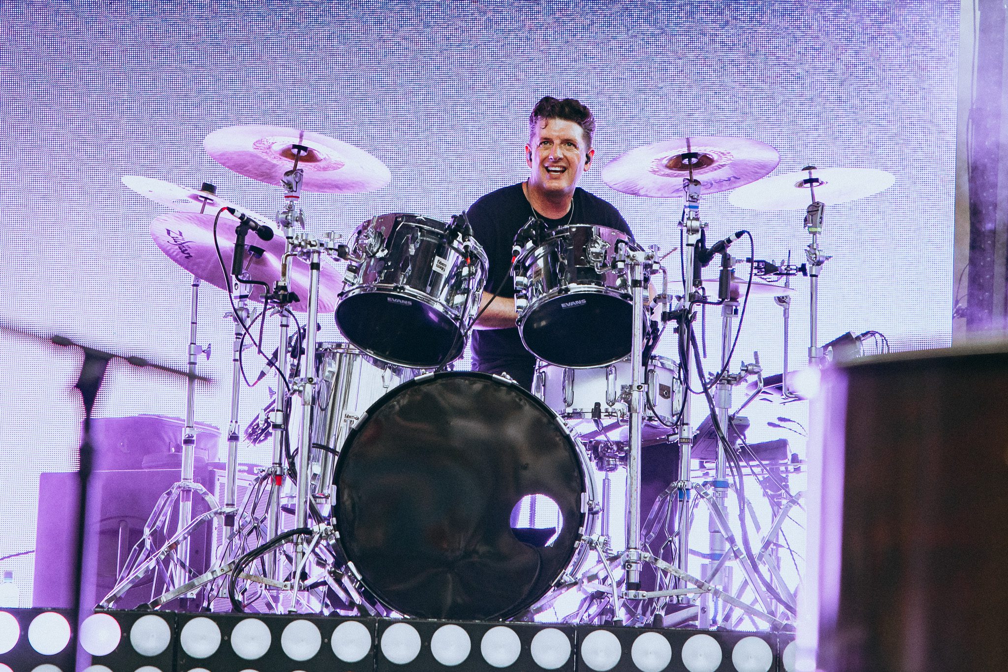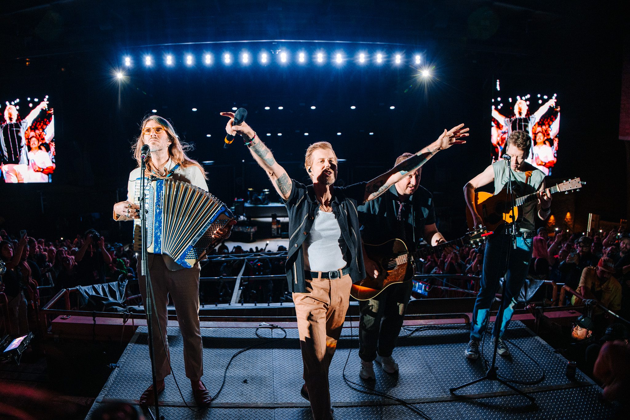 Excited chatter echoed through the venue as fans unpacked their emotions with friends and family, curious about how the rest of the evening would unfold now that each band had taken the stage. As the countdown expired, William Tell and Brian Ireland of Something Corporate stepped onto the stage. Those who attended the Holiday From Real cruise knew exactly what was about to unfold— a highly anticipated reunion of best friends for a “short but serious” stripped down rendition of the “Thong Song”, which Brian jokingly referred to as the most important performance Red Rocks would ever see, followed by a cover of “I Love You Always Forever,” during which Red Rocks turned into a giant sing along. As they finished their performance, attention was drawn to the middle of the venue, where Andrew, Zac, Josh, and Bobby stood atop the B-Stage for an acoustic performance of “The Astronaut” and “Swim,” featuring Zac Clark on accordion. Before “Swim,” Andrew took a moment to recognize that this year marks 20 years cancer free, dedicating the song to anyone going through something, as well as giving a heartfelt dedication to his sister, Katie, who donated the bone marrow that would save McMahon’s life.