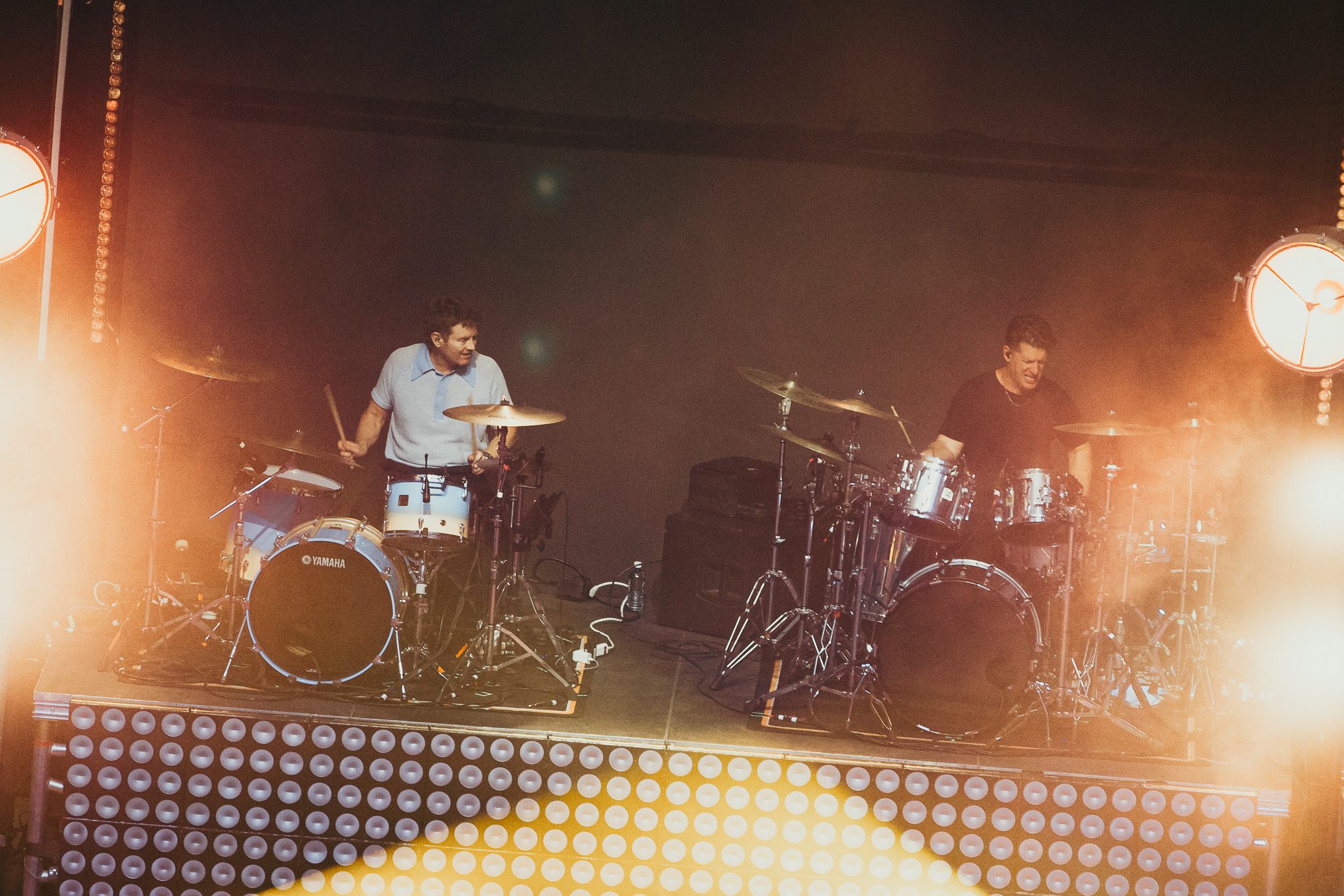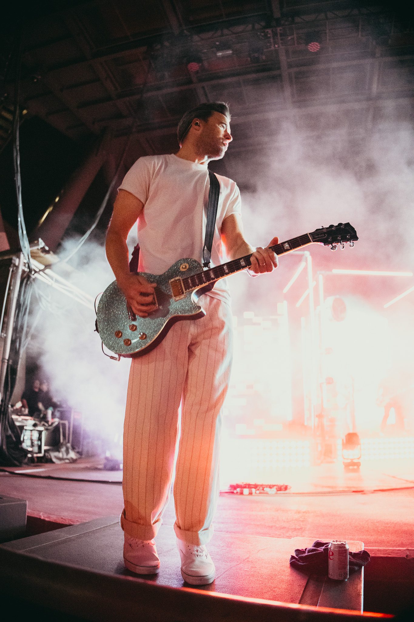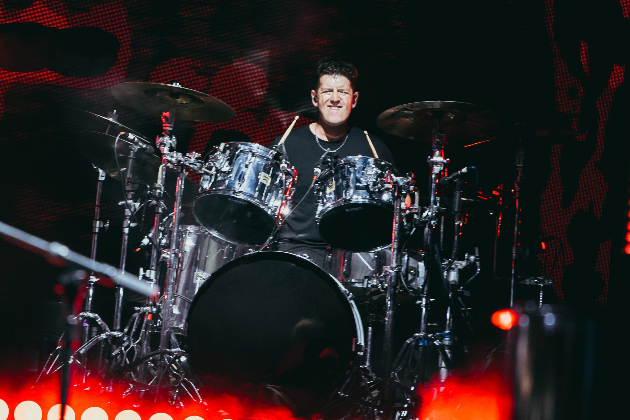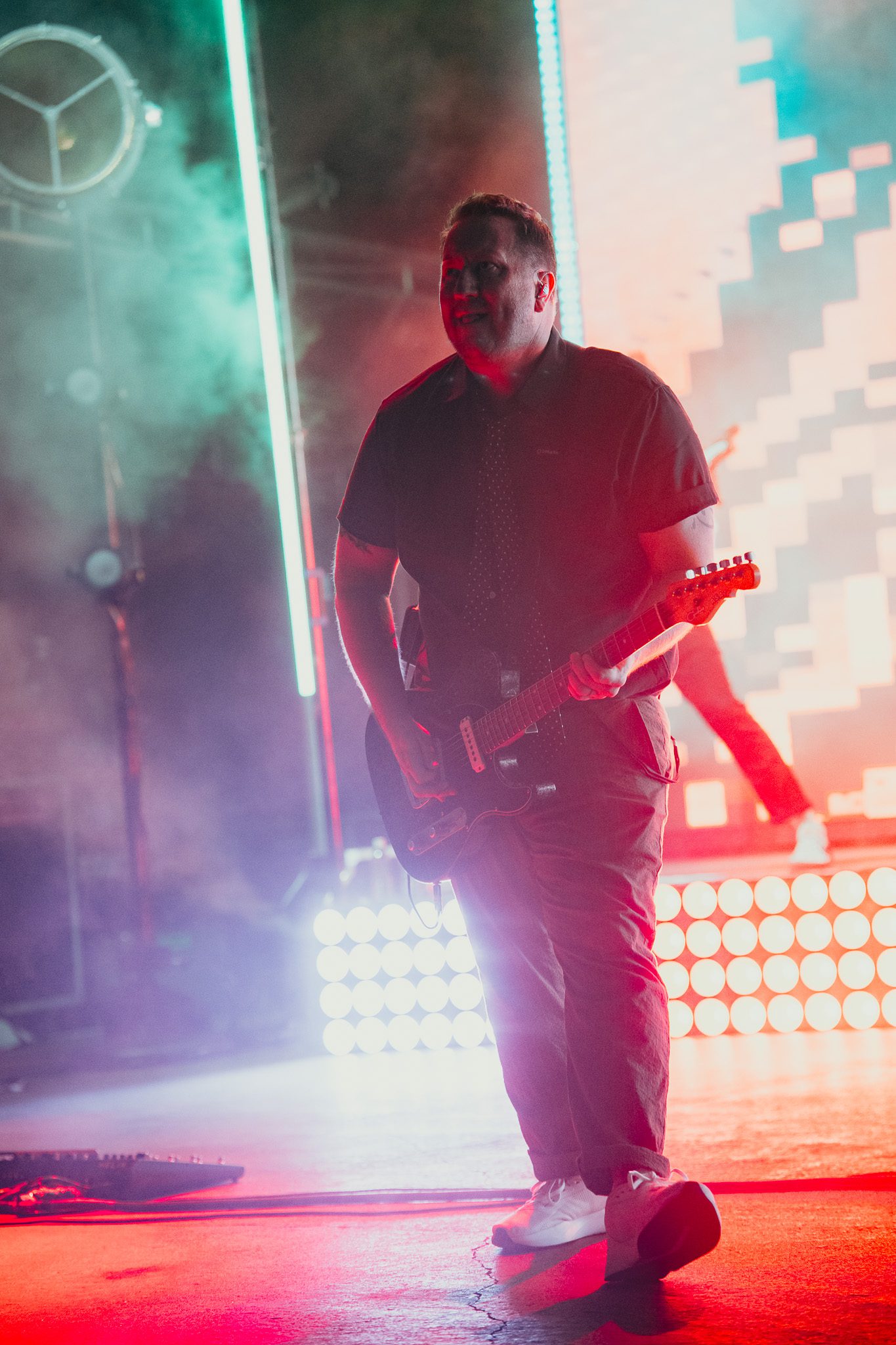The stage setup was reminiscent of the recent MFEO tour, with LED screens and platforms lining the back; however, this time, the stage featured five screens and platforms instead of three, with the center platform holding two drum kits. Three pianos sat center stage, one from each era of McMahon’s storied career. Smoke bellowed from the stage as a piano—the Jack’s Mannequin piano—appeared on the center screen, lyrics scrawled across the screens on either side, and a monologue played; a love letter of sorts to the piano. The monologue revealed a relationship both tumultuous and redemptive, with the piano’s worn keys bearing witness to fights, flaws, and ultimately, survival. The crowd erupted in cheers as McMahon took the stage, joined by Bobby, Mikey, and Jay, sitting down at the piano that carried him through years on the road with Jack’s Mannequin. The night would begin in the middle of his career with the band that just celebrated a huge milestone: 20 years as a band. The 8-song set would open with “The Resolution” before launching into “Holiday From Real,” which had the entirety of Red Rocks screaming “Fuck yeah, we can live like this!” in unison, middle fingers in the air. McMahon paused for a moment to take it all in, admitting this was “exciting and terrifying and everything all at once,” and needing a moment to ground himself in the beauty of Red Rocks. Longtime friend and bandmate Zac Clark was invited to the stage to join the band for “Spinning” and “Bloodshot,” and Josh Partington of Something Corporate, who was celebrating his birthday during this momentous occasion, joined the band for “Bloodshot” and “The Mixed Tape.” The band closed their set with “Bruised,” McMahon exiting the stage, audience buzzing with anticipation for the next Era.
