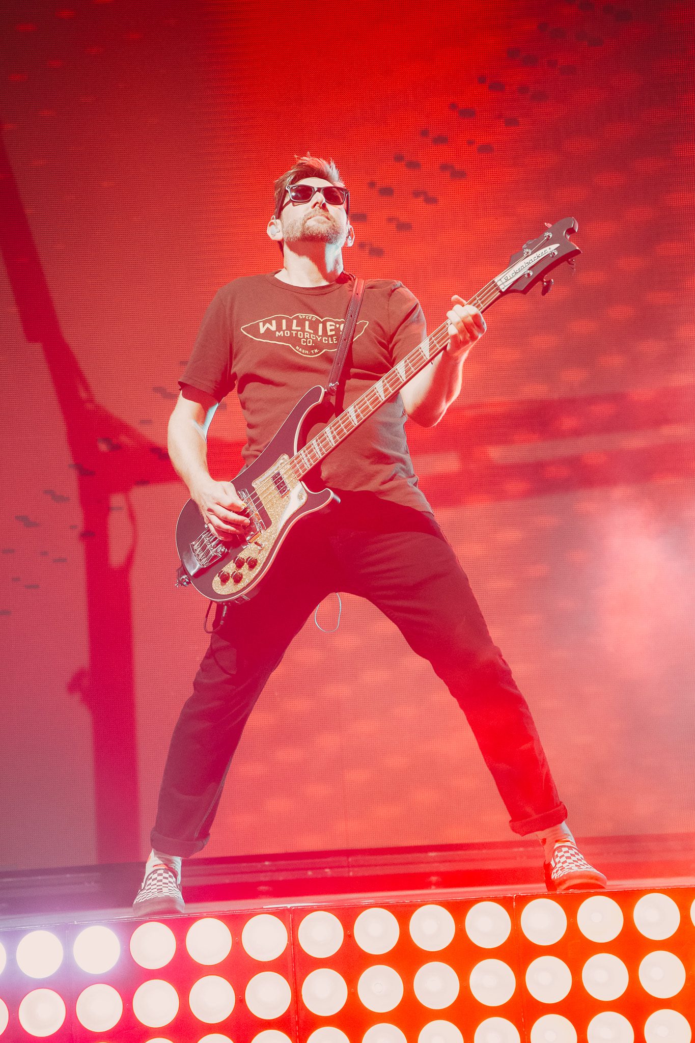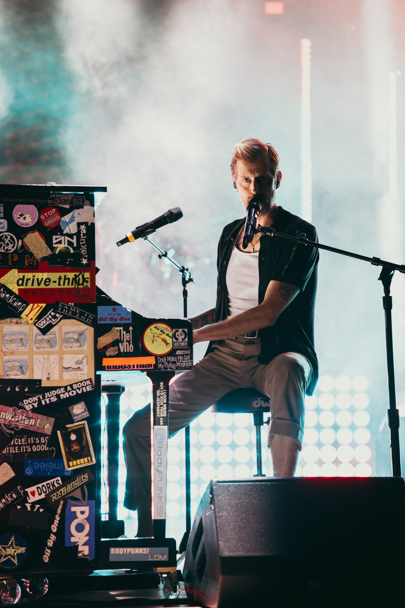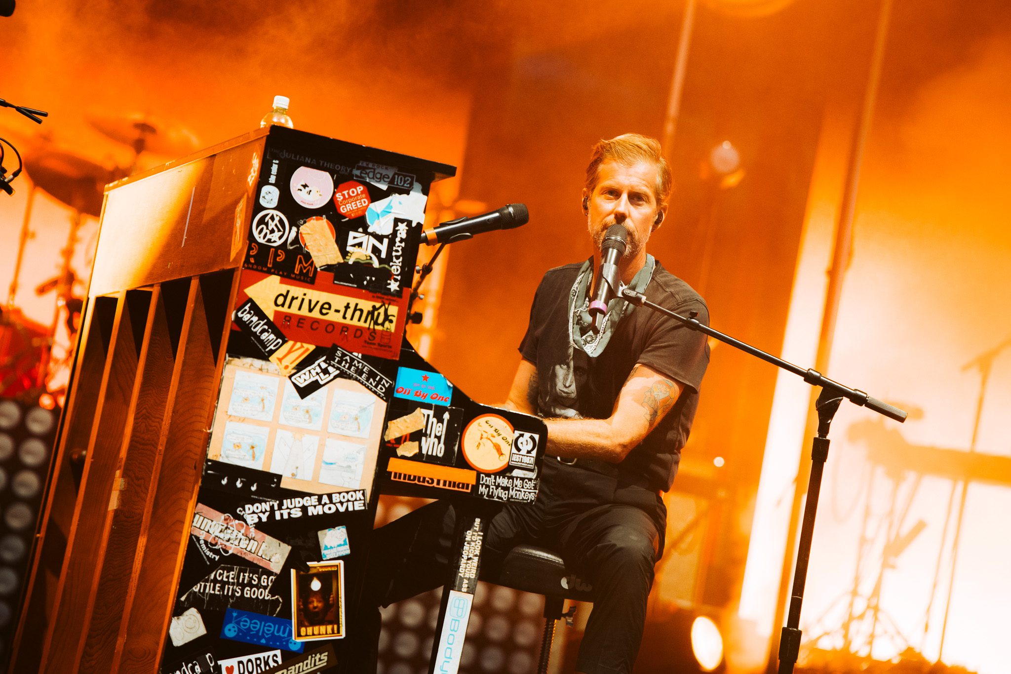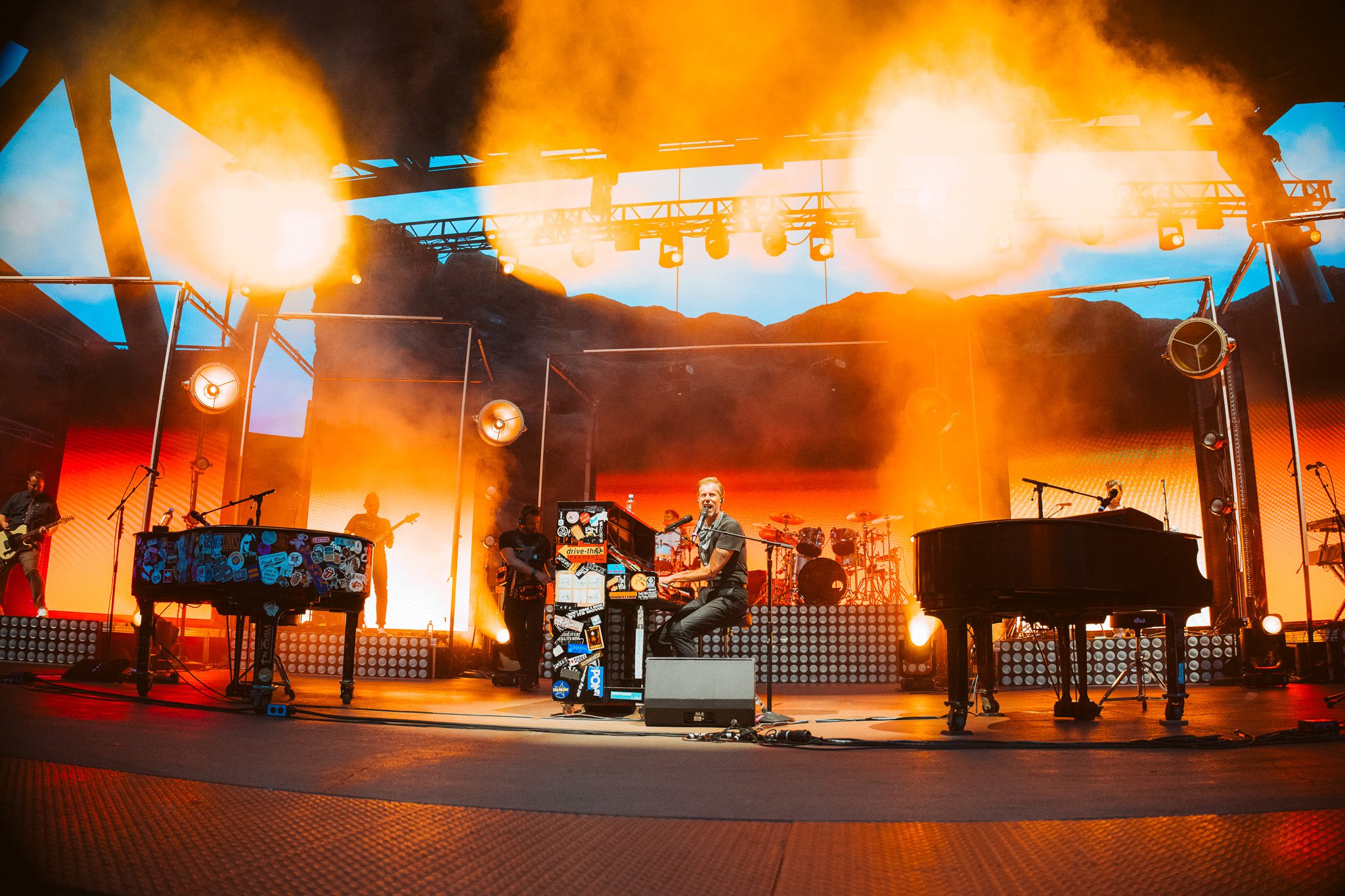 McMahon’s final love letter unfolded as an upright piano appeared on screen, unmistakably recognized as the beloved piano from his Something Corporate days. “We met somewhere in Boise in the summer of ’02,” the monologue began, recalling the gift of that upright piano, “my first true weapon.” Covered in stickers from punk bands, it stood as a symbol of youth, rebellion, and the chaotic energy that defined their early years. McMahon’s voice echoed off the Red Rocks monoliths as he painted a vivid picture of the band’s beginnings: raw, uncertain, and fiercely driven by dreams forged on moshpit-lined stages. “Don’t tell the others, but you were always my favorite,” the monologue closed, heartfelt words to kick off the nostalgic set. McMahon took a seat at his upright piano, adorned with stickers, center stage, as his Something Corporate bandmates took the stage, opening with “Cavanaugh Park.” When it came to the lyric, “they loved my friend Adam, but he always got caught, man that kid made fucking up look cool,” McMahon paused to point out that Adam was in attendance, drawing cheers from the crowd. The set flowed through favorites like “I Want To Save You,” “Fall,” and “She Paints Me Blue.” McMahon reminisced on writing “Straw Dog” in high school, noting that he never could have imagined they would be on stage playing the song together 25 years later. When it came time to play “Me and the Moon,” McMahon shared they had intended to play the song as soon as the moon appeared, not knowing when they booked the show that there would not be a visible moon that evening. The set ended with “I Woke Up In A Car” and “Hurricane,” and the band exited to a 15-minute intermission countdown displayed on the screen, leaving fans eager for what was still to come.