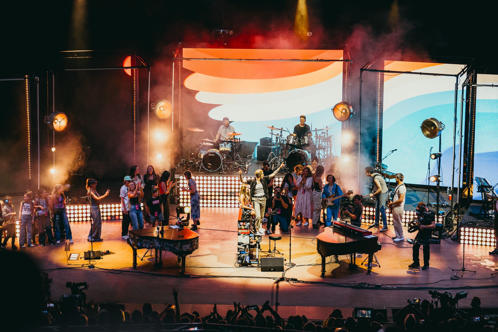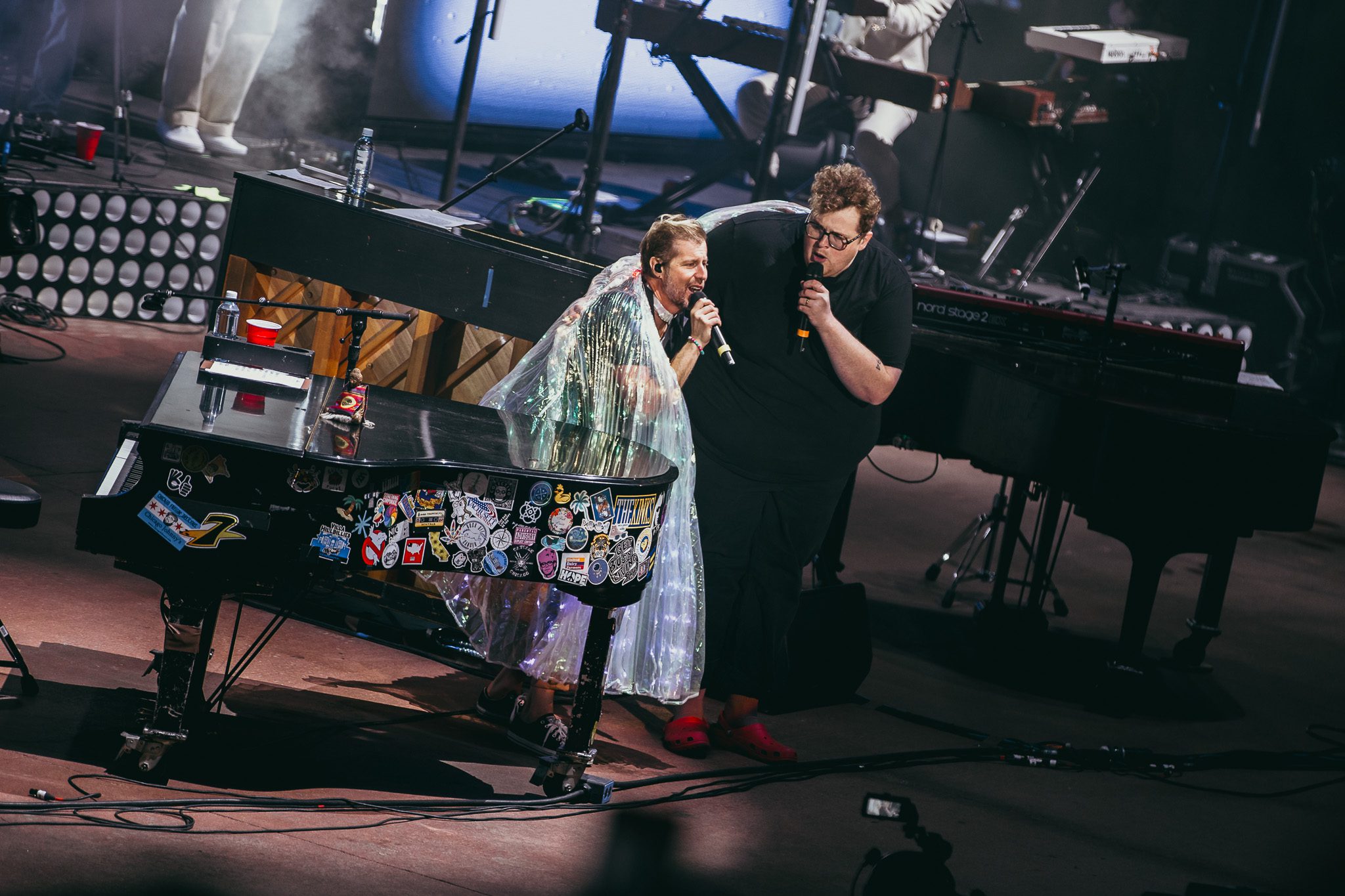The remainder of the set felt like one big super jam, with members of all three bands playing together—sometimes swapping out, but more often remaining on stage to perform each other’s songs. They tore through “Dark Blue” and “Punk Rock Princess” before bringing out friend and musician Michigander—donning his red Crocs for Red Rocks—for a performance of “Stars,” which McMahon dedicated to his wife, Kelly. Alternating between pianos depending on the song being performed, they kept the energy high with “I’m Ready” and “Fire Escape.” Midway through “Konstantine,” cheers erupted as a couple got engaged. McMahon stopped to congratulate them before finishing the song and launching into an explosive performance of “If You C Jordan” to close the set. After the band exited, McMahon returned with his daughter, Cecilia, the inspiration behind “Cecilia and the Satellite.” He shared how Denver was the city where the song first became a hit—and how it had made one of his earliest dreams come true, to have a hit song on the radio—before performing it alongside her in front of 9,000 fans who have watched her grow up. The night closed with “La La Lie,” as family and friends from all three bands filled the stage to sing along. McMahon paused to thank the crowd, saying “never in my wildest dreams—actually, in my wildest dreams… thanks for making my wildest dreams come true tonight.”