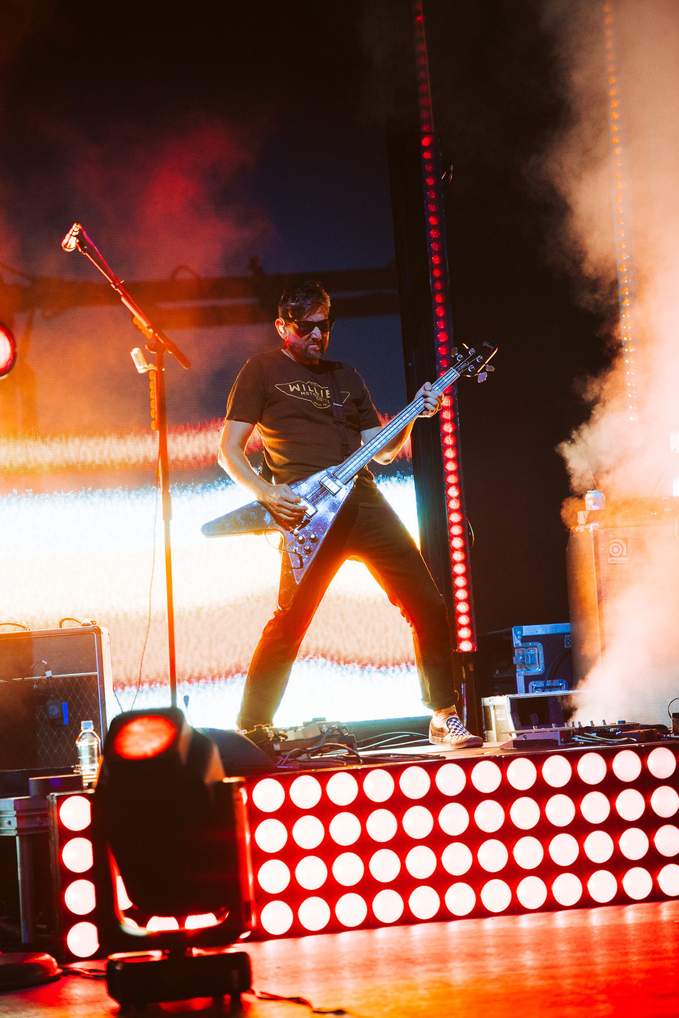 Mother Nature tried to throw a wrench in our plans, threatening thunderstorms all night, and even “sending a little rain our way”—just in time for us to line up—an ironic nod to Jack’s Mannequin’s “Kill the Messenger.” Thankfully, the downpour was short-lived, and the skies soon cleared up, gifting us with beautiful weather for the night ahead. We were ready to soak in every moment under the open air at Red Rocks. While waiting for the show to begin, Tiffany, a Dear Jack representative, and Cecilia, Andrew’s daughter, took the stage to present two incredible items that would go to lucky winners who donated to the foundation that night: a drumhead signed by all three bands, and a Gibson Les Paul Standard signed by the bands.