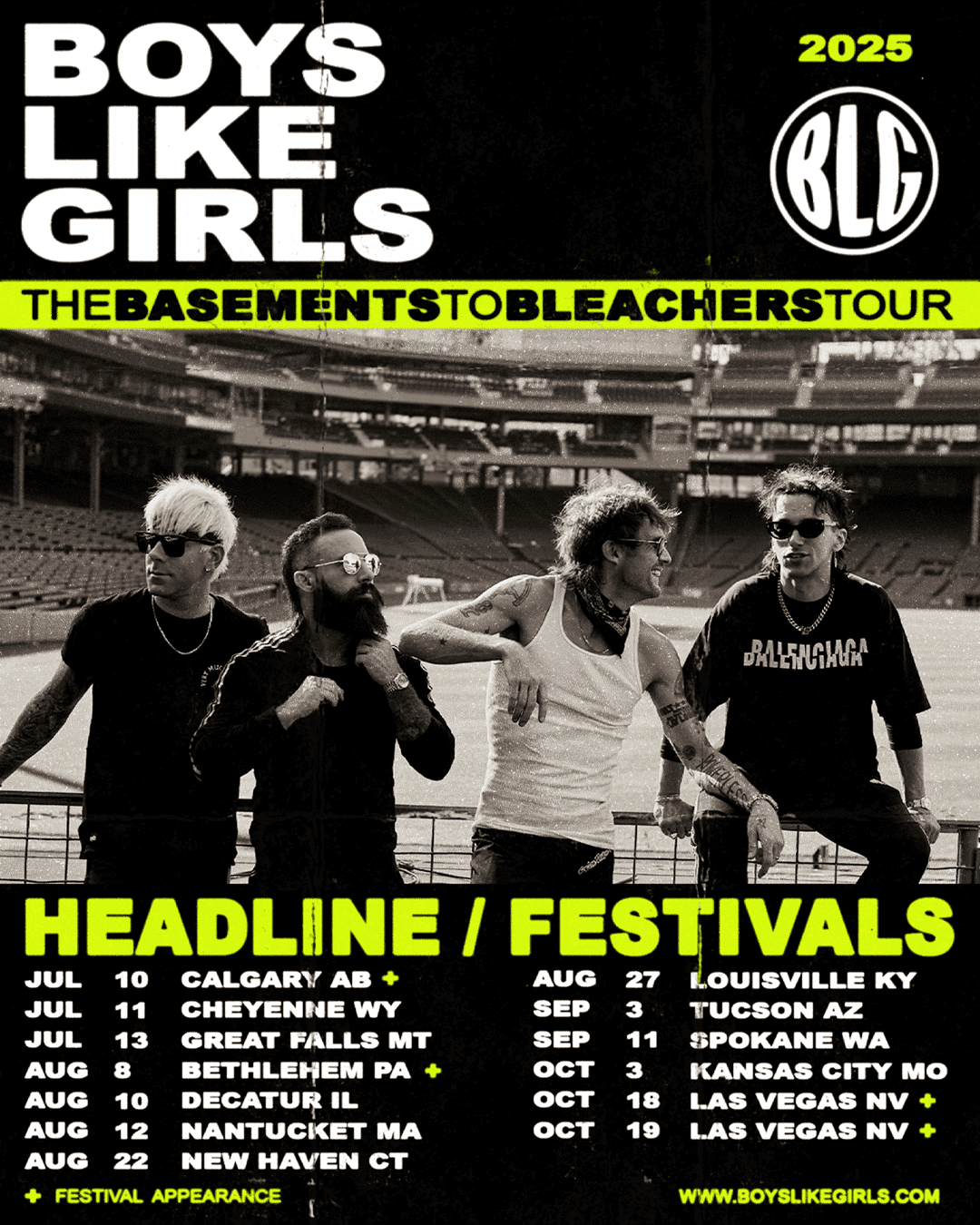 Regarding the Basements to Bleachers tour, the band shared, “There’s something romantic about the in-between, the motels with busted ice machines, and kids holding hand-painted signs in cities the agents and ‘A market’ runs forgot existed. We didn’t. We remembered. Carving up North America one last time on a record cycle that brought us around the globe three times and back. This time, a heap of dates supporting The Jonas Brothers, a couple festivals, and headlining dates in between. Two stadiums, 9 arenas, 9 amphitheaters, six festivals, five clubs…from July to October. From dive bars to domes. From basements to bleachers. This ain’t nostalgia. It’s a celebration of survival. Of coming back swinging when the world forgot you were in the ring. See you on the road.”