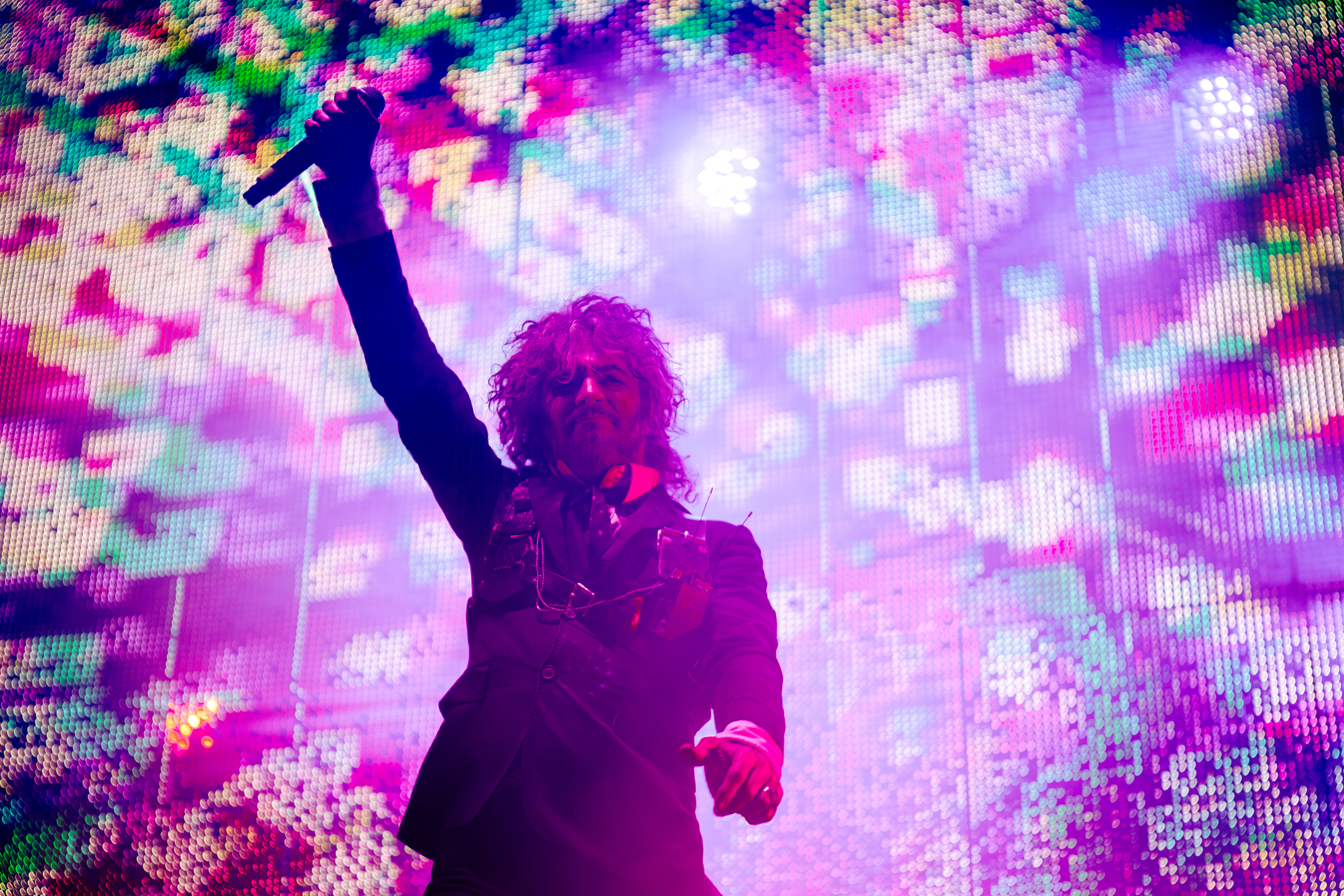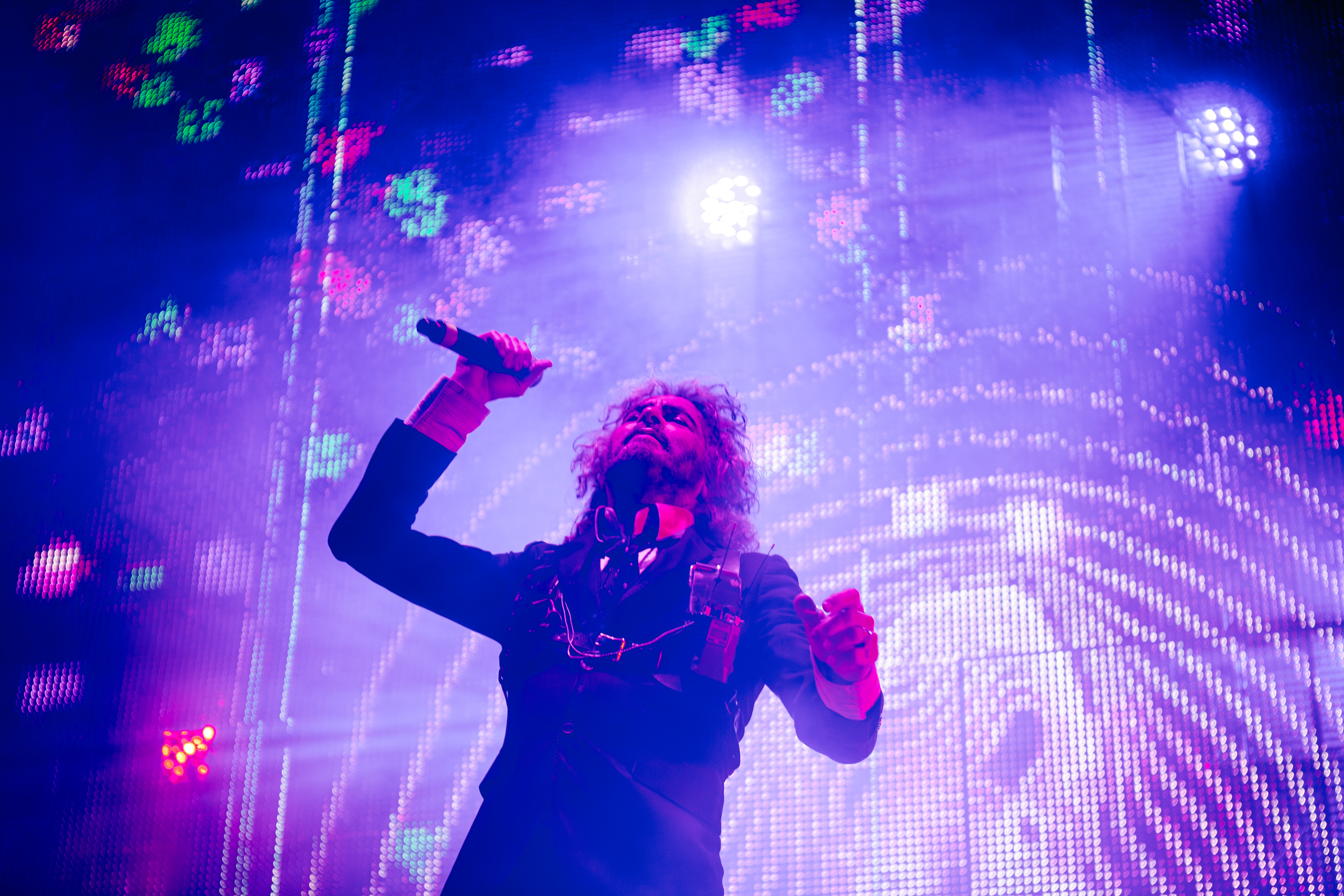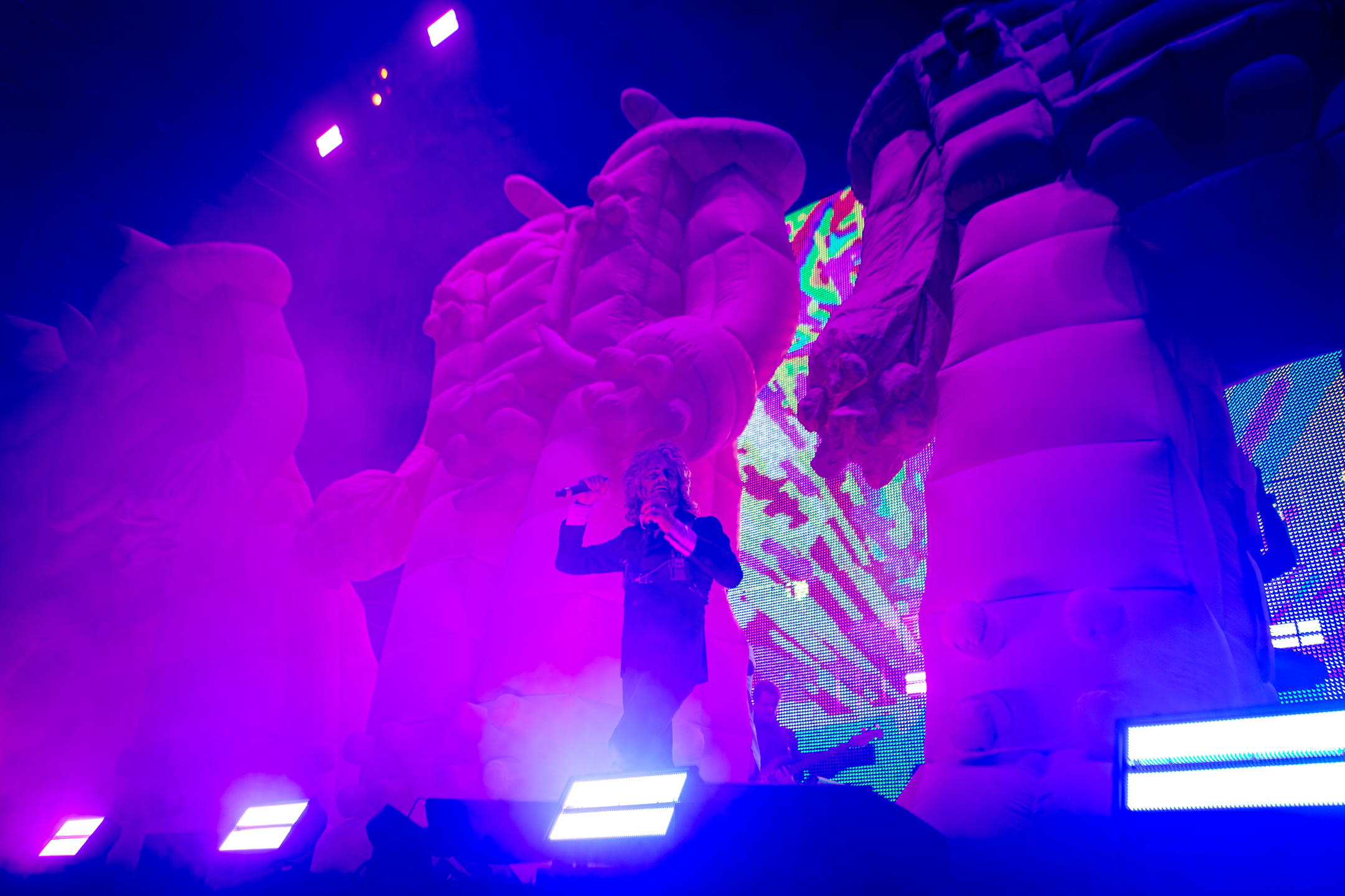 Vocalist Wayne Coyne hadn’t even entered the stage yet, as the rest of the band started with the cinematic instrumental “Sleeping on the Roof” from their 1999 album The Soft Bulletin. This only increased the excitement more, and as soon as Coyne joined, hands raised and cheers rang out in the crowd. The band went into “Yoshimi Battles The Pink Robots,” and soon after, large inflatable robots popped up on stage behind Coyne. As the band went into part 2 of “Yoshimi Battles The Pink Robots,” confetti blasted over the crowd and large balloons, also filled with confetti, appeared. The audience jumped and reached for the balloons, and each time one would reach the stage, Coyne tossed it back to the audience. Every so often, one would pop and rain confetti over fans below. Coyne brought out his streamer gun, shooting streamers into the audience and kids at the front of the barricade reached over to try to catch some of the flying streamers.