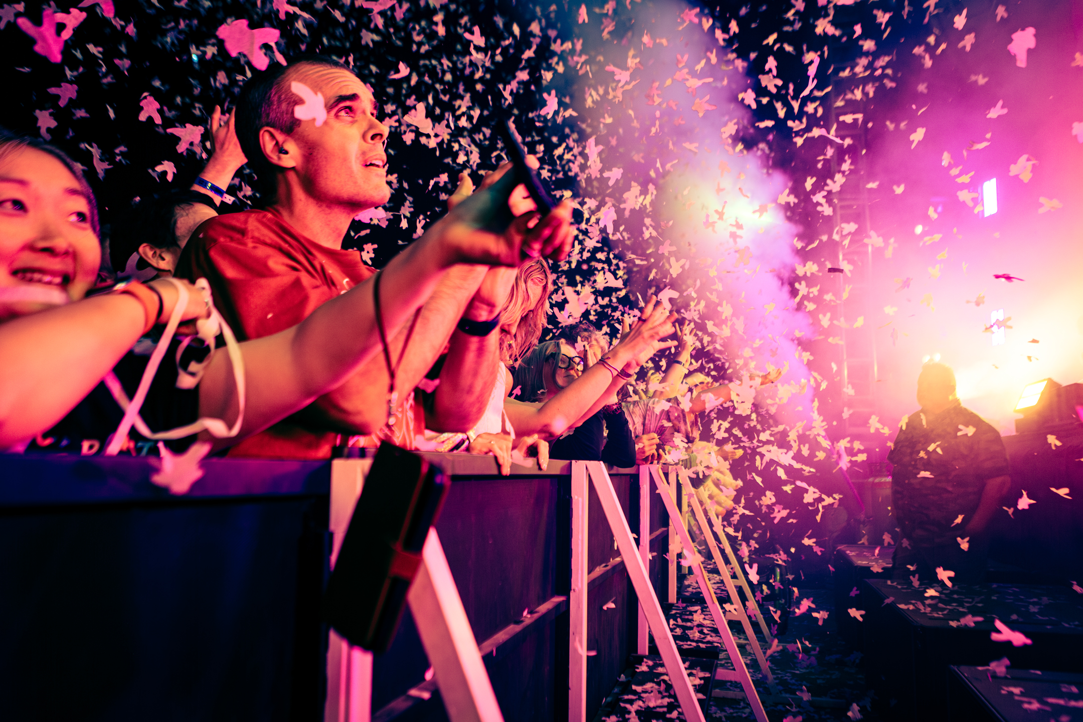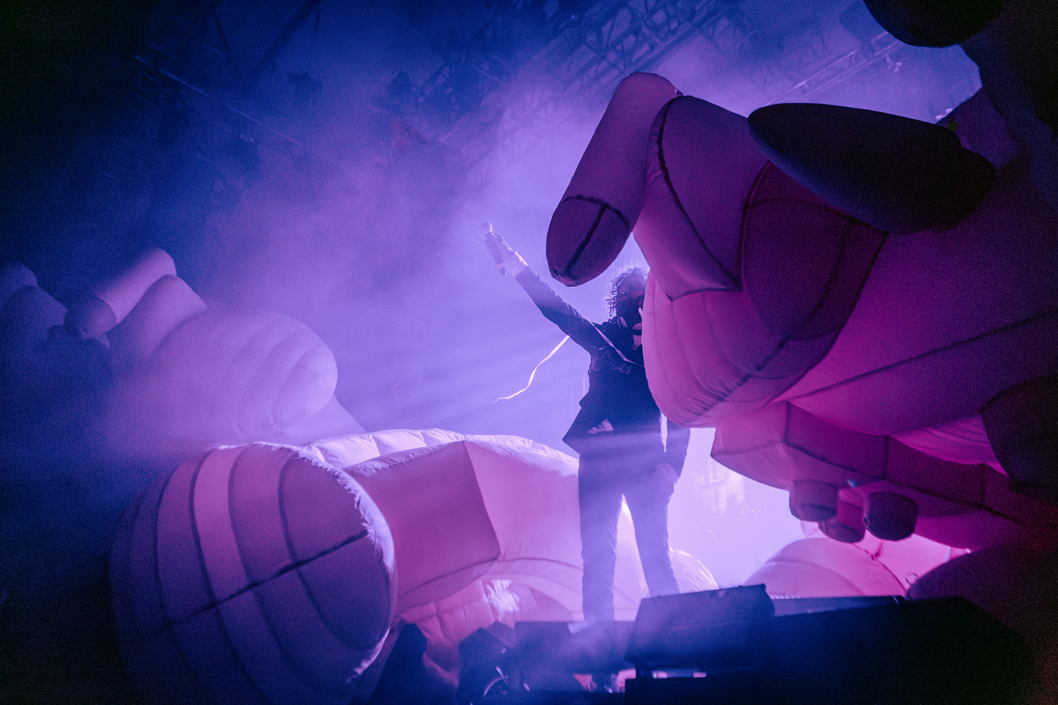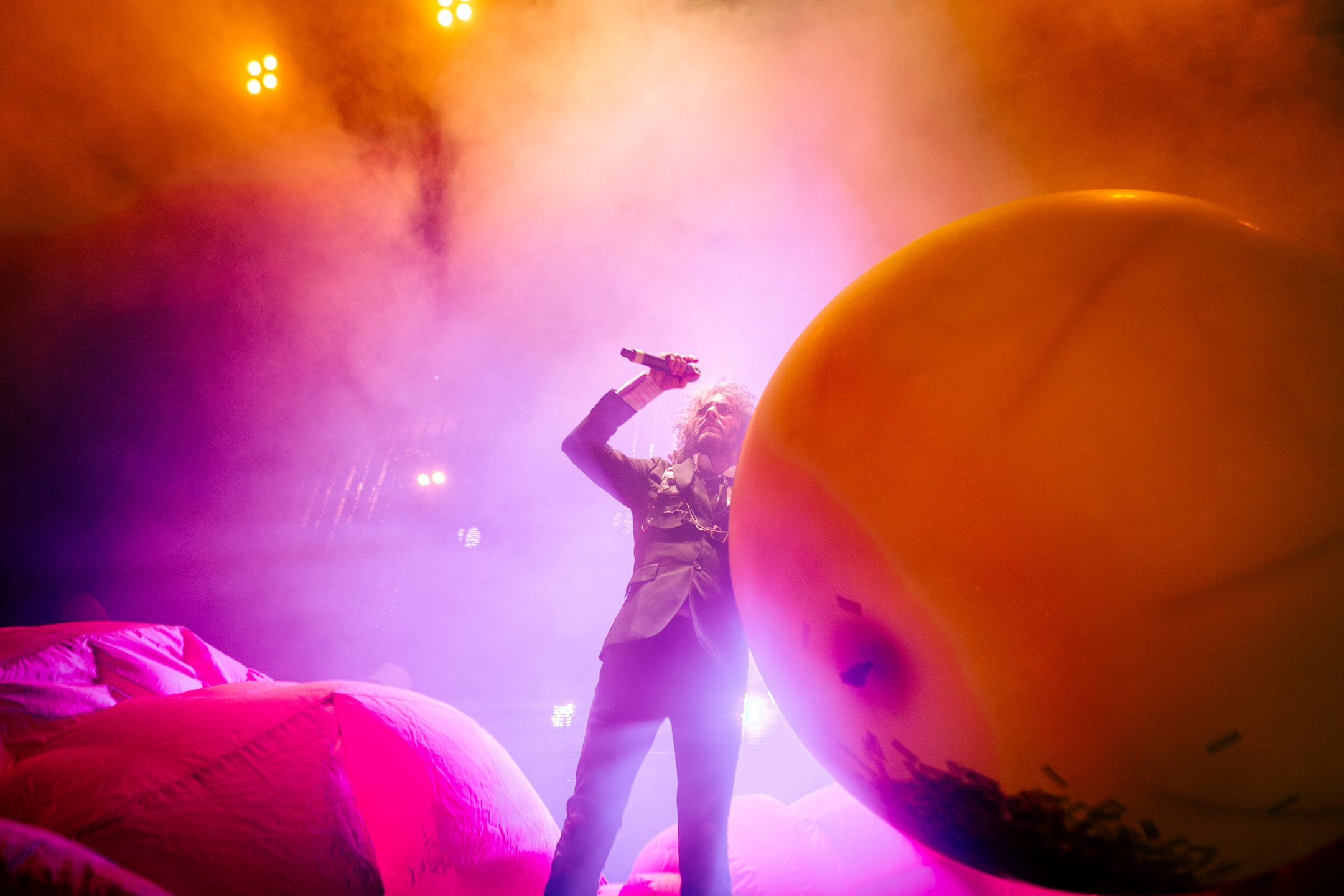 Vocalist Wayne Coyne hadn’t even entered the stage yet, as the rest of the band started with the cinematic instrumental “Sleeping on the Roof” from their 1999 album The Soft Bulletin. This only increased the excitement more, and as soon as Coyne joined, hands raised and cheers rang out in the crowd. The band went into “Yoshimi Battles The Pink Robots,” and soon after, large inflatable robots popped up on stage behind Coyne. As the band went into part 2 of “Yoshimi Battles The Pink Robots,” confetti blasted over the crowd and large balloons, also filled with confetti, appeared. The audience jumped and reached for the balloons, and each time one would reach the stage, Coyne tossed it back to the audience. Every so often, one would pop and rain confetti over fans below. Coyne brought out his streamer gun, shooting streamers into the audience and kids at the front of the barricade reached over to try to catch some of the flying streamers.