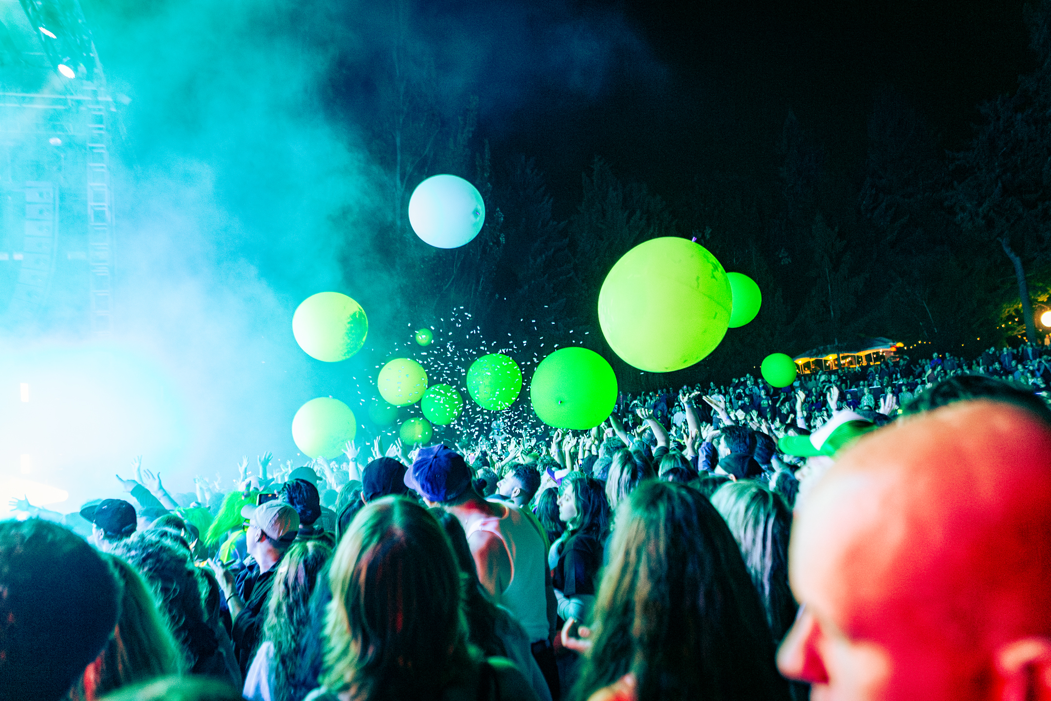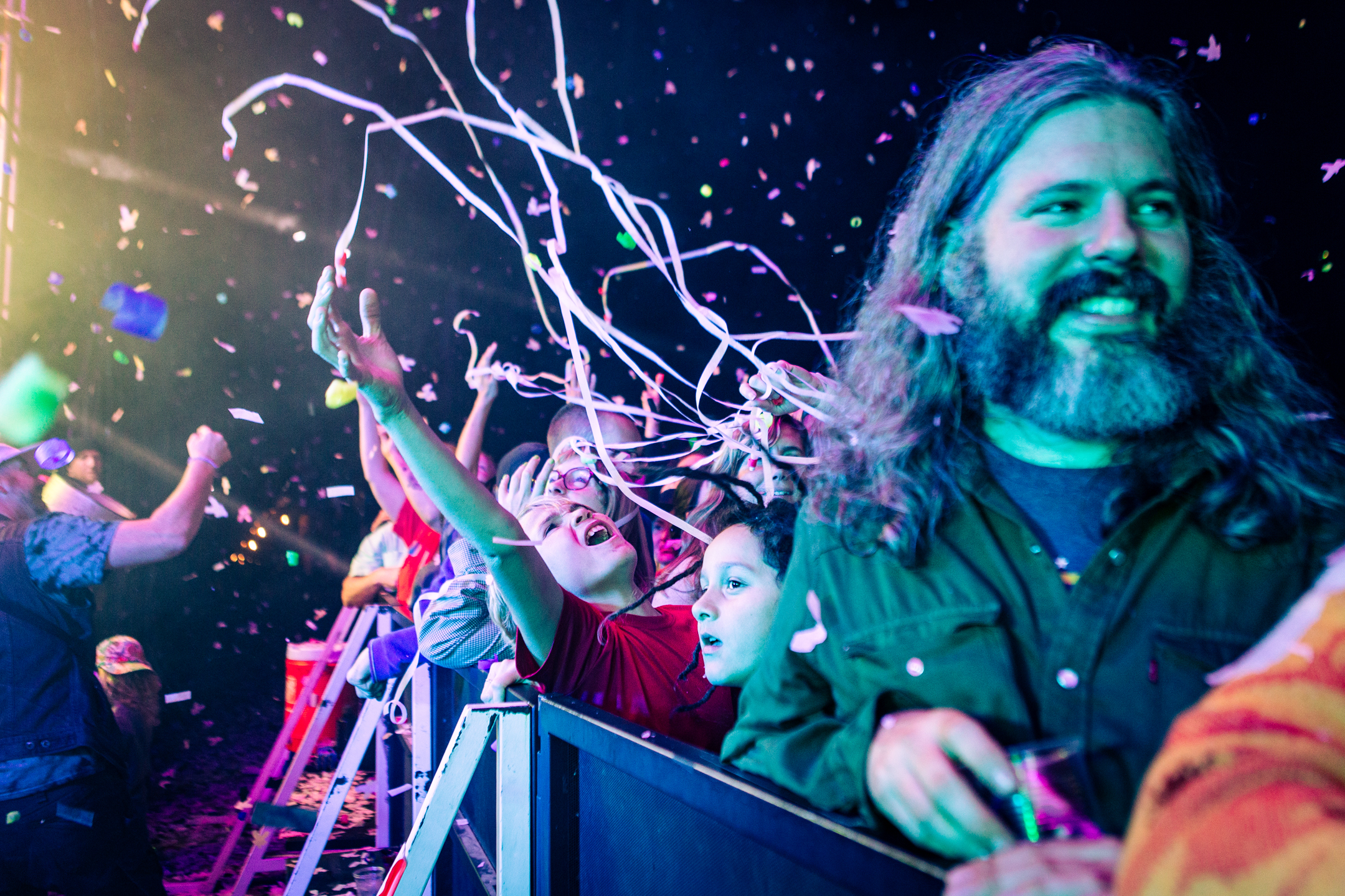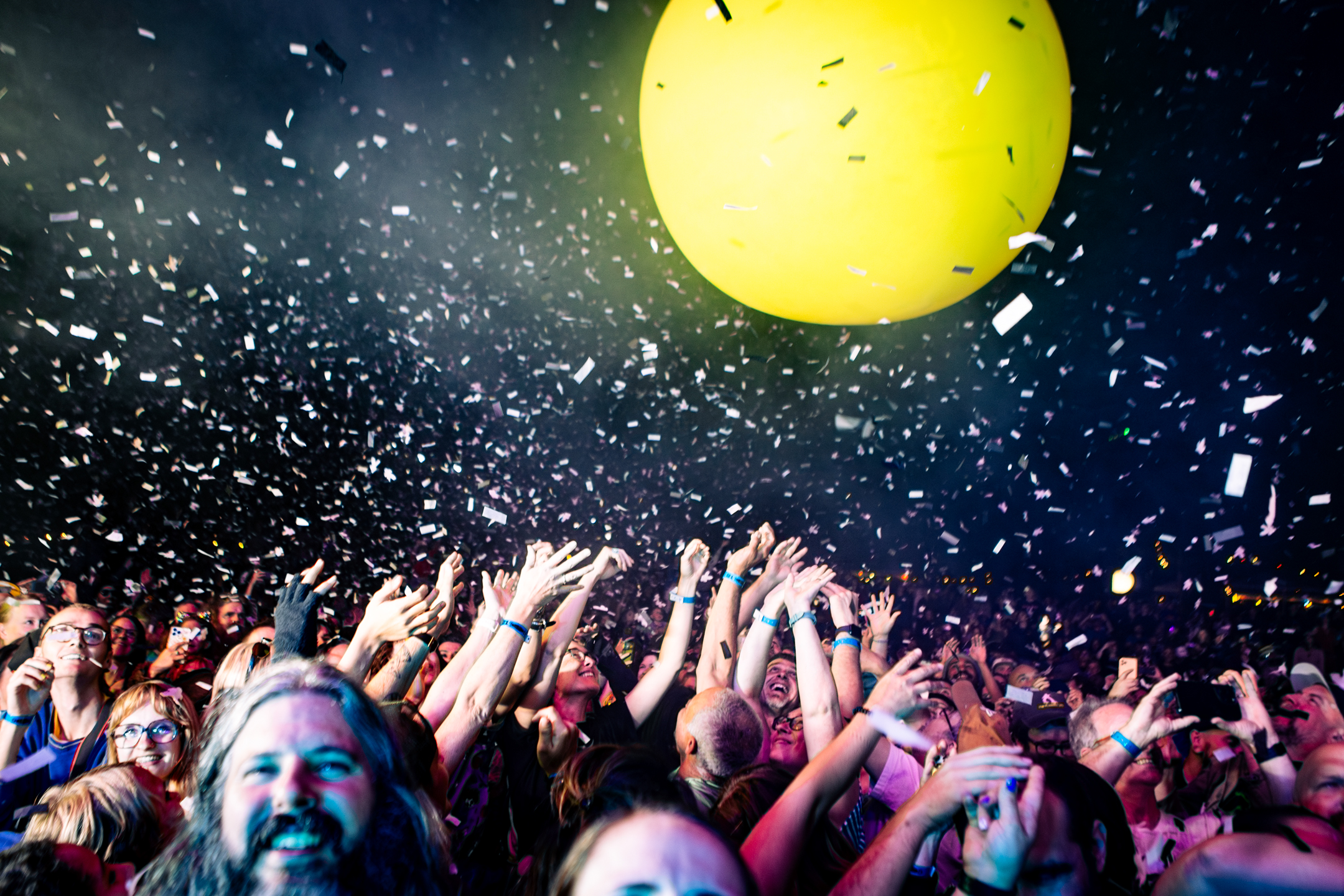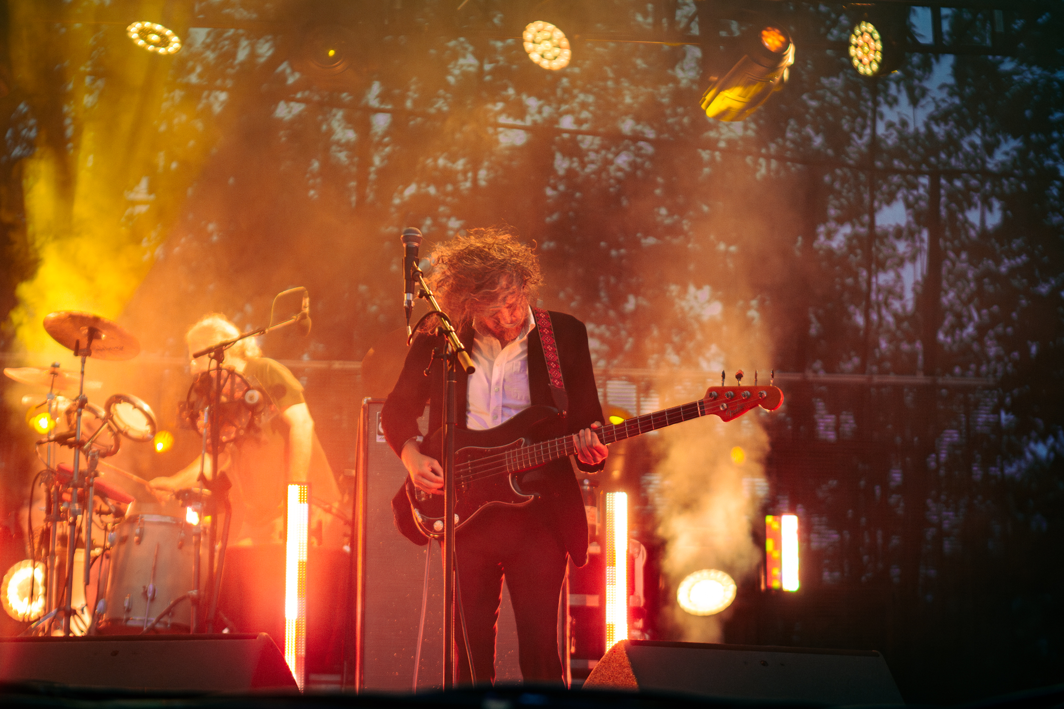 The band returned for an encore. With Coyne donning an American flag as a cape, he introduced the first song of the encore, a cover of “War Pigs” by Black Sabbath, and prefaced it with a tribute to the late Ozzy Osbourne as well as his brother’s friends who lost their lives in the Vietnam war. “Play this song every day so we never forgot how horrible and stupid wars can be,” he told the audience. After the Black Sabbath cover, the band finished the evening with “Race For The Prize” from The Soft Bulletin. At the end, as confetti filled the air, Coyne victoriously held up balloons that read “Fuck yeah Edgefield” as the audience cheered.