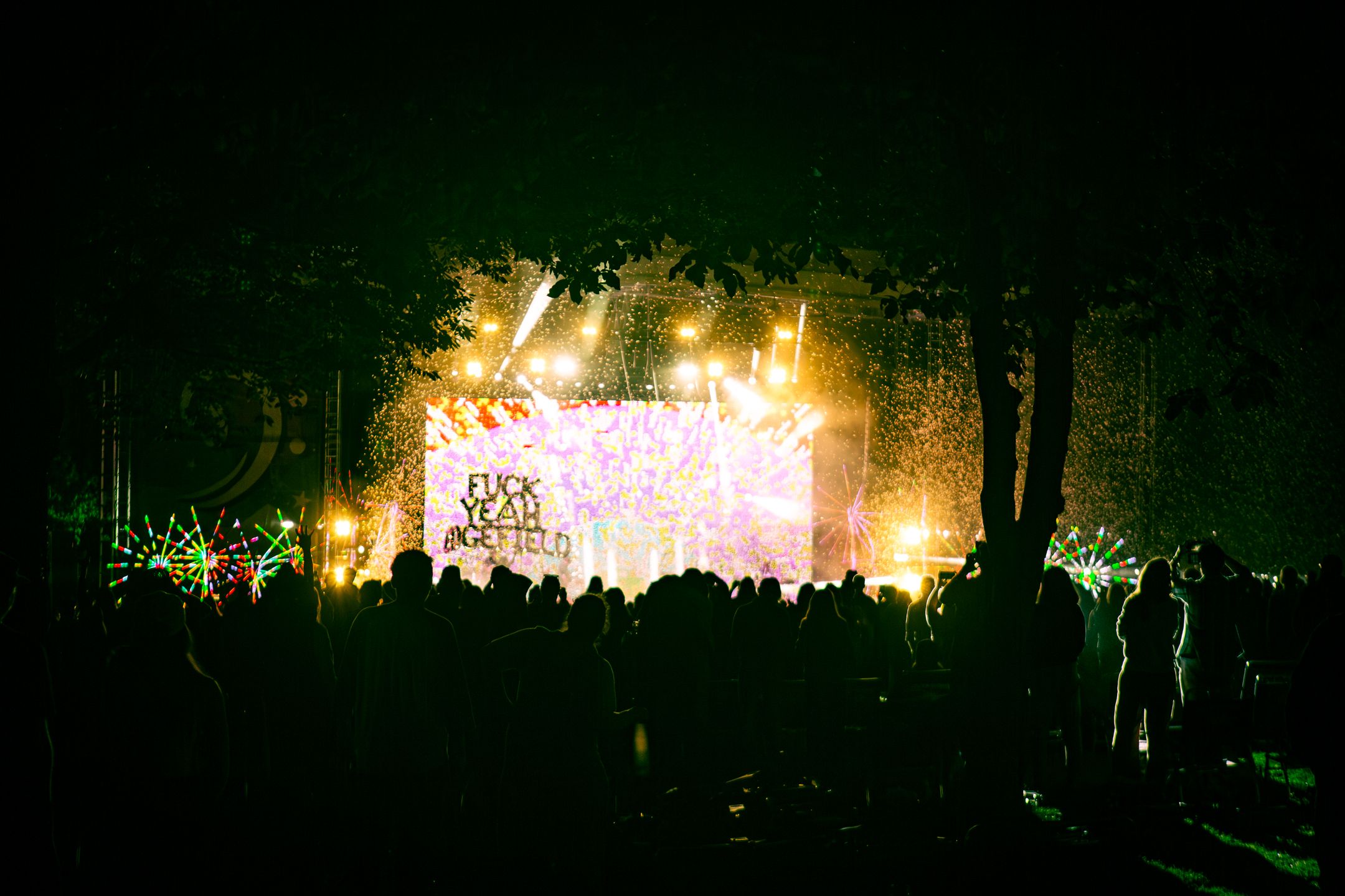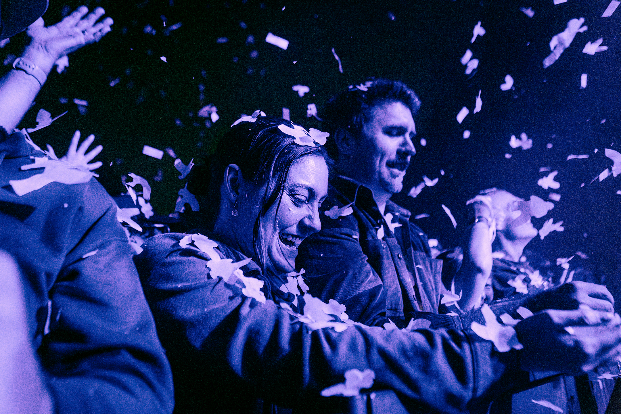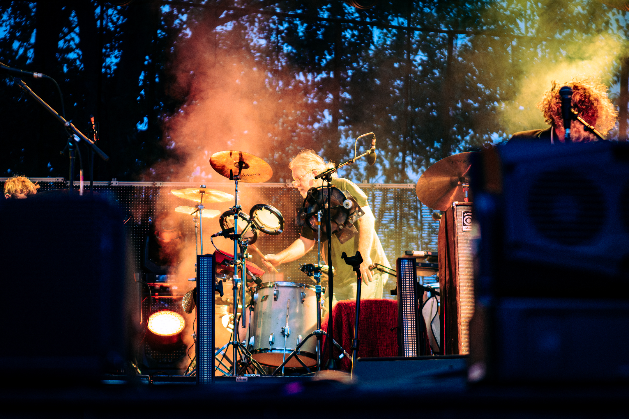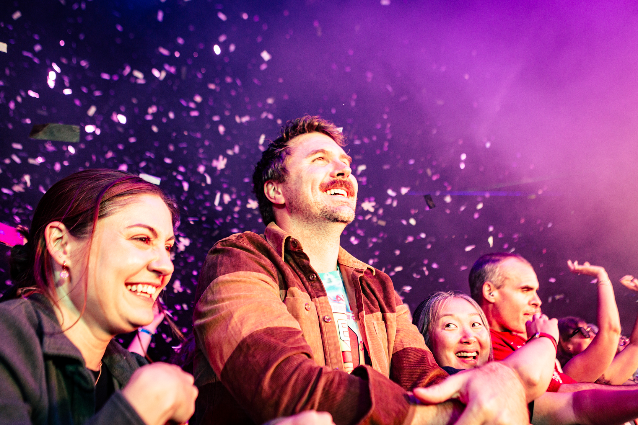 The band returned for an encore. With Coyne donning an American flag as a cape, he introduced the first song of the encore, a cover of “War Pigs” by Black Sabbath, and prefaced it with a tribute to the late Ozzy Osbourne as well as his brother’s friends who lost their lives in the Vietnam war. “Play this song every day so we never forgot how horrible and stupid wars can be,” he told the audience. After the Black Sabbath cover, the band finished the evening with “Race For The Prize” from The Soft Bulletin. At the end, as confetti filled the air, Coyne victoriously held up balloons that read “Fuck yeah Edgefield” as the audience cheered.