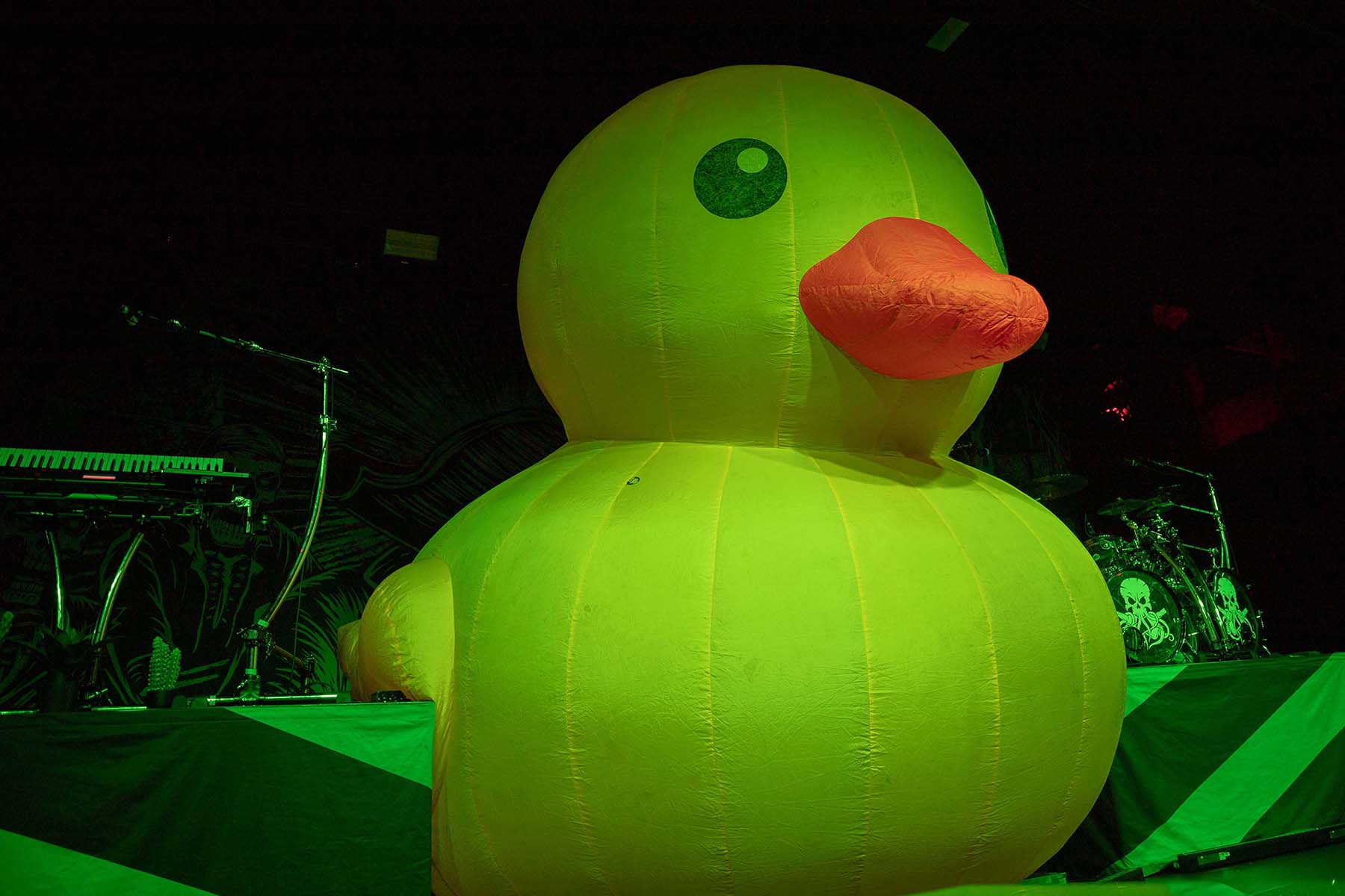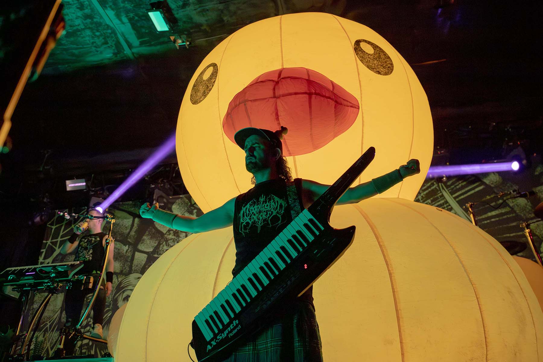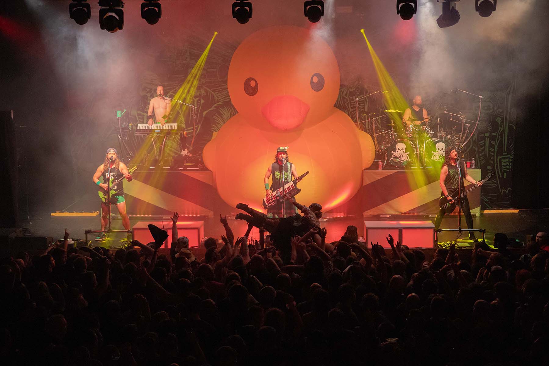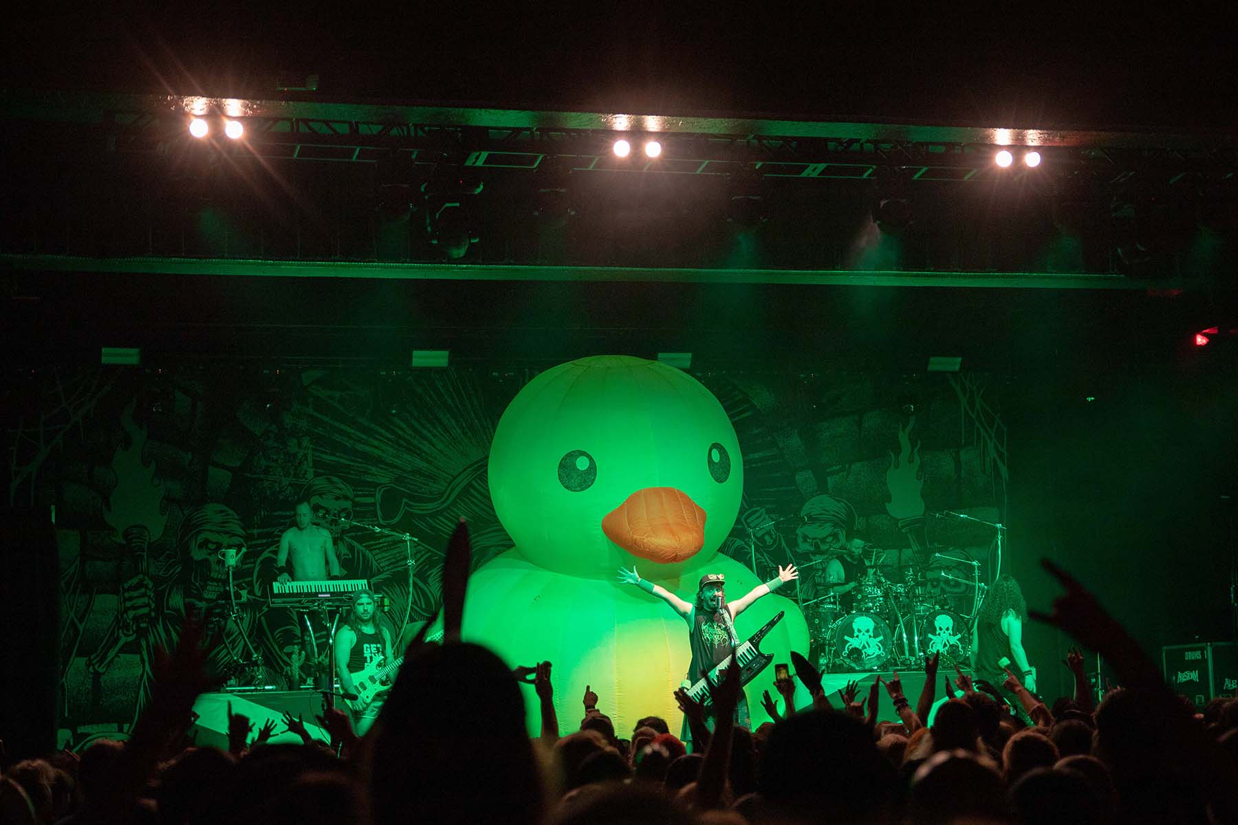After they played, it was time for the pirates to take the stage. But first, inflate the GIANT RUBBER DUCK. This was my favorite part of watching Alestorm perform last year at this venue. Their first song had crazy lights flashing and swirling around the room as they entered. The crowd was screaming, and inflatable swords were waving around the crowd. The pirates took no captors as everyone was on board singing along to their chanties. Crowd surfers were coming up left and right in the pit. I even saw someone wearing a duck mask make their way up. It was a wonderful show, and they even brought Glyph’s vocalist, Barbara Blackthorne, on stage to provide vocals for some of their songs. I love guest features. There was also the return of MC Shark, who helped out with some of the songs as well as chasing guitarist Máté Bodor around the stage. He even chewed on his head a little bit. Their music is fun, lighthearted, and about pirates. What more could you want from them?