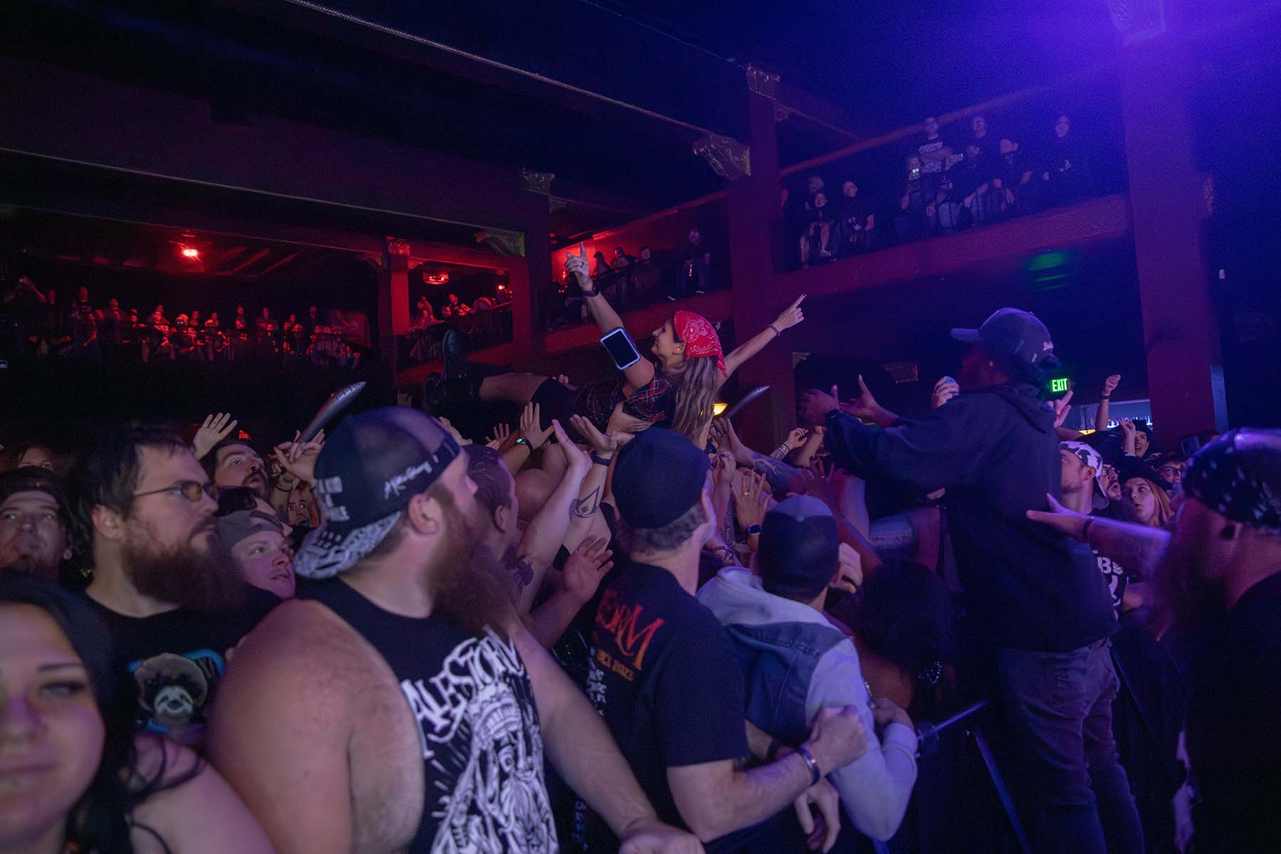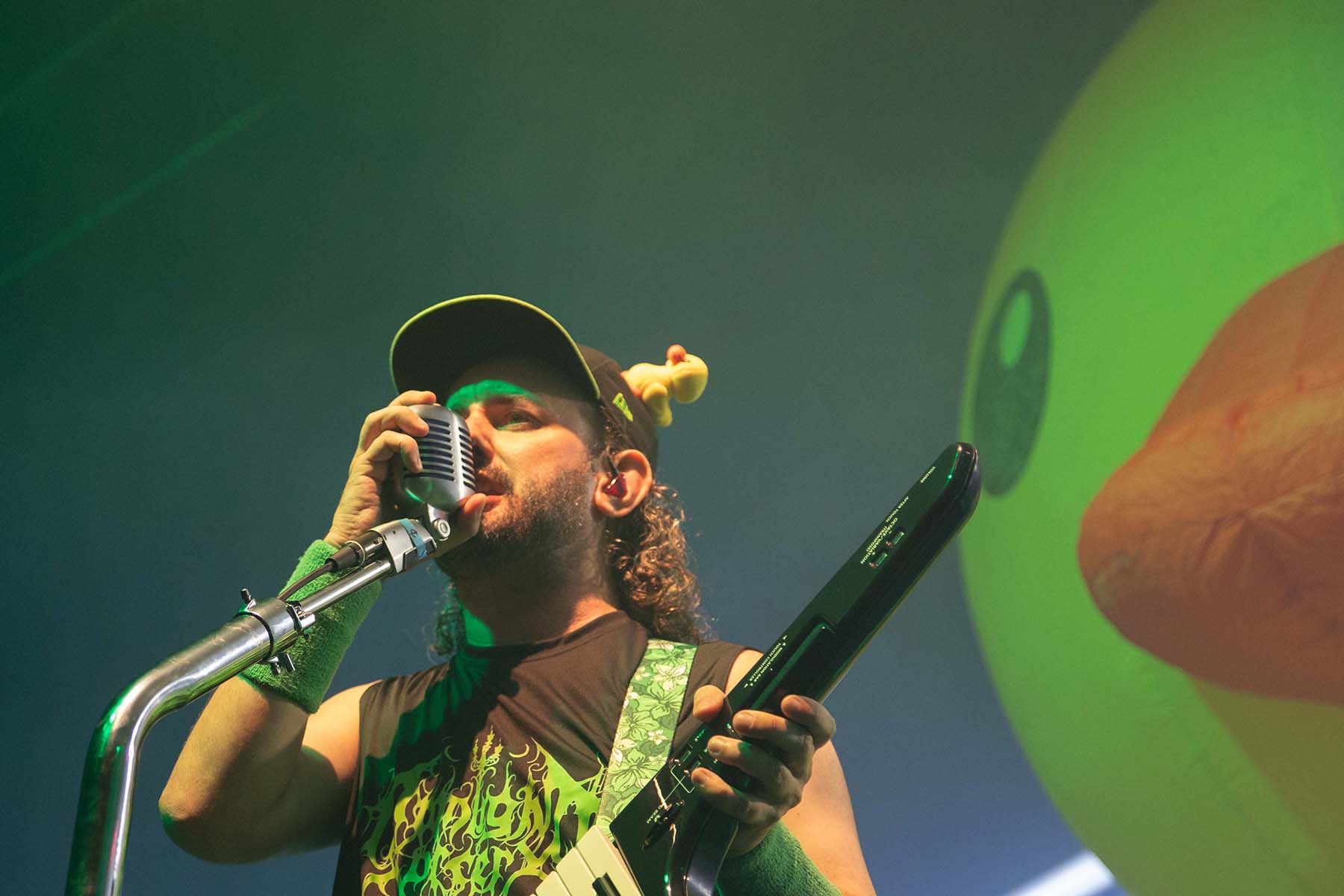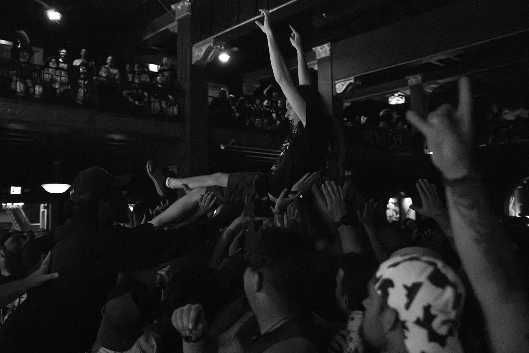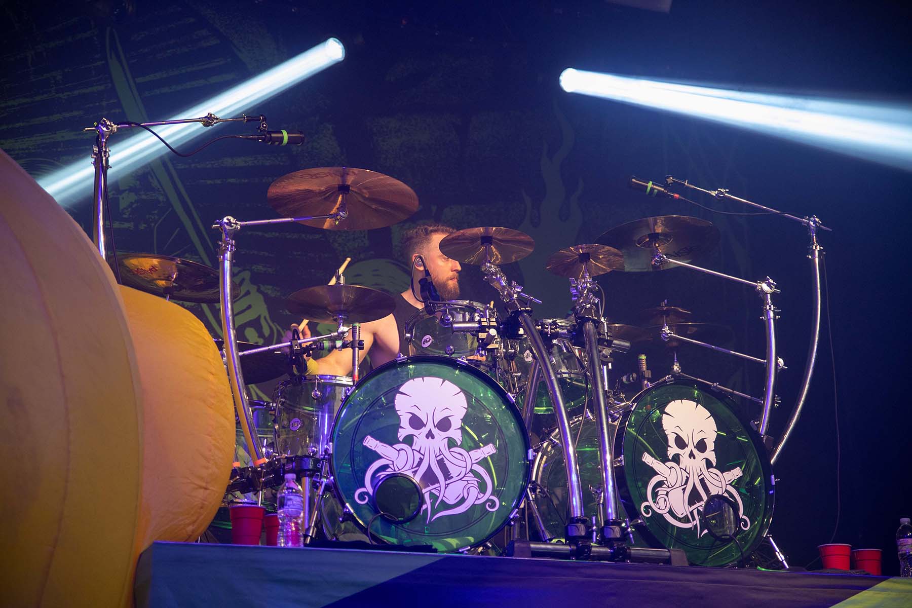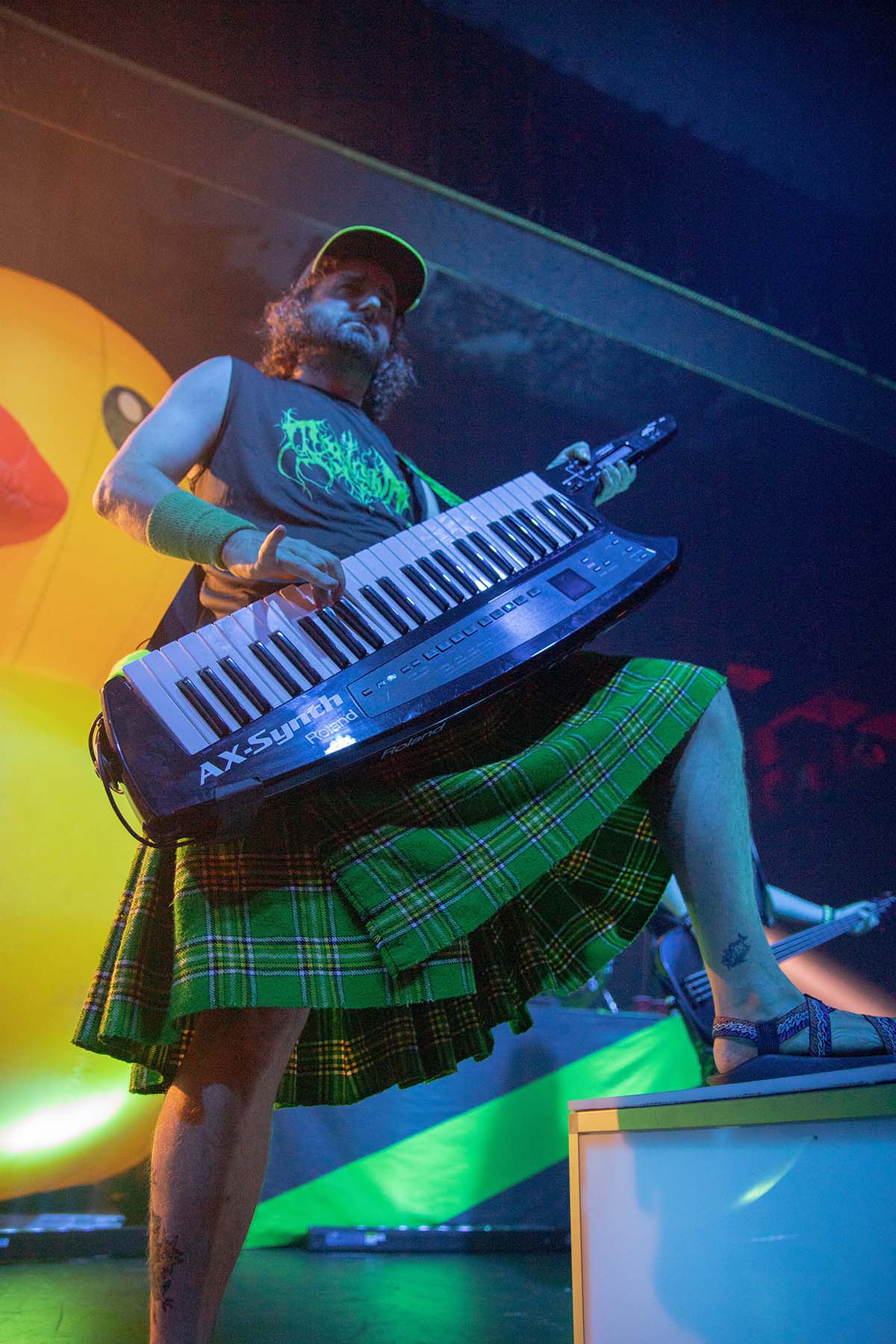 After they played, it was time for the pirates to take the stage. But first, inflate the GIANT RUBBER DUCK. This was my favorite part of watching Alestorm perform last year at this venue. Their first song had crazy lights flashing and swirling around the room as they entered. The crowd was screaming, and inflatable swords were waving around the crowd. The pirates took no captors as everyone was on board singing along to their chanties. Crowd surfers were coming up left and right in the pit. I even saw someone wearing a duck mask make their way up. It was a wonderful show, and they even brought Glyph’s vocalist, Barbara Blackthorne, on stage to provide vocals for some of their songs. I love guest features. There was also the return of MC Shark, who helped out with some of the songs as well as chasing guitarist Máté Bodor around the stage. He even chewed on his head a little bit. Their music is fun, lighthearted, and about pirates. What more could you want from them?