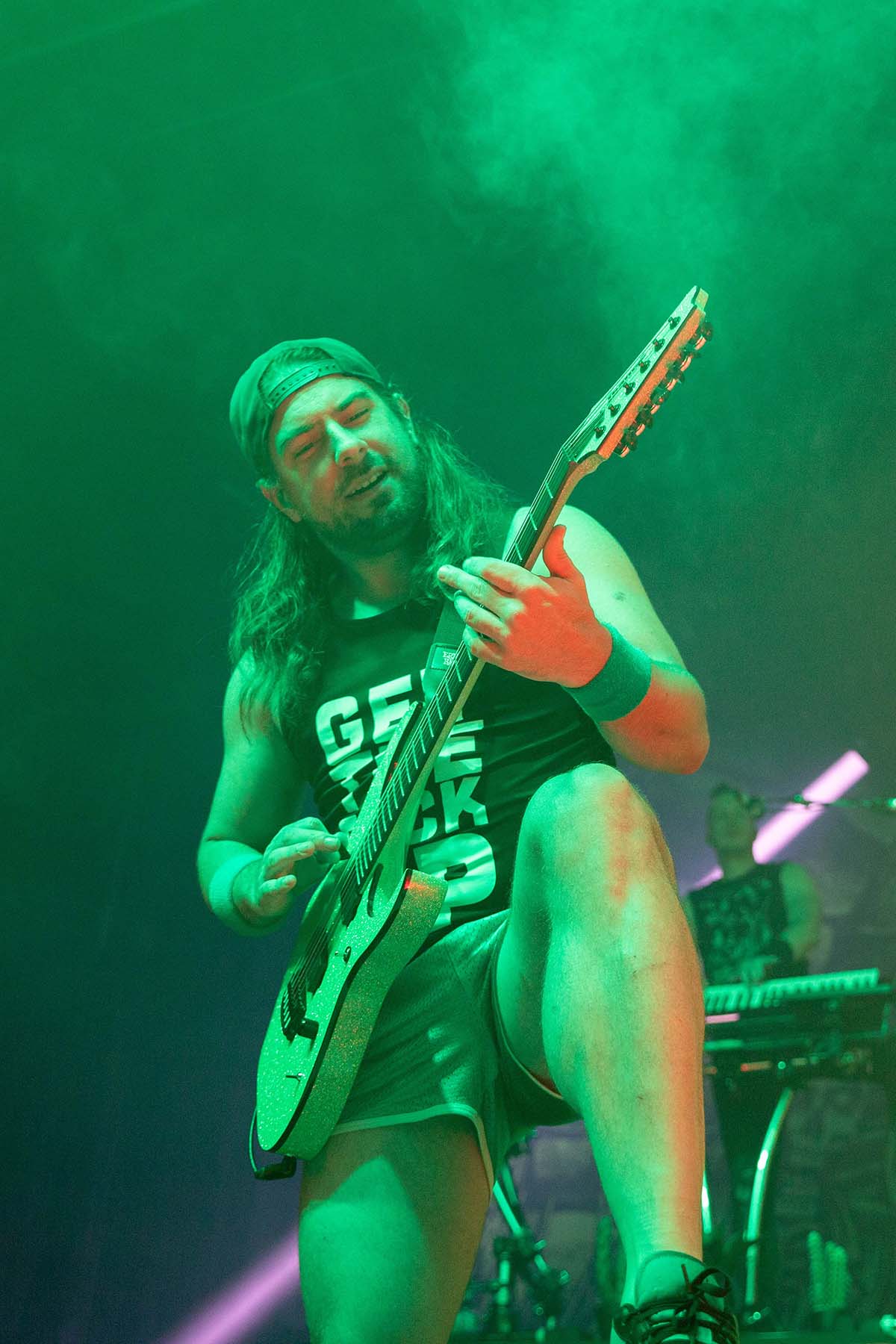 Gloryhammer came out in full force. My husband explained to me that their theme is supposed to be space wizards in time or something like that. Each member came out dressed in that part, I guess? I don’t go out of my way to listen to power metal, but I totally enjoy it. Either way, they were phenomenal. Crowd surfers started, a pit opened up, and there were dozens of fans at the barricade screaming along to the songs. Their set-up was fun and gave off Camelot notes with the brick covers. The vocalist, Sozos Michael, flipped his hair around as he also held the microphone towards the crowd as they continued to sing back. Their little stage theatrics lent a hand to the fun as an alien came out on stage playing a saxophone — followed by a beat-down with the GLORYHAMMER carved with a rune symbol changing colors as it lit up. Vocalist Sozos Michael continued to march around stage with the mic in one hand and the hammer in the other for the remainder of the set. Even if that hammer is super light, I can’t imagine having to carry that around over your head for an extended amount of time. It was a cool prop to include. Can you really call your band Gloryhammer without a hammer? HAMMERTIME.