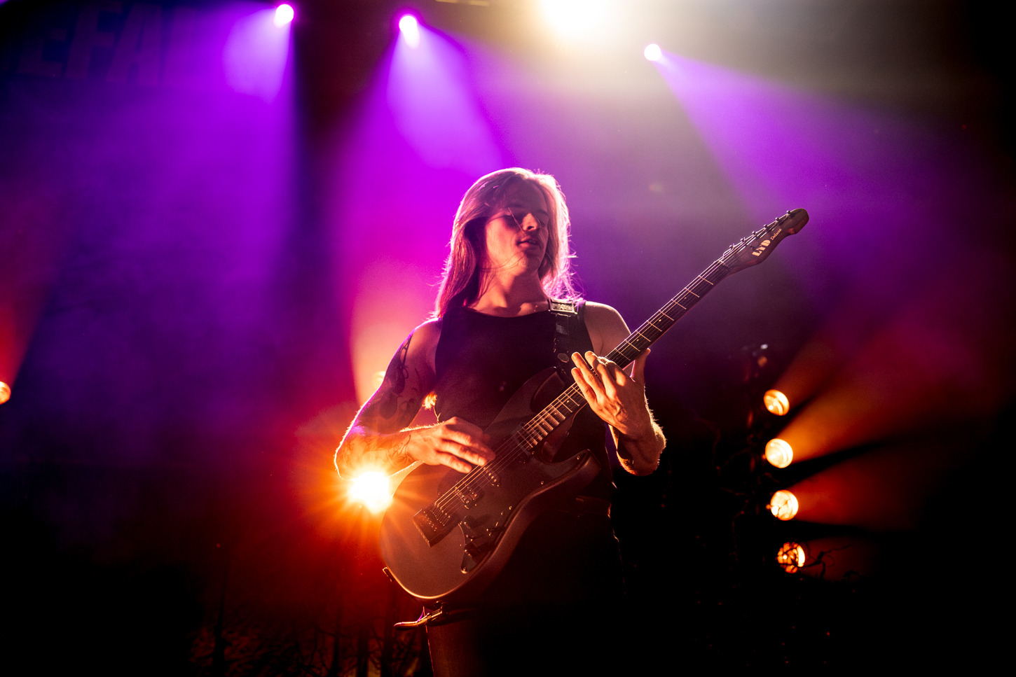 From the moment Dark Divine’s intro hit, the stage felt like stepping through a haunted velvet curtain—dark, charged, and theatrically alive. Formed in Orlando in 2021, the group has made a name for themselves already, not just for their heavy melodic style, but for going totally overboard on horror imagery with each live performance. Vocalist Anthony Martinez and guitarist Robby Lynch have explained that the makeup and characters of theater were in the band’s DNA from day one—Robbie’s skeleton-clinging appearance, in particular, led the rest of the group to do the same. On stage, Martinez’s face is half ghostly canvas, half living picture—acrylic strokes, shadowy darkness, UV glow—and his pose becomes something regal, sinister, and alien. The lighting, the stage setup, and how they let each song unfold visually seemed deliberate, meant to pull the audience deeper into the universe they’ve created on songs like “Burn the Witch” or “Cold.”