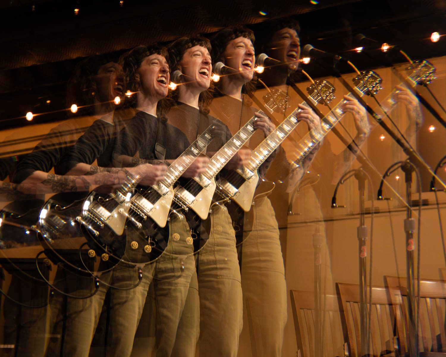 The show started off with Hillary James, aka Bathtub Cig, from Minneapolis. She is a solo acoustic artist whose music focuses on themes of depression and grief. The music was soft and sorrowful, yet had bright undertones that made me want to listen to more and more. In contrast to the somber sound of the music, Bathtub Cig engaged the audience with her quirky and fun personality. At one point in the set, one side of her guitar strap fell off and she said “that’s rock and roll baby,” which garnered a laugh from the audience. Bathtub Cig shared the backstory behind one of her songs about the grief surrounding her mom’s death, and how she coped with cocaine and threesomes.