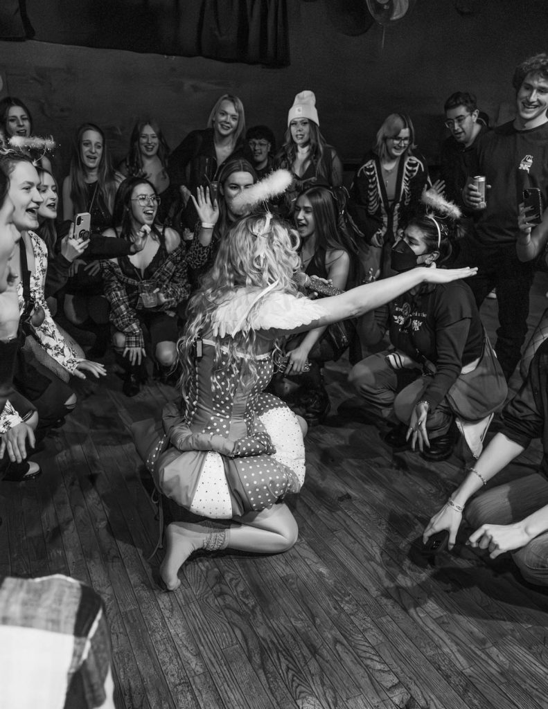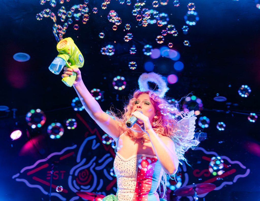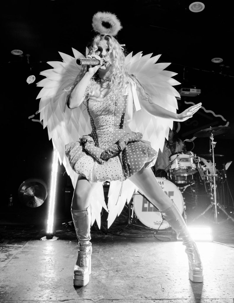 Meg Smith started the night with flashing lights and her drummer playing a beat that built momentum, creating anticipation for her entrance. Meg strutted onstage wearing angel wings that are, without a doubt, as tall as I am. I was quickly captivated by her look and her sound. She started her set with my favorite song by her, “God Damn Baby,” which featured an addictive melody and choreography. Meg’s energy is infectious, and that, combined with the free halos she was handing out at the merch table, had the audience on her side from the moment she took the stage. After this song, she said she felt a witchy, feminine energy in the room and asked if any audience members had an ex they wanted her to cast a spell on. An audience member shared the story of her horrible ex ghosting her, and we all cursed him with a call and response chant that included wishing for him to have bad breath, bad sex, and finally yelling, “We banish him from Milwaukee.” This fun ritual led us into a song about an ex of hers and her friends cast a spell on because they broke up with her on Halloween.