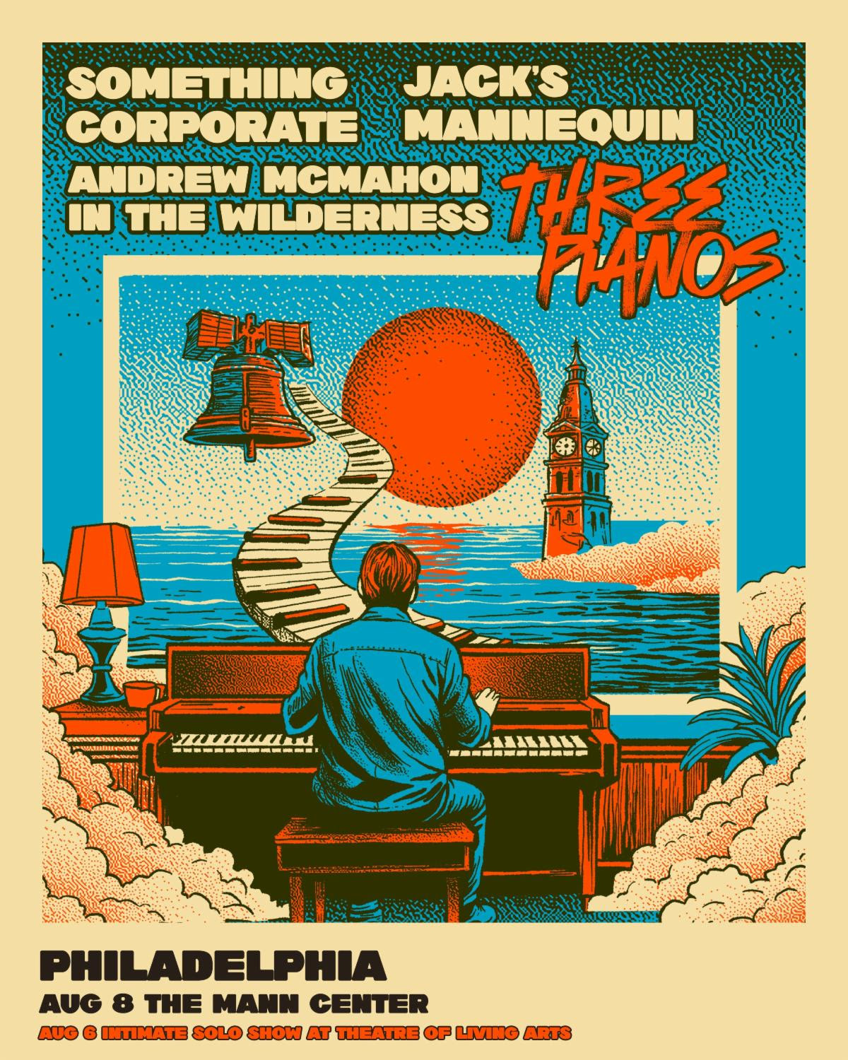 The unique production, titled “Three Pianos: An Evening with Something Corporate, Jack’s Mannequin, and Andrew McMahon in the Wilderness,” will stop in Philadelphia on August 8, Chicago on August 14, and Long Beach, California on August 22. Each night brings together all three eras of McMahon’s catalog — Something Corporate, Jack’s Mannequin, and Andrew McMahon in the Wilderness — performed on three different pianos that represent distinct chapters of his life and songwriting journey.