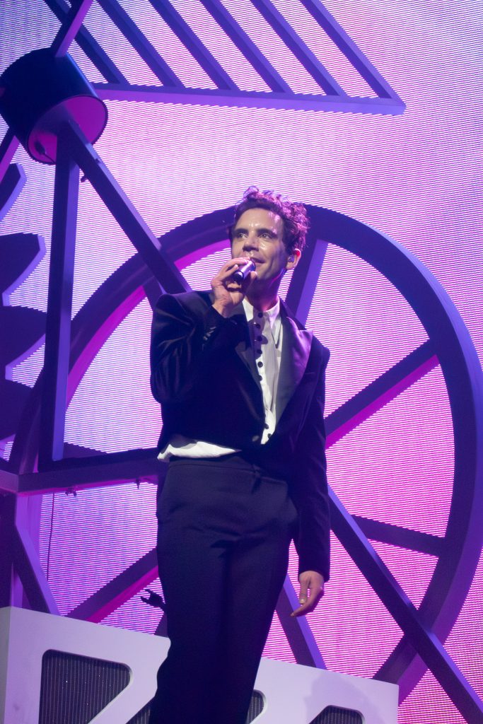 The concert moves between Hyperlove tracks and his iconic songs such as “We Are Golden” and “Big Girl (You Are Beautiful).” During this song, Mika goes into the audience, walking through the stands and the pit, which he playfully calls the “Enfants Terribles of Hell,” while the stands represent Paradise.