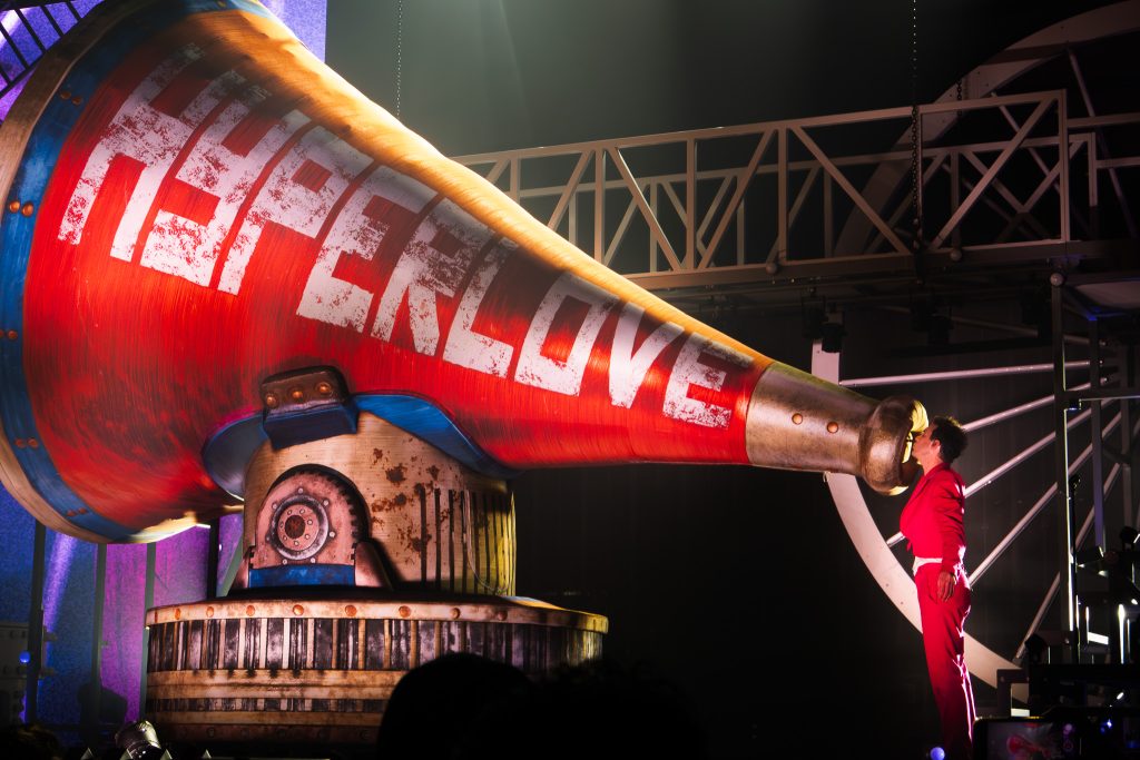 The scenography is incredible: a giant megaphone/cannon with “Hyperlove” written in bold letters appears on stage. Then a rain of confetti fills the Accor Arena.