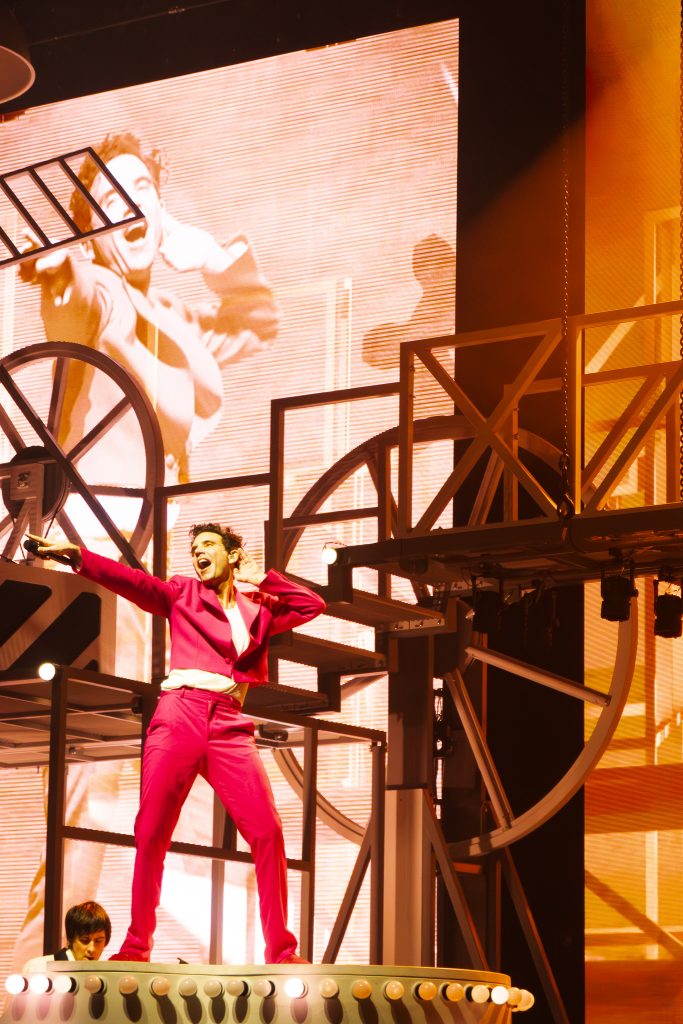 L’entrée en scène est spectaculaire.Mika apparaît dans une immense roue mécanique, qui rappelle l’univers de Charlie Chaplin et son film Les Temps Modernes. Nous sommes directement plongés dans un décor de cinéma muet, entre poésie industrielle et esthétique futuriste.
