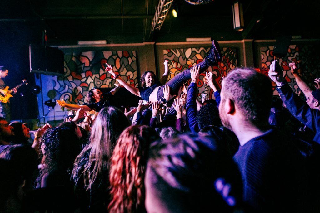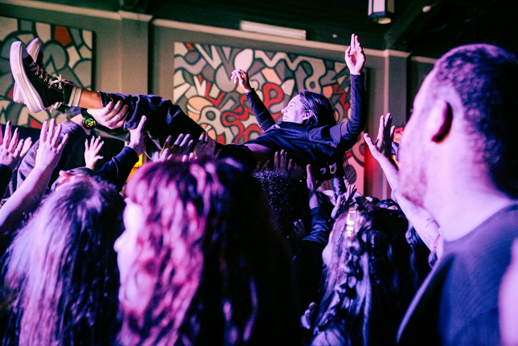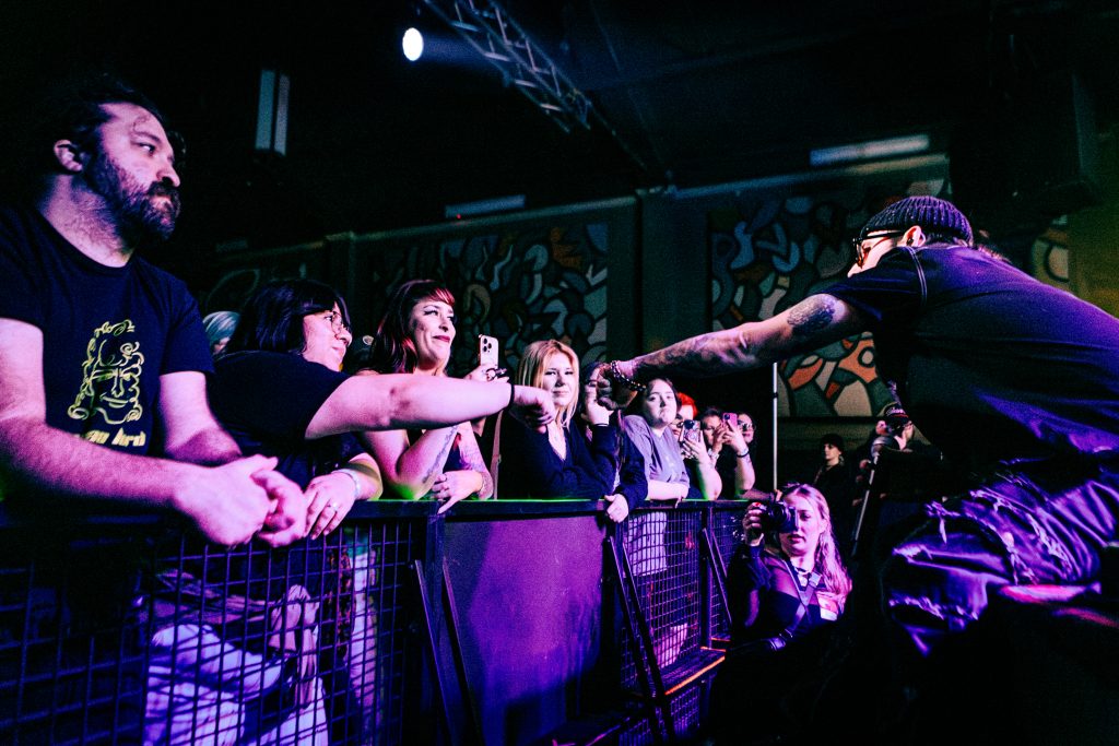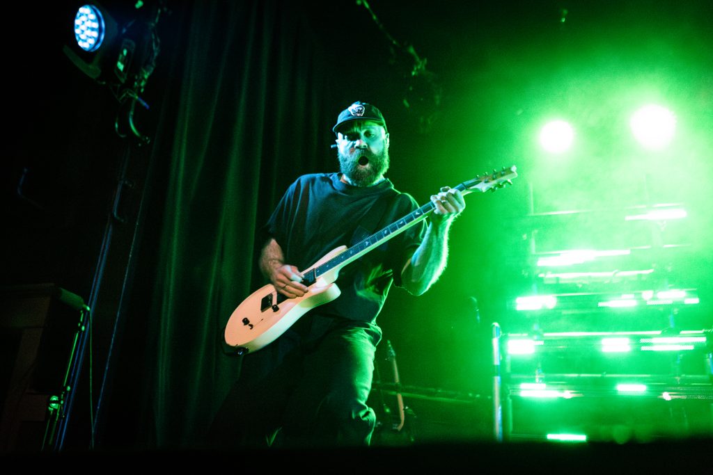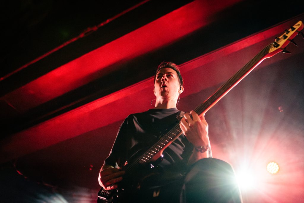 By the time Don Broco took to the stage, the crowd was hyped. Don Broco opened their set with the catchy metalcore-inspired track “Cellophane,” the first single released from their upcoming album. Vocalist Rob Damiani sported a shirt with his name emblazoned above portraits of himself at various stages of his career and kicked his knees up as he jumped around the stage. Don Broco saw their first crowd surfer of the evening by their third song, “Come Out to LA” from their 2018 album Technology. From then on, it was a steady flow of crowd surfers, with the show progressively seeing more bodies over the barricade until the last song of their main set, when Damiani called for more crowd surfers than we’d seen the entire evening. The crowd complied and sent a larger wave of surfers for the final song of the main set, “Everybody” from Technology.