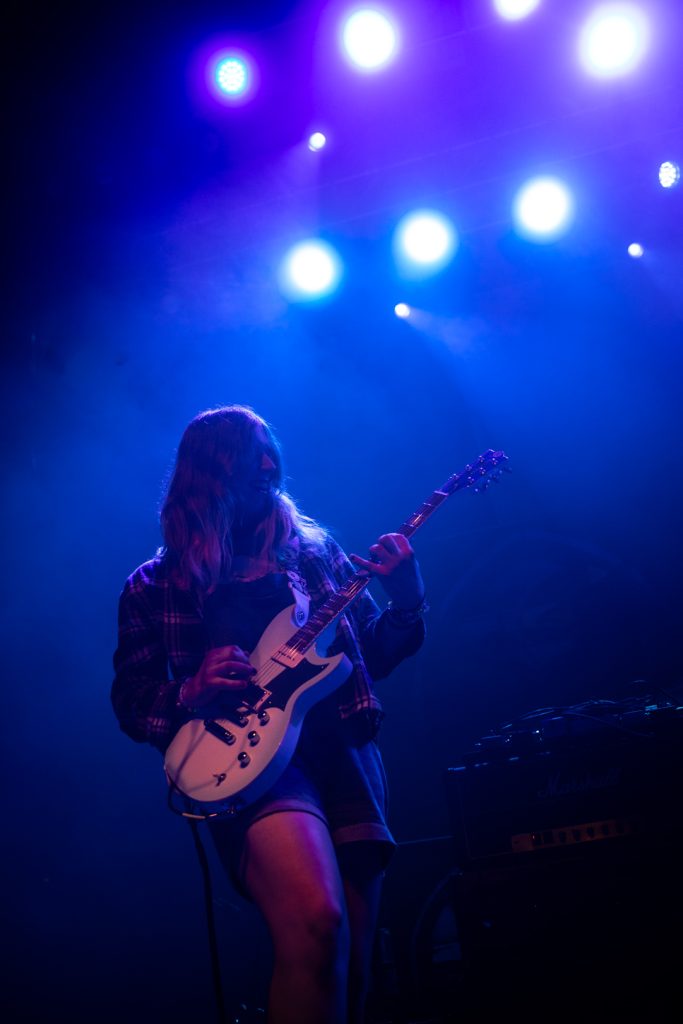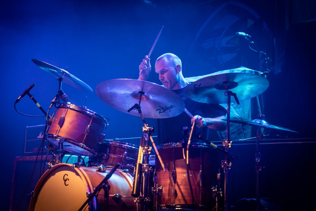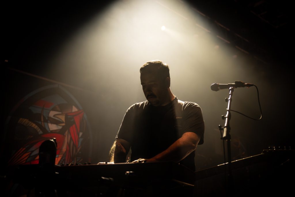 The stage setup resembled stained glass constructed in the style of No Closer To Heaven‘s artwork, and the excellent lighting really showcased the genius behind the stained glass set design. Panels resembling cathedral windows framed the stage, glowing under carefully crafted lighting that shifted colors throughout the set. It felt almost as if the album artwork had come to life.