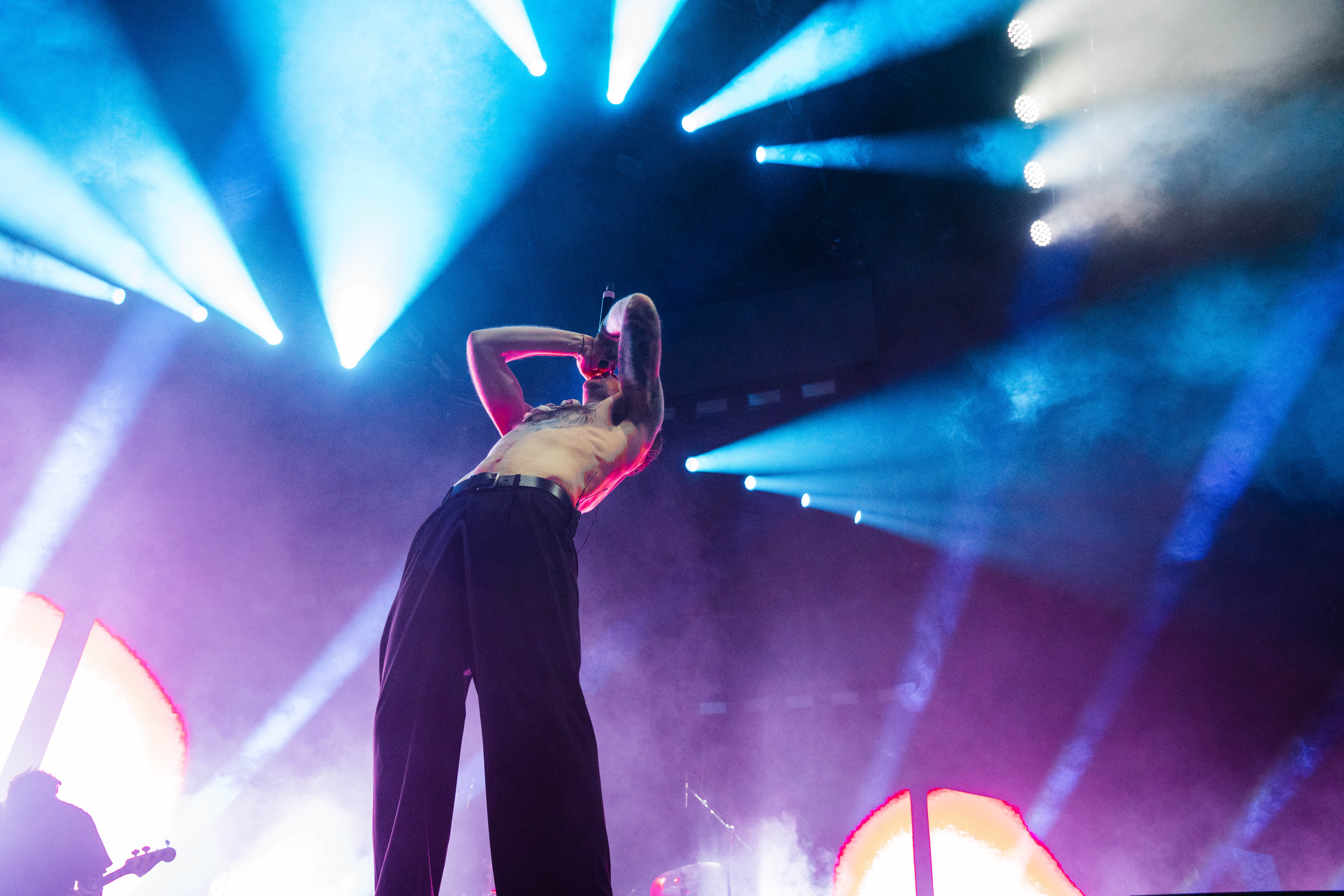 President opened the show to a full crowd, already locked in and singing along to every song. They carried themselves with confidence and had the most cinematic stage presence, making it hard to believe this was their first tour. The stage itself was massive, but The President stood behind his podium, pacing back in fourth like it was a true inauguration. This podium had their logo on it as well, a neon purple cross with two horizontal lines. It added a very dramatic focal point and helped set the tone for an already emotional and heavy performance.
